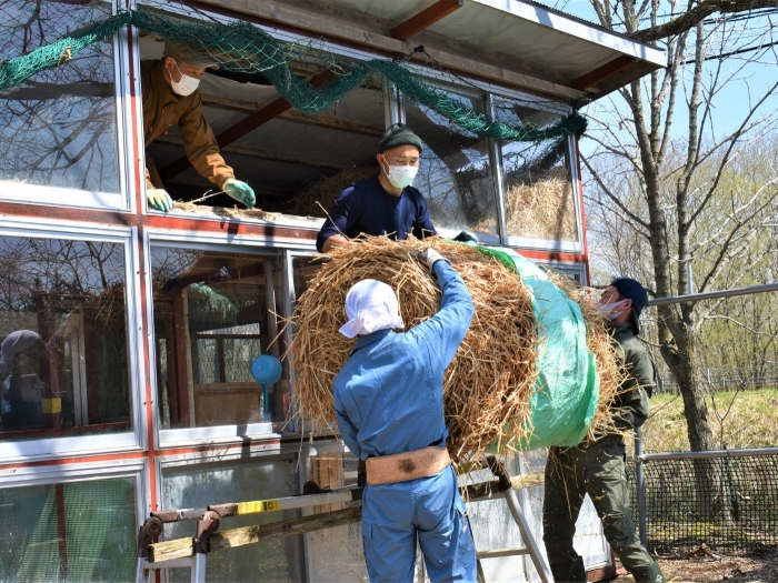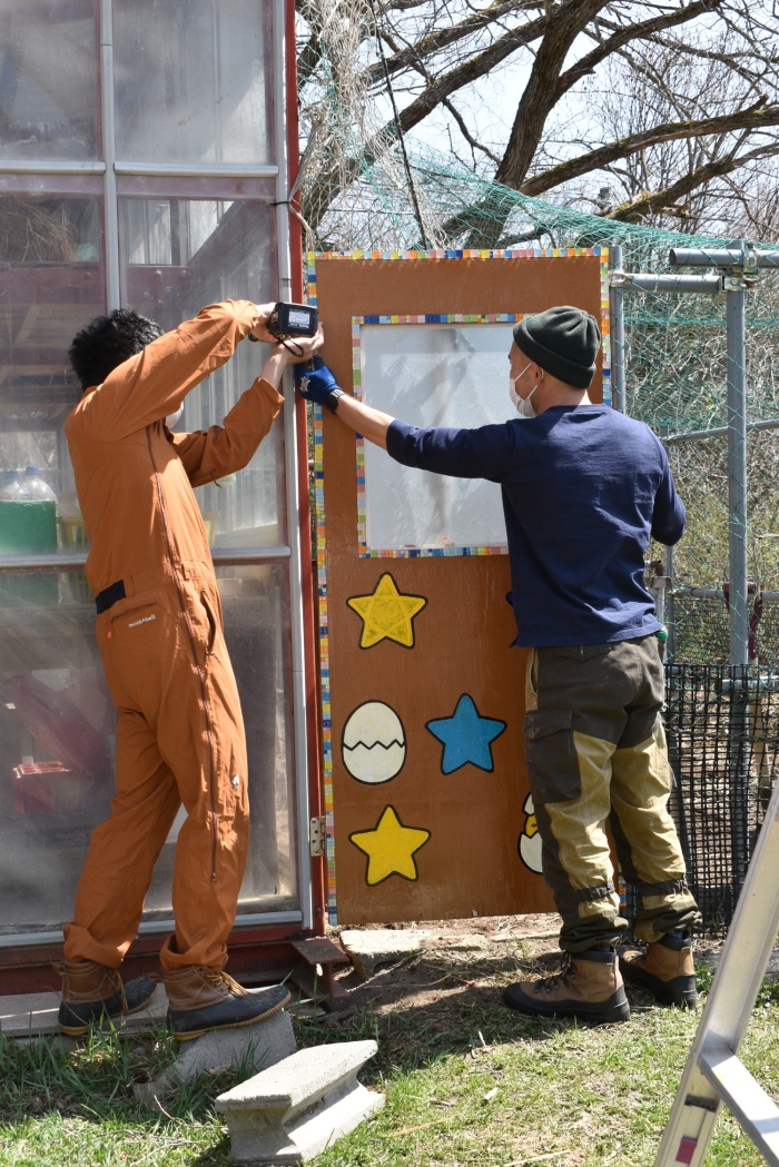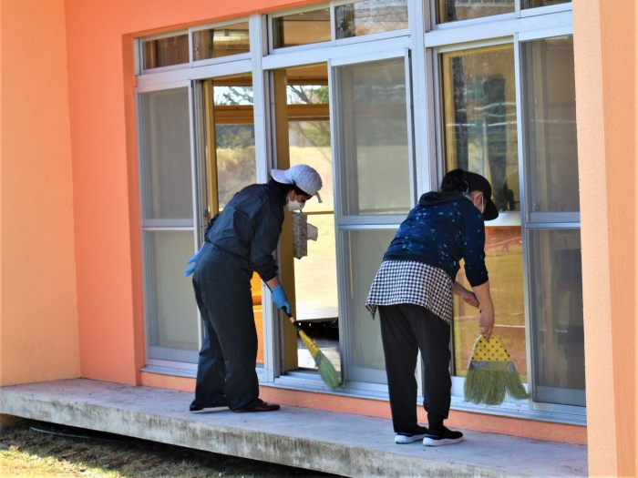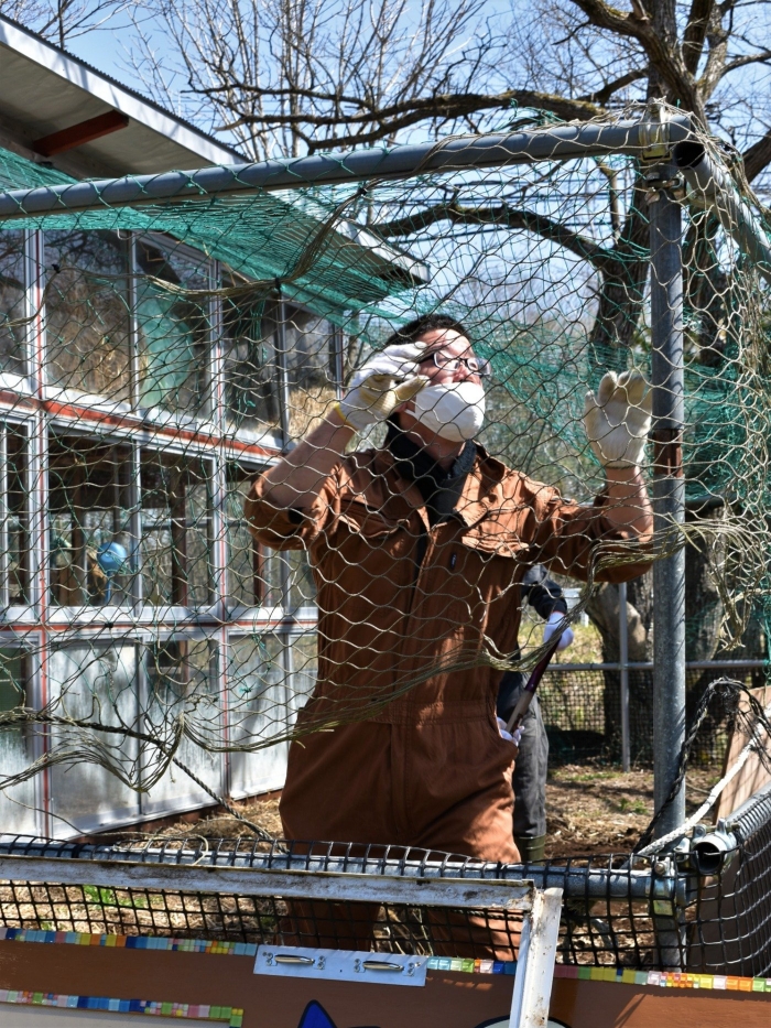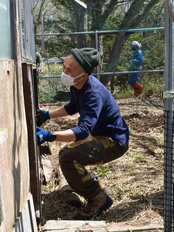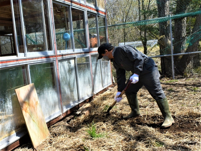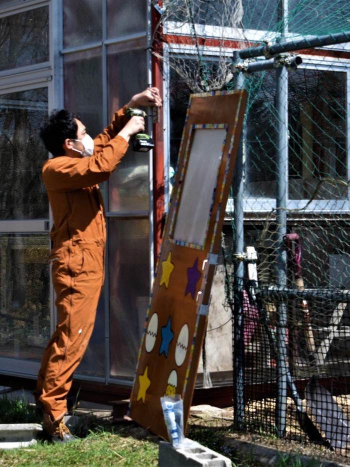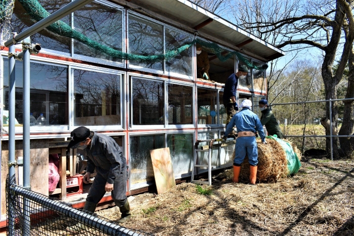 定時より早めに来園して下さる方も多く,今年度は取り止めにしていた園舎内の窓・蛍光管拭きを自主的に行って下さるお母様方の姿が…。その後,わくわくジャングルやグランドの枝拾いも行っていただきました。お父様方には,動物小屋の破損扉・窓取り換え,牧草ロール搬入,外網設置,ハウスのビニール取付,土起こし,わくわくジャングルの渡り網撤去を行っていただきました。老朽化した園環境を蘇らせていただいたり,活動がスタートできるように整備していただけたことで,より安心,安全,のびのびと保育を行うことができます。心より御礼申し上げます。