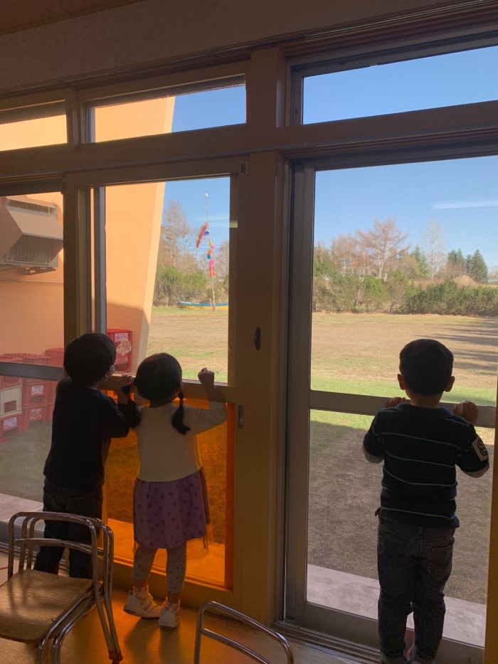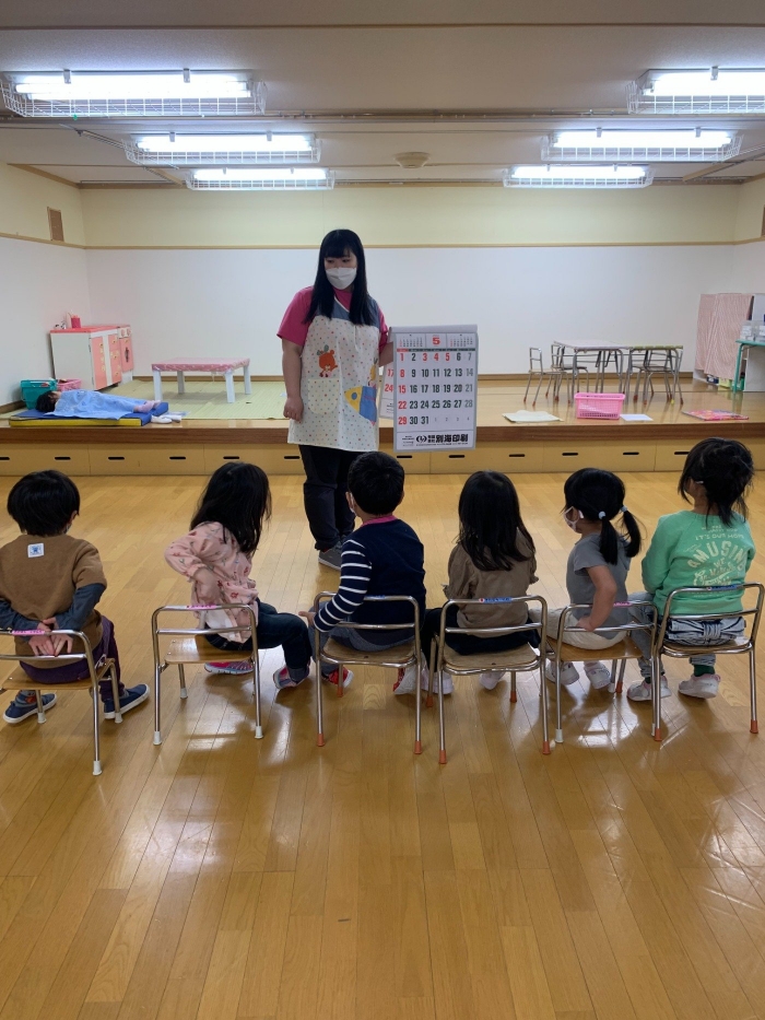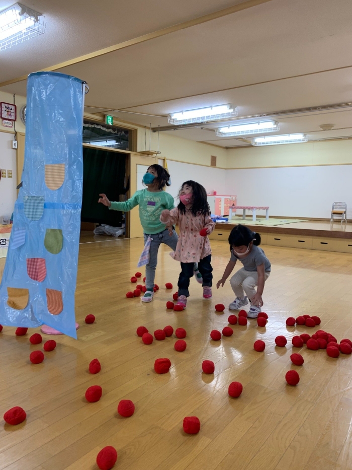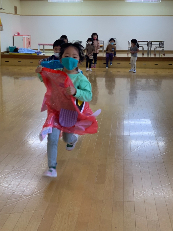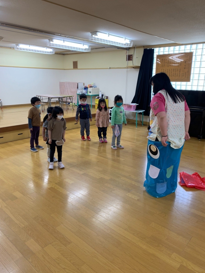 園児たちは,もうすぐで端午の節句ということで『こどもの日の集い』を行いました。こどもの日にちなんだ絵本・クイズや,鯉のぼりリレー,鯉のぼり玉入れといったゲームで大盛り上がりでした。給食後には,柏餅やペコ餅も味わい,大満足の子ども達でした。