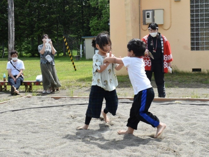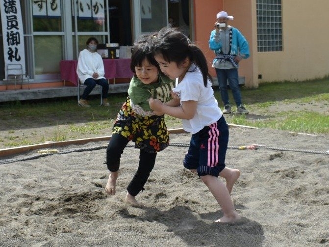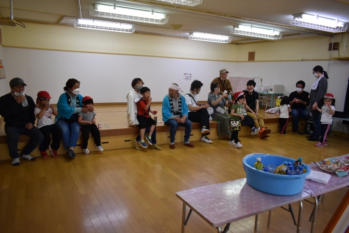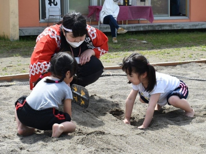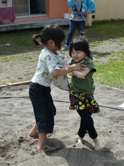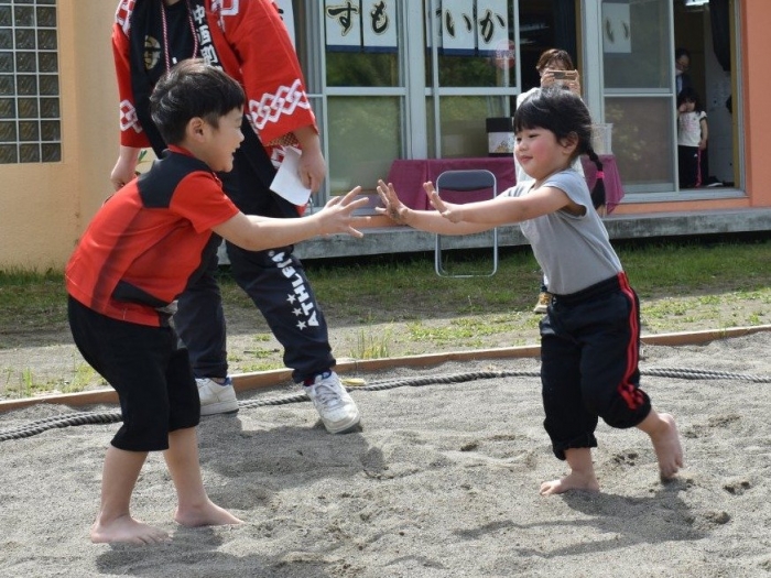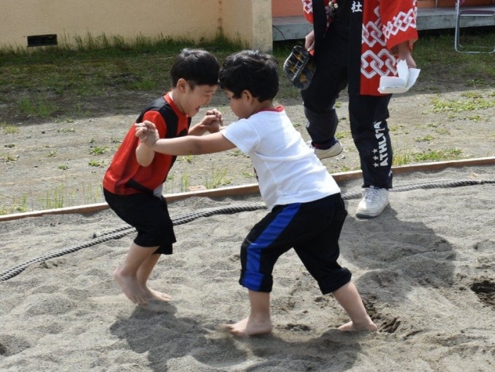 パレード後は,ジュース・お菓子で元気をチャージし,幼稚園で相撲大会を開催☆彡 お父さん・お母さんの声援を受け,緊張しながらも挑む姿,全力を出し切る取組,素晴らしい礼を見せていました。緊張感や悔し涙も,きっといい経験になることでしょう。お祭りに向けての活動から 本祭りパレード,相撲大会にと,園児を支えてくださったPTA役員の方,保護者の皆様に,心より御礼申し上げます。