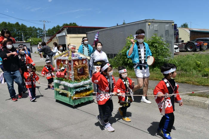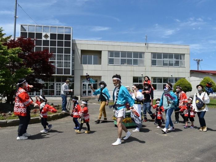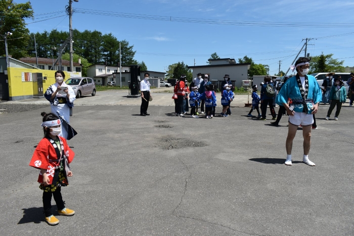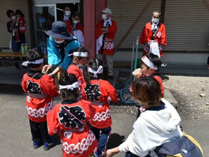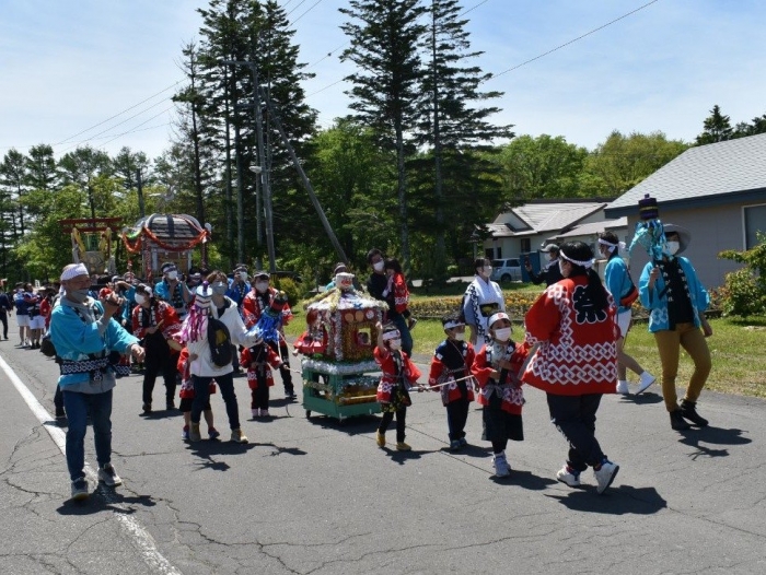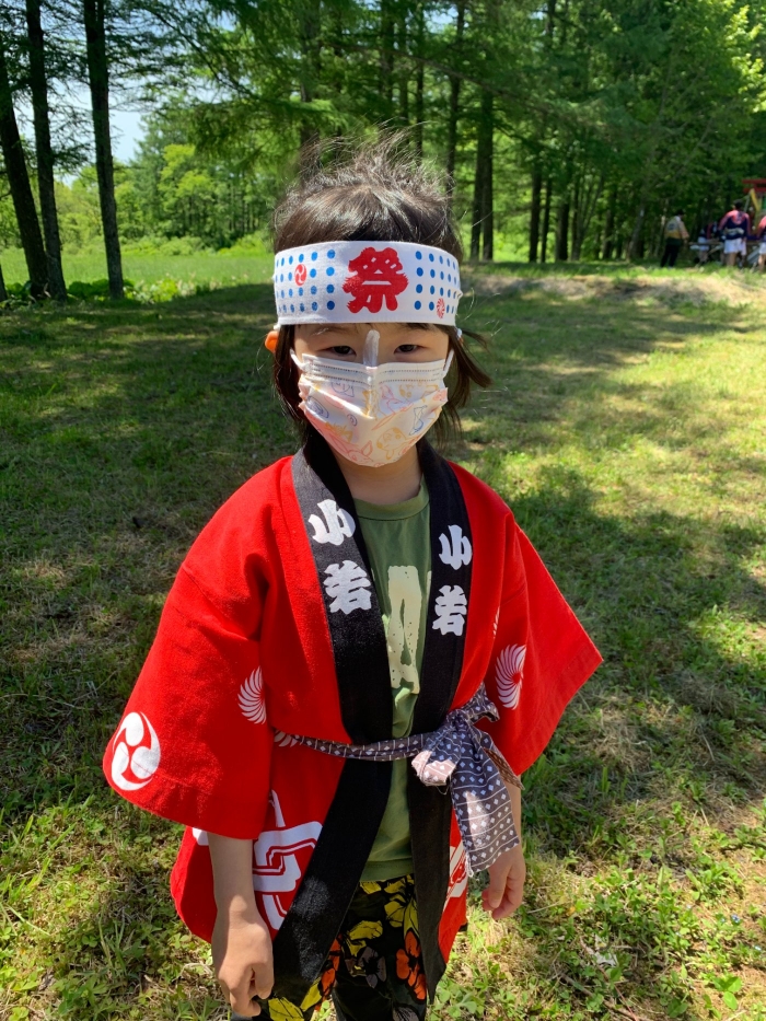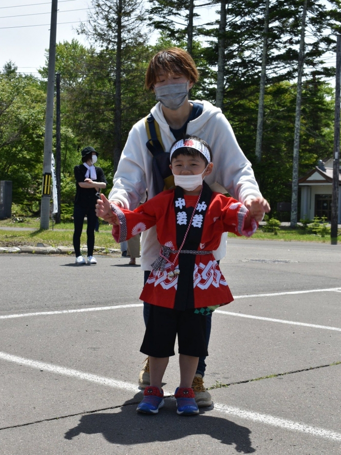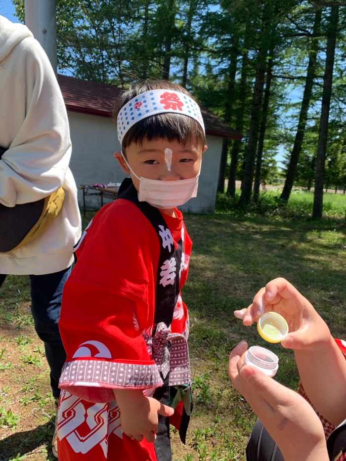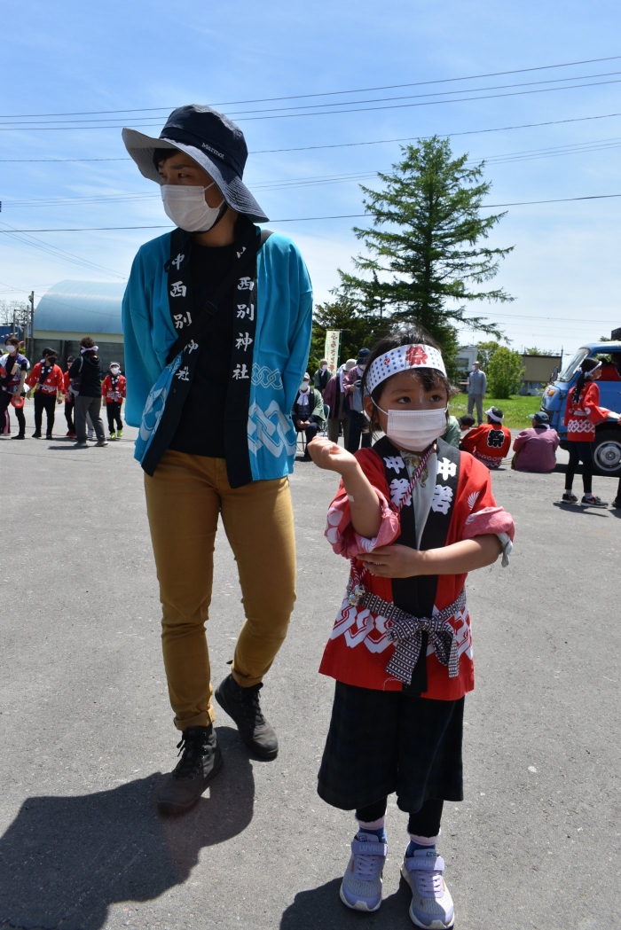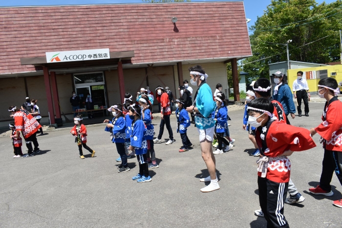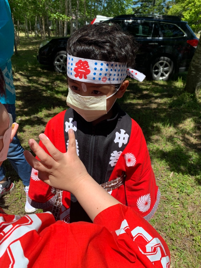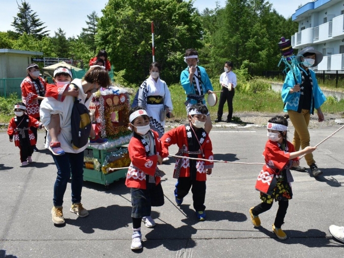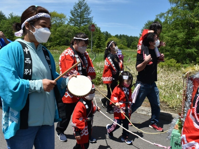 澄み渡る青空の下,待ちに待った地域の伝統行事『中西別ふるさと祭り』が開催されました。幼小合同運動会以上の人出で,普段は少人数で活動していることもあり,その雰囲気に圧倒されていましたが,休憩処でのリンゴジュースパワーで元気復活☆彡 獅子や天狗に顔が青ざめる子もいましたが(笑) お父さん・お母さんの盛り上げにより,緊張も暑さも撥ね退け,最後まで練り歩くことができました。