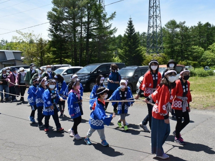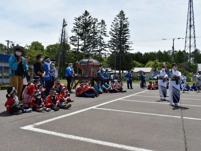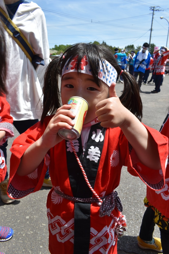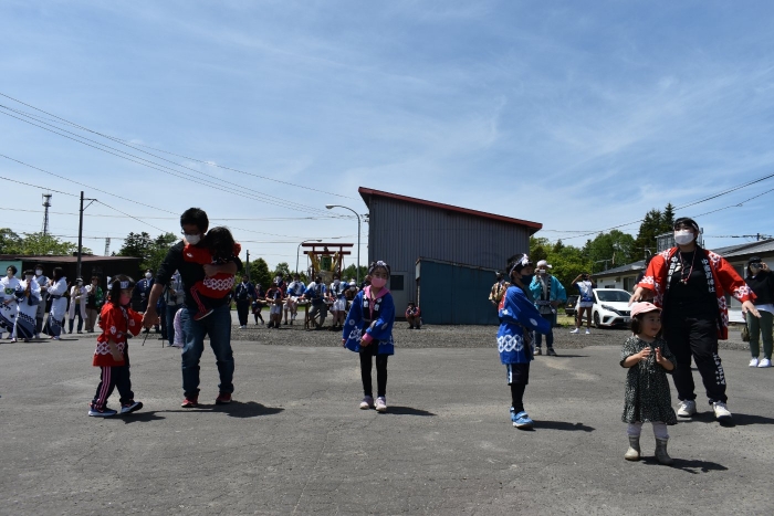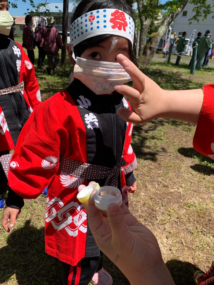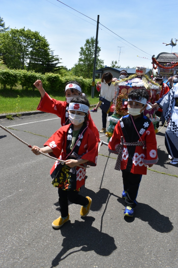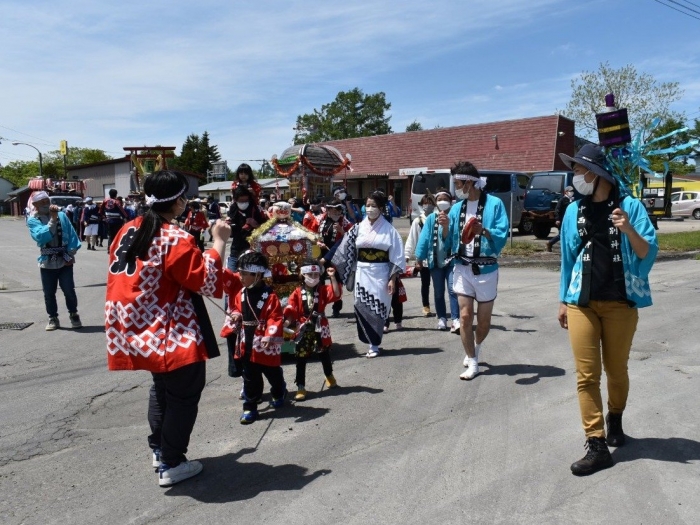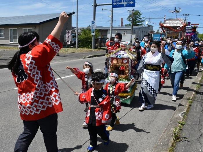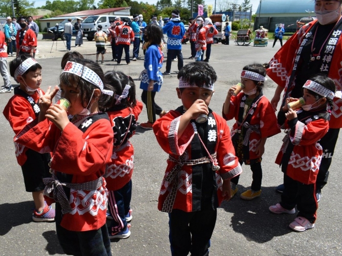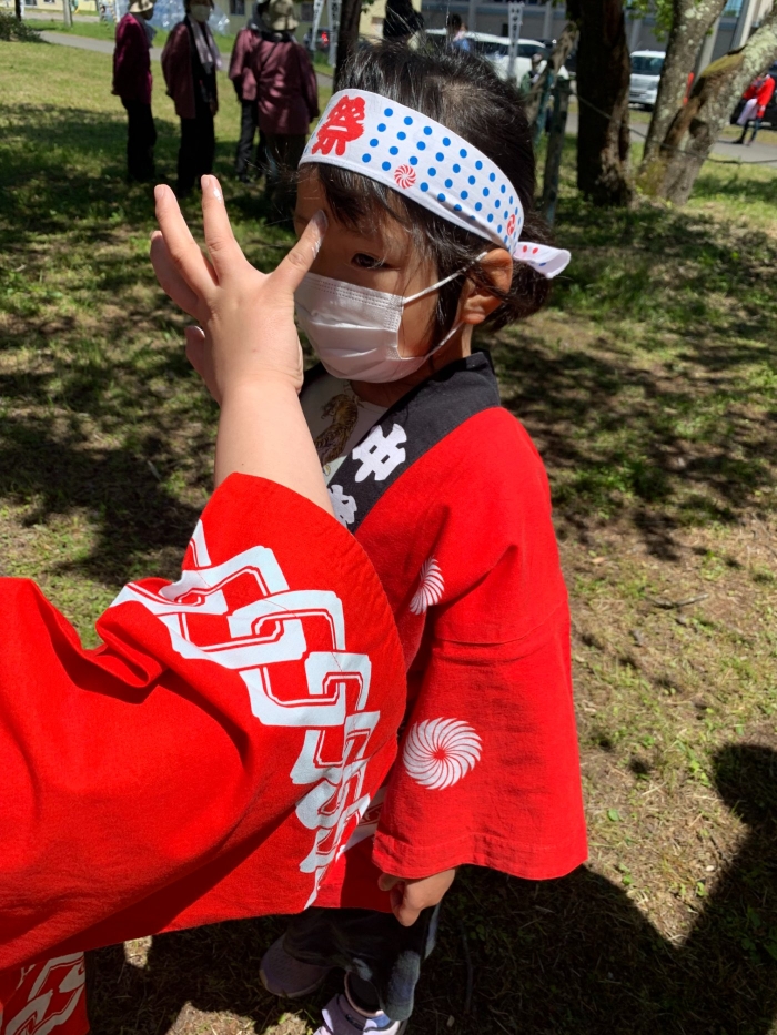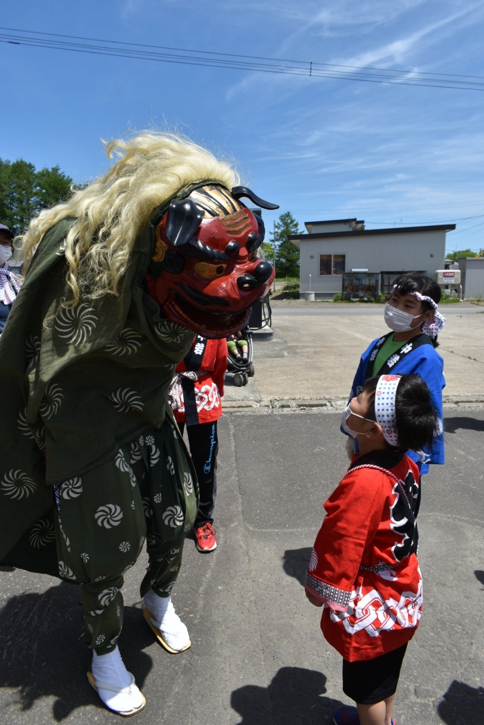 澄み渡る青空の下,待ちに待った地域の伝統行事『中西別ふるさと祭り』が開催されました。幼小合同運動会以上の人出で,普段は少人数で活動していることもあり,その雰囲気に圧倒されていましたが,休憩処でのリンゴジュースパワーで元気復活☆彡 獅子や天狗に顔が青ざめる子もいましたが(笑) お父さん・お母さんの盛り上げにより,緊張も暑さも撥ね退け,最後まで練り歩くことができました。