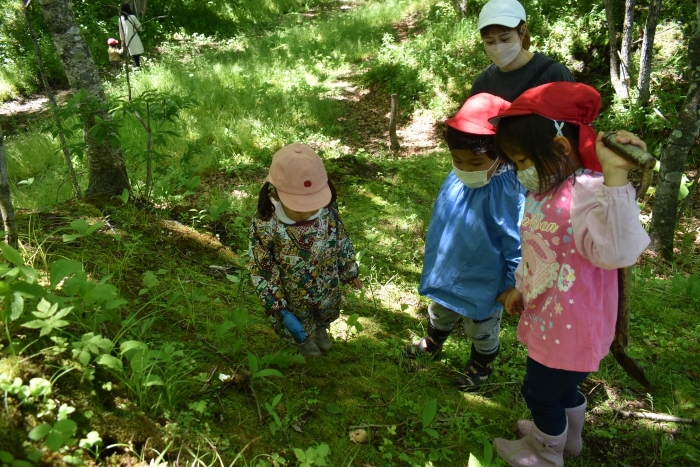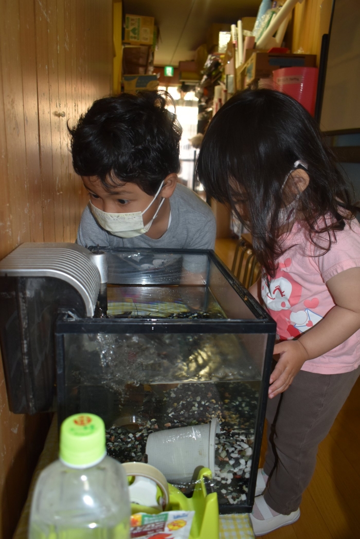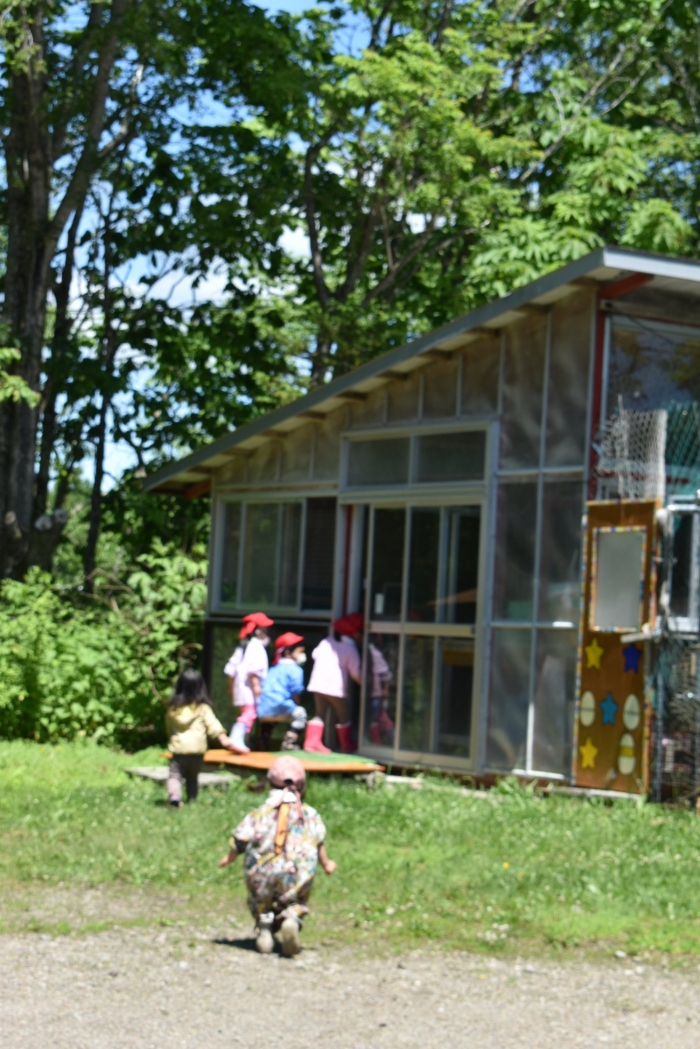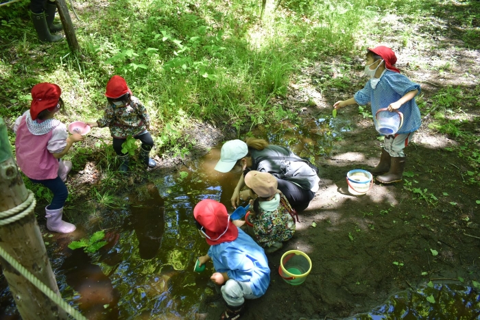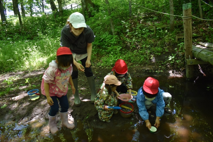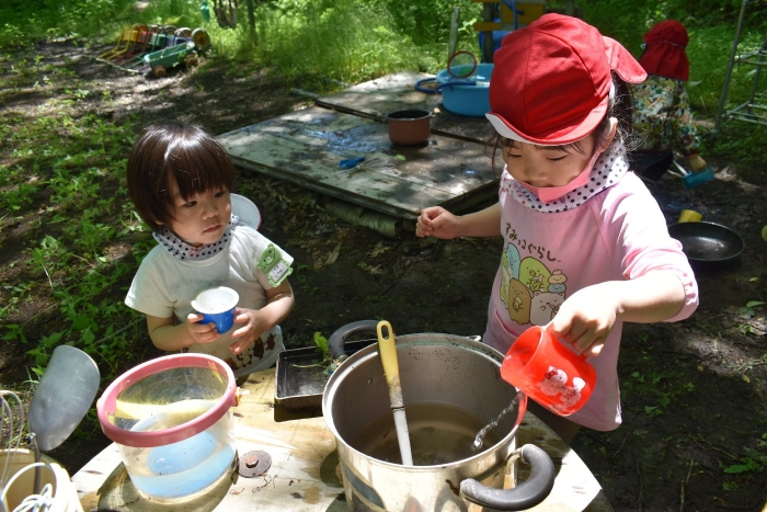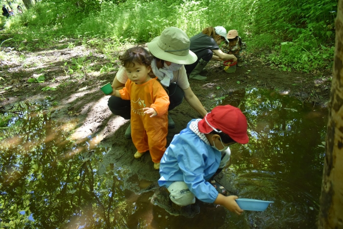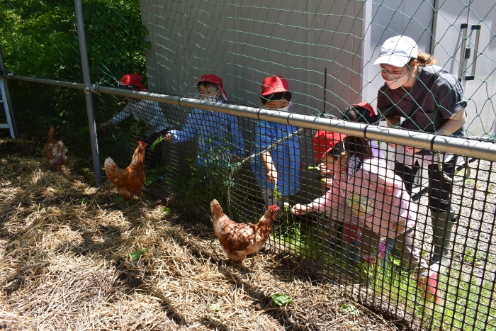 朝の介会後は,ぴよぴよさんと一緒に戸外遊びを楽しみました。水溜まりやわくわくジャングルの川をジャブジャブ,起伏の激しい道をズンズン進んだり,園児と一緒にオタマジャクシを捕まえ,真似をして料理作りを楽しんだり,飼育しているニワトリと触れ合ったりと,物怖じせずにのびのび遊ぶぴよぴよさん。もの・ことへの興味・関心・意欲が高いなと感じました☆彡