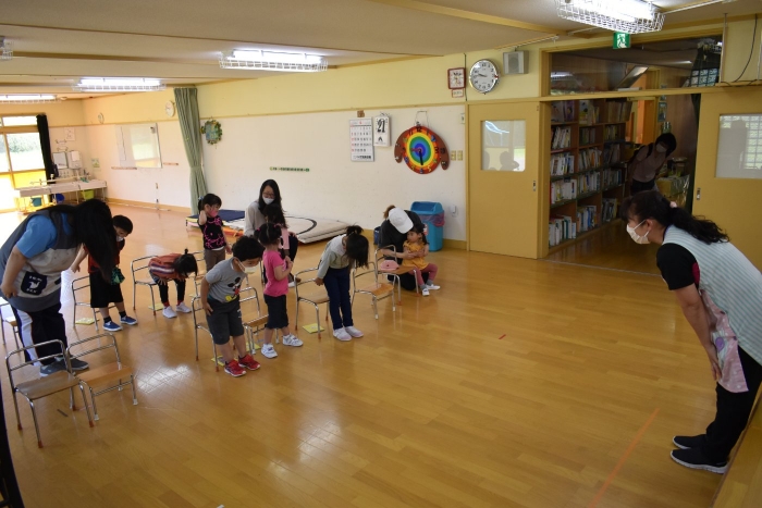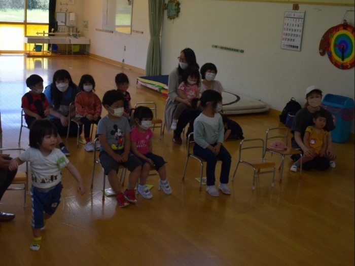 本年度の未就園児園開放『ぴよぴよクラブ』が始動! 時節柄お忙しい中,4組の未就園児親子が来園してくださいました。 ぴよぴよさんと一緒に遊ぶことができる♫と,この日を楽しみにしていた年中児! 関わりをもとうと声を掛けたり,親愛のスキンシップを求めたりしていました。 年少児は,初めての活動にドキドキしながらも先生を介して関わり,「ぴよぴよさんと遊んで楽しかった」と言っている姿がありました。
