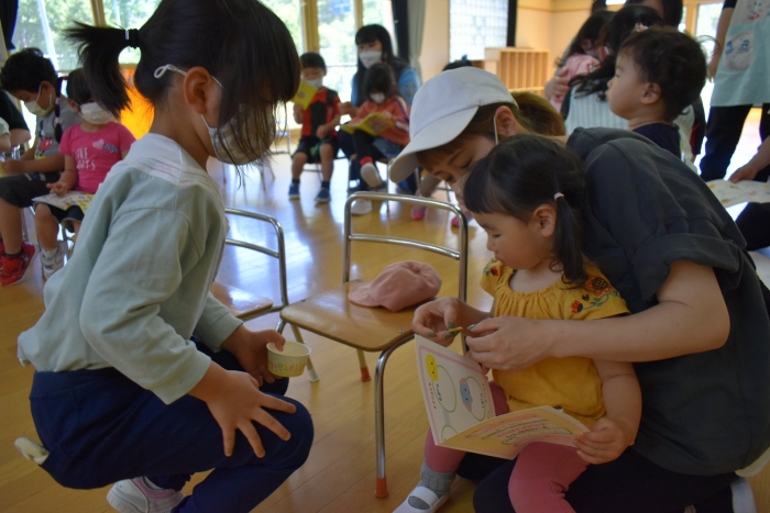 今年度は,ぴよぴよクラブの朝の会を進行する年長組が不在ですが,出席カードにシールを貼ったり,出席カードを集めたりするのを手伝っていた年中児。来年度は,朝の会での先生役として頼れる姿をみせてくれることでしょう。