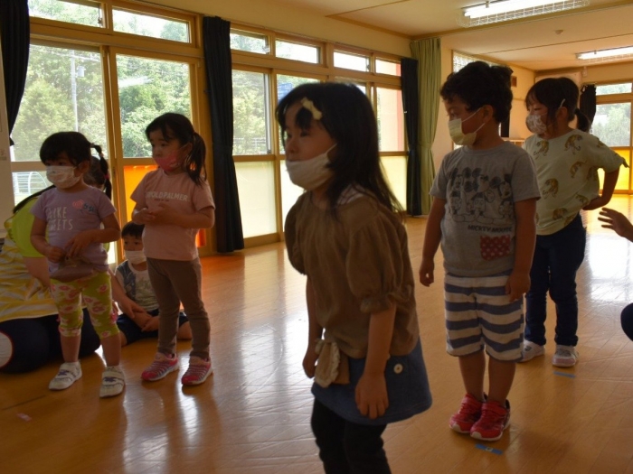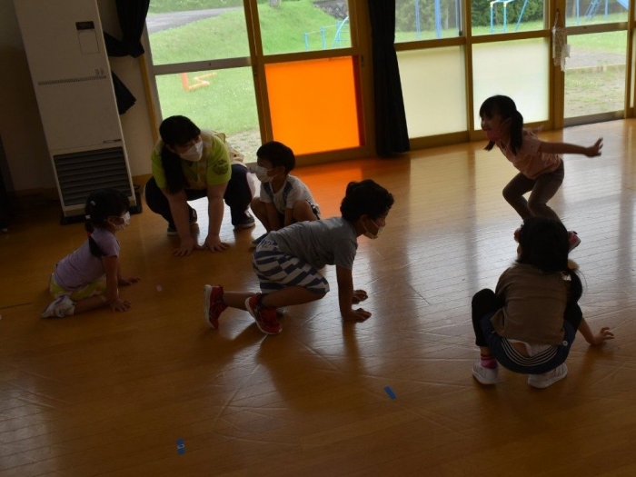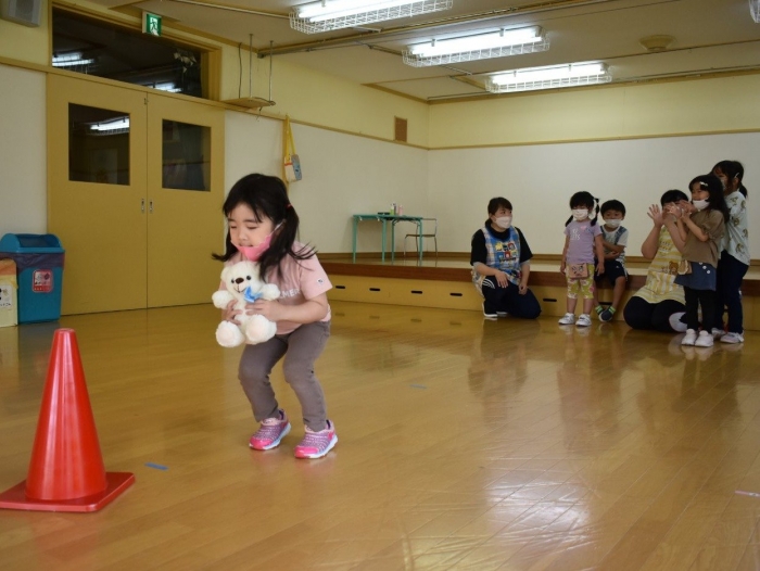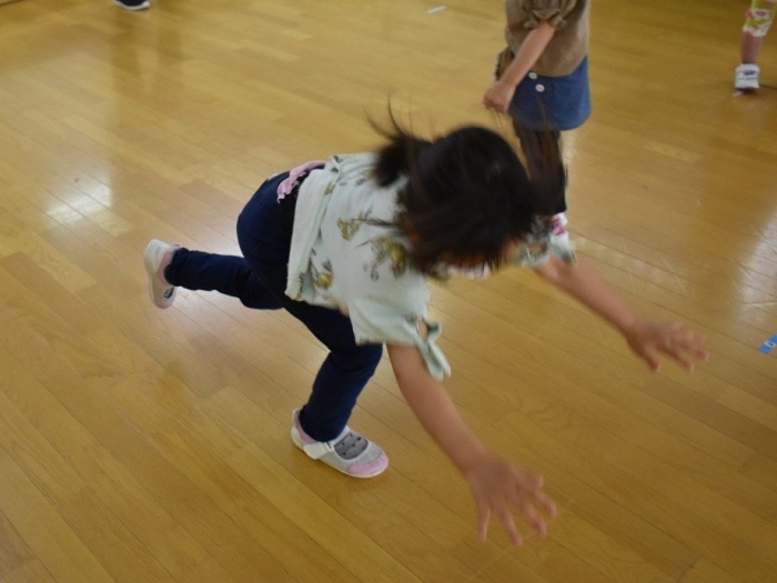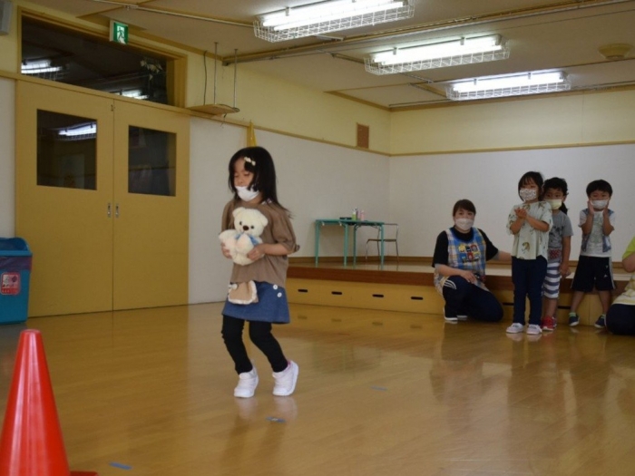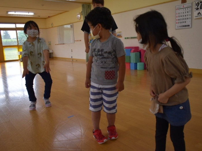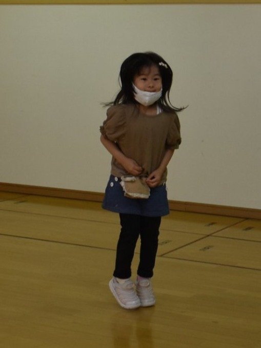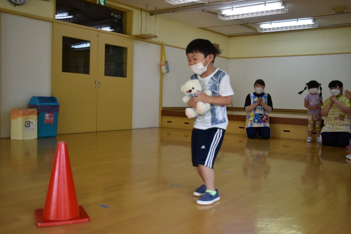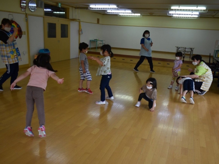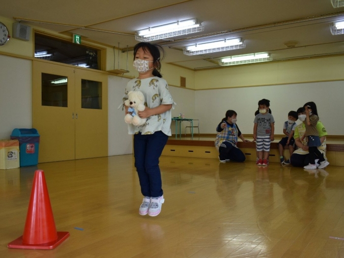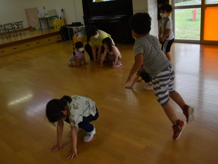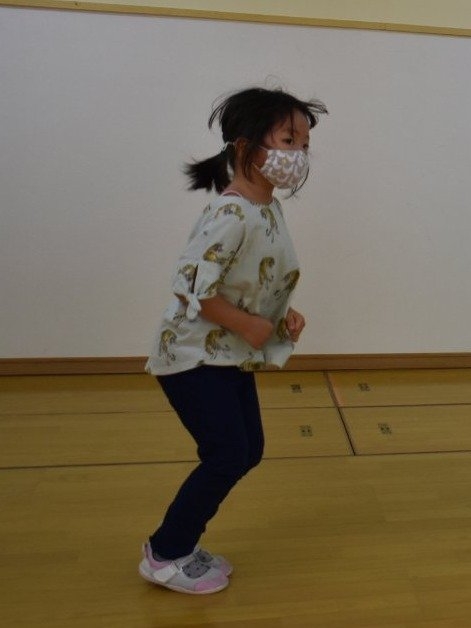 ディズニー体操で体をほぐした後は,『跳ぶ』動物をイメージして跳躍運動を行いました。きっかけとして『ウサギ』を投げ掛け,「他に跳ぶ動物は何だろう?」と問い掛けると,『カエル』『ネコ』『イヌ』『さかな』など,大人の想像を超える答えもありましたが(笑) その動物になり切り跳ぶ動きを楽しんだり,膝の曲げ伸ばし・爪先立ちを意識し,『カンガルー跳びリレー』を行ったりしました。
