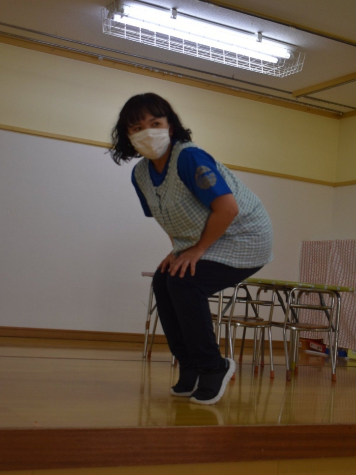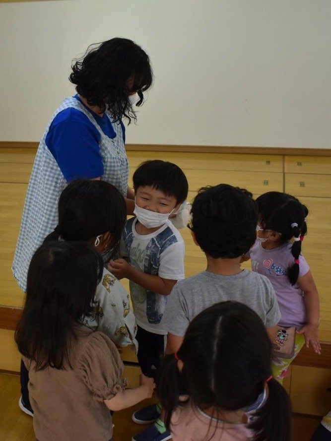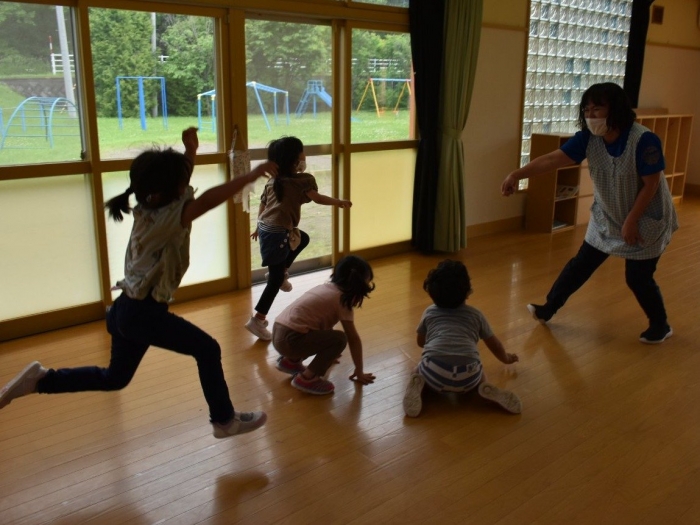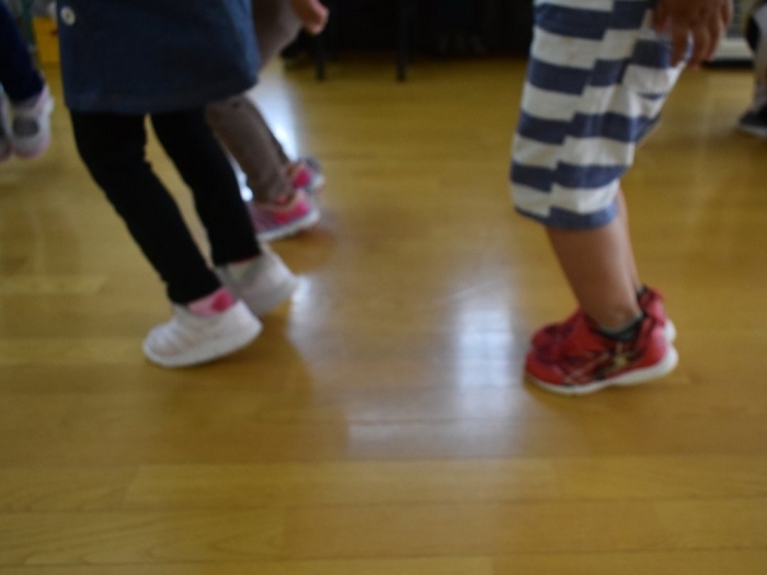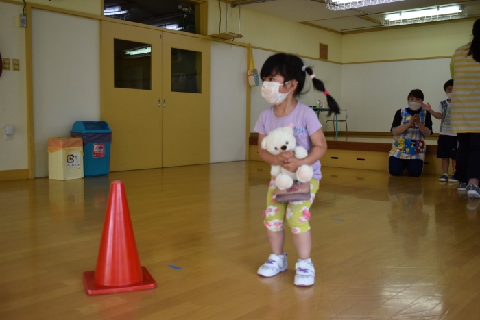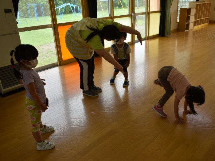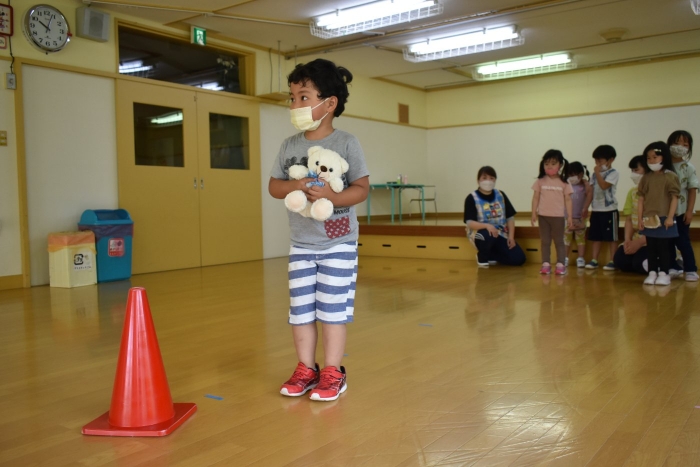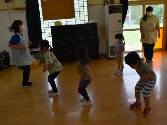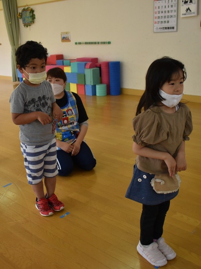 ディズニー体操で体をほぐした後は,『跳ぶ』動物をイメージして跳躍運動を行いました。きっかけとして『ウサギ』を投げ掛け,「他に跳ぶ動物は何だろう?」と問い掛けると,『カエル』『ネコ』『イヌ』『さかな』など,大人の想像を超える答えもありましたが(笑) その動物になり切り跳ぶ動きを楽しんだり,膝の曲げ伸ばし・爪先立ちを意識し,『カンガルー跳びリレー』を行ったりしました。
