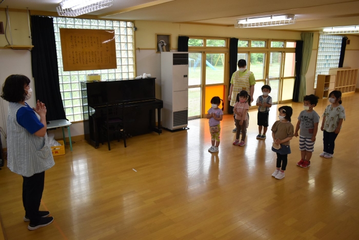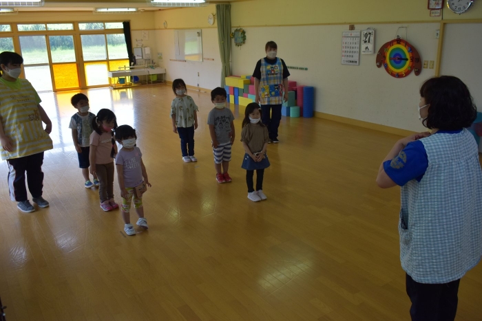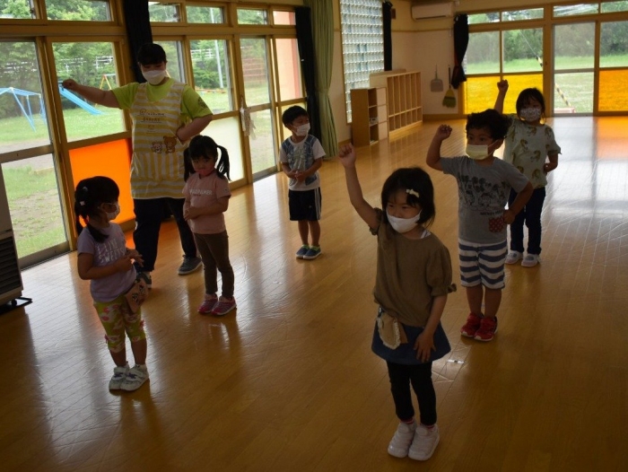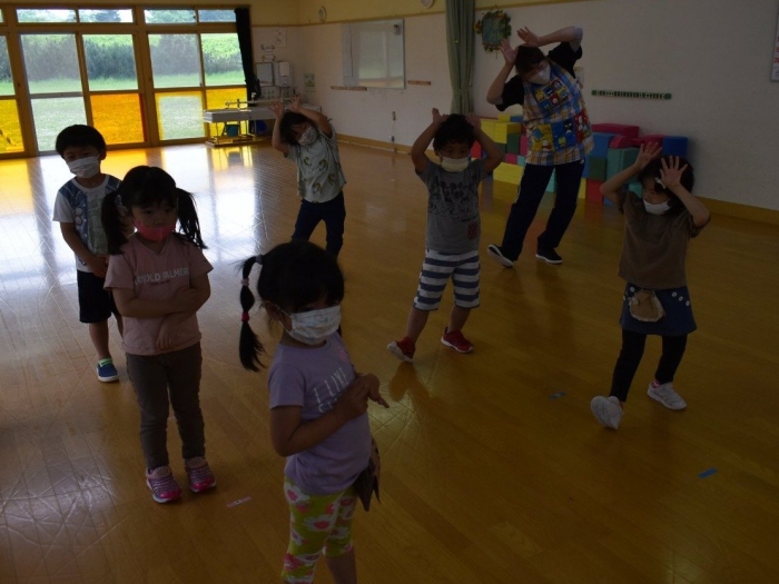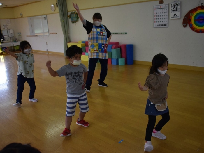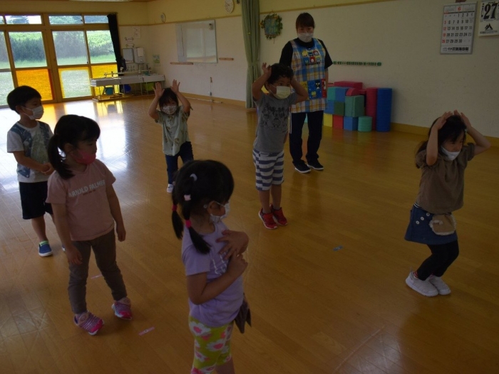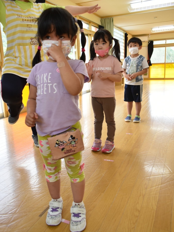今日は,久しぶりに『体で遊ぼう!』を実施しました。今回から,本園伝統の『ディズニー体操』を準備運動として導入! 例年,年長児を代表に幼小合同運動会でディズニー体操を行ってきましたが,年長児が不在ということで今年度は一旦取り止めに。伝統が途絶えないように,『体で遊ぼう』の中で取り入れることにしました。今日は,緊張MAXの年少児でしたが,繰り返しの経験から来年度の運動会では,自信をもって踊れることと思います。