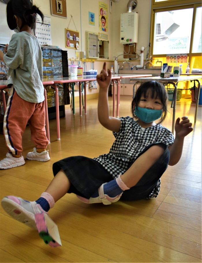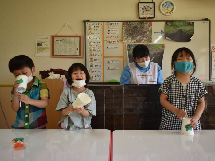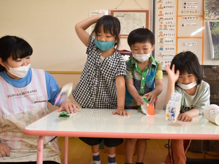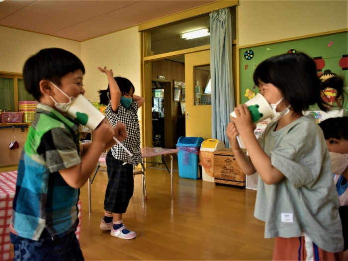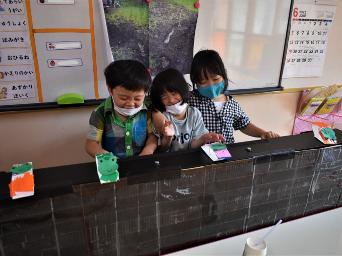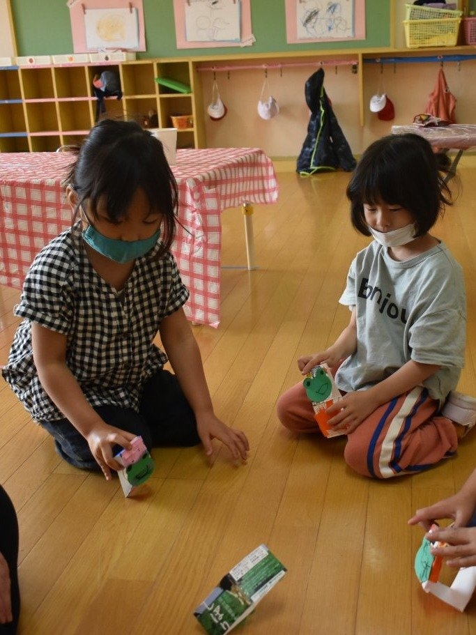 出来上がった後は,みんなで息を合わせて『跳ぶ』タイミングを合わせたり,『カエルの合唱』の曲に合わせ『音を鳴らし』たり,カエルになり切り ♫ゲロゲロ 歌ったりなど,同じものを作った共有感で大盛り上がりの子ども達でした。