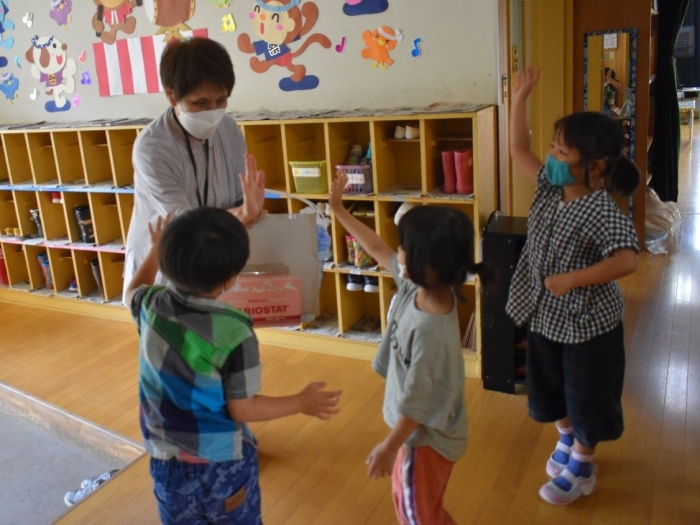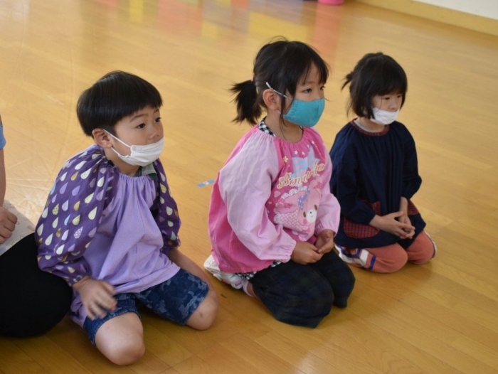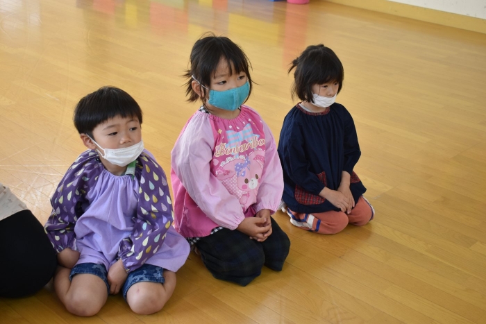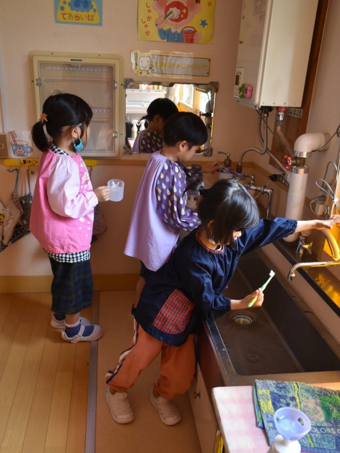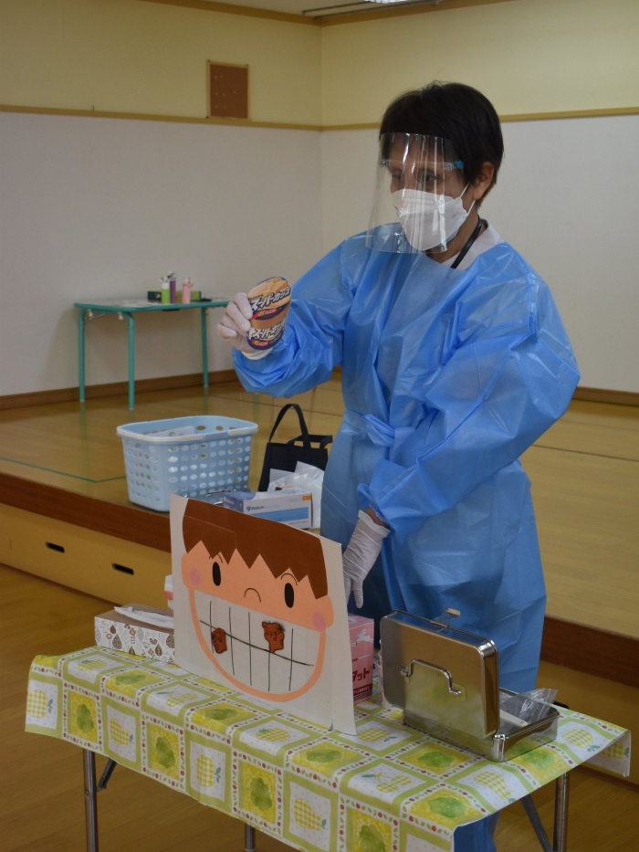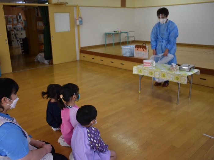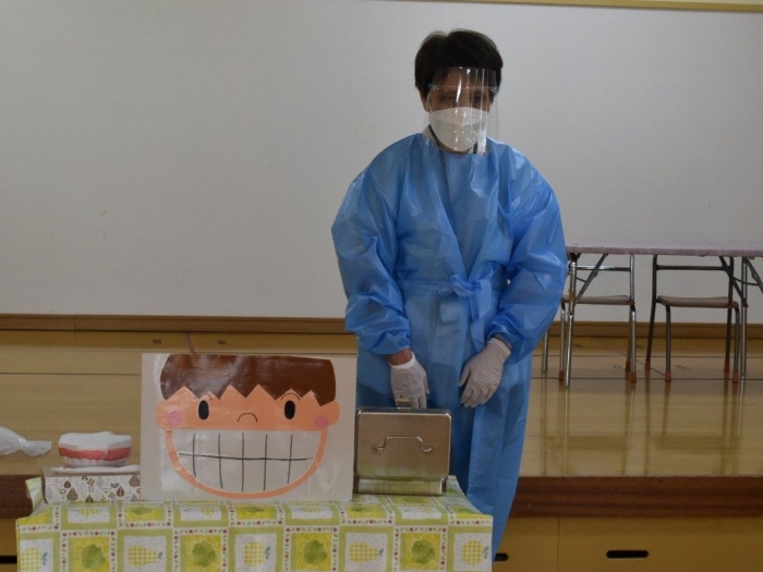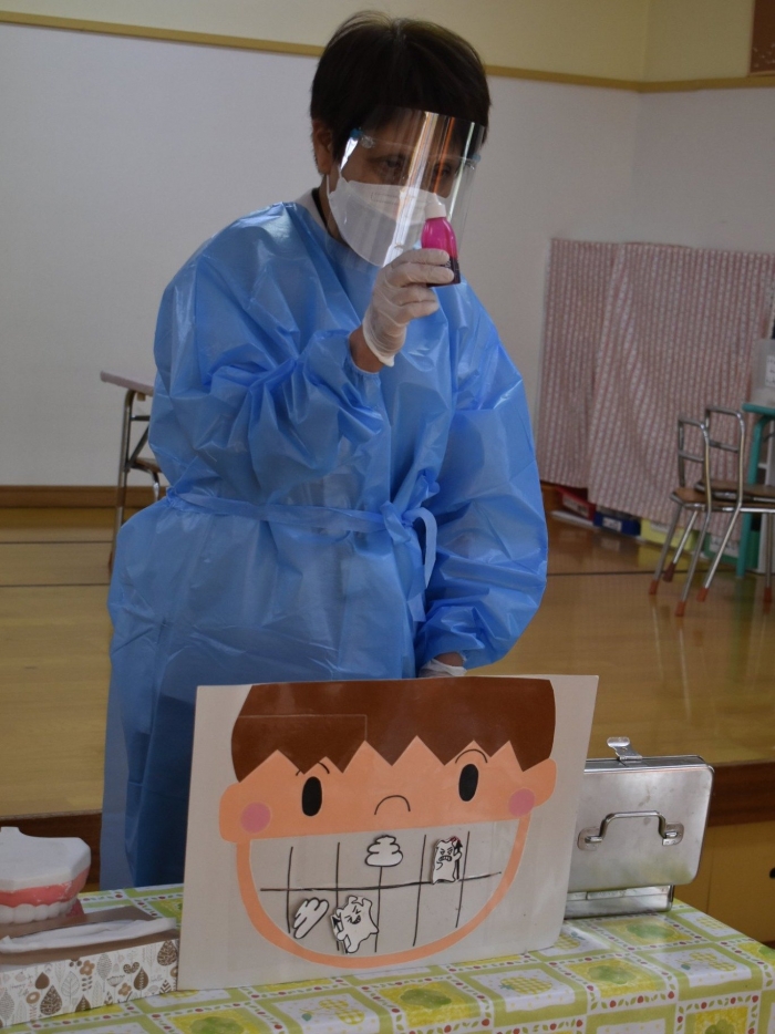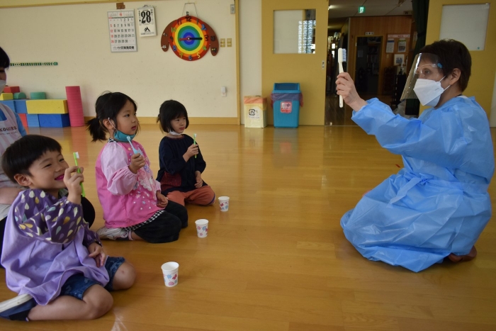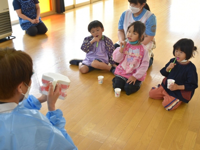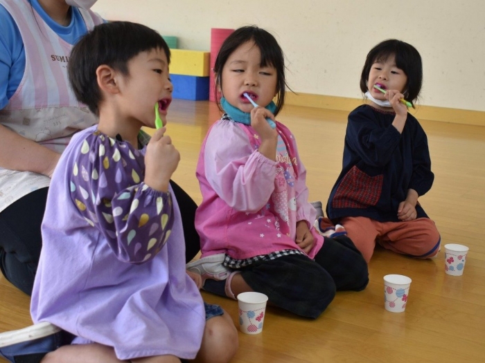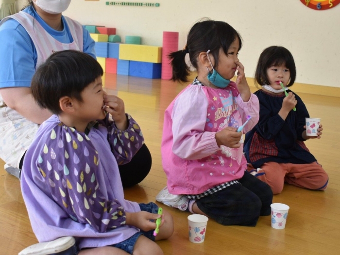 コロナ禍により中止続きであった『歯磨き指導』を,本園では2年振りに実施しました。年少児はもちろん,年中児も初体験となります。