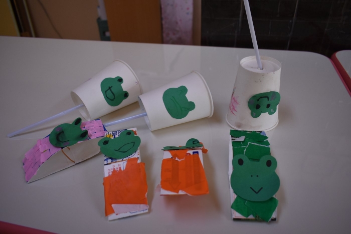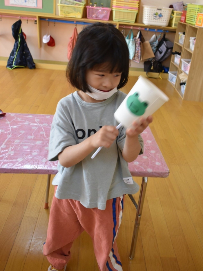 クラス時間では,成長を心待ちにしているのオタマジャクシ,そして,歌でも親しんでいる『カエル』の製作を行いました。 輪ゴムの伸縮性を利用した『ピョンピョン(跳ぶ)ガエル』と,曲がるストローの凹凸を利用した『ゲコゲコ(音が鳴る)ガエル』の2バージョンを作成!