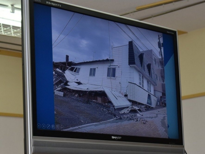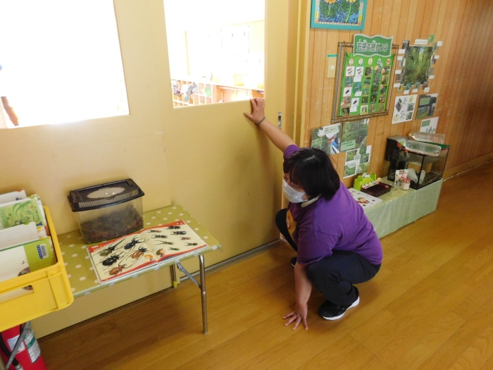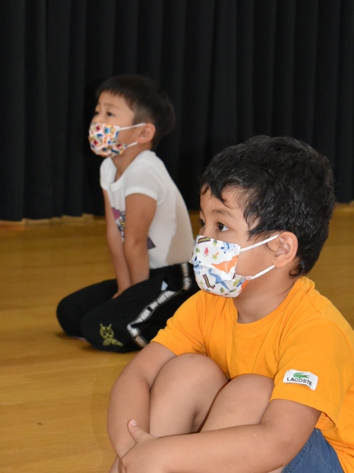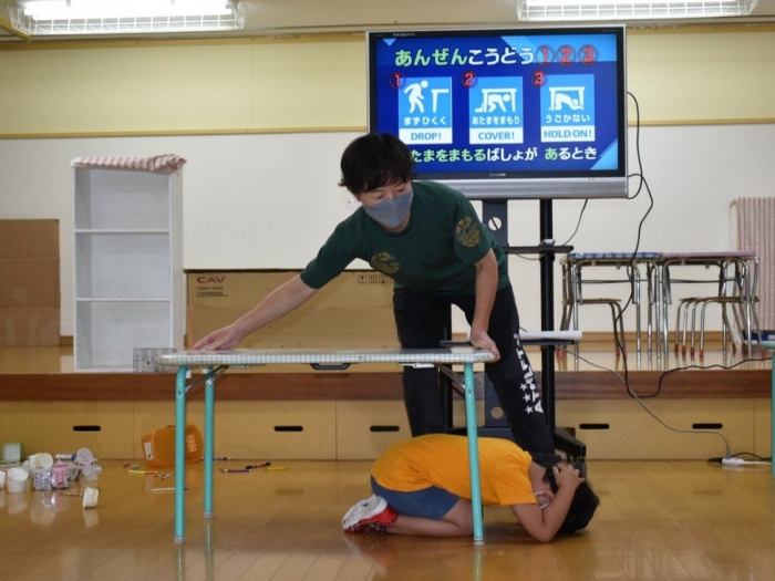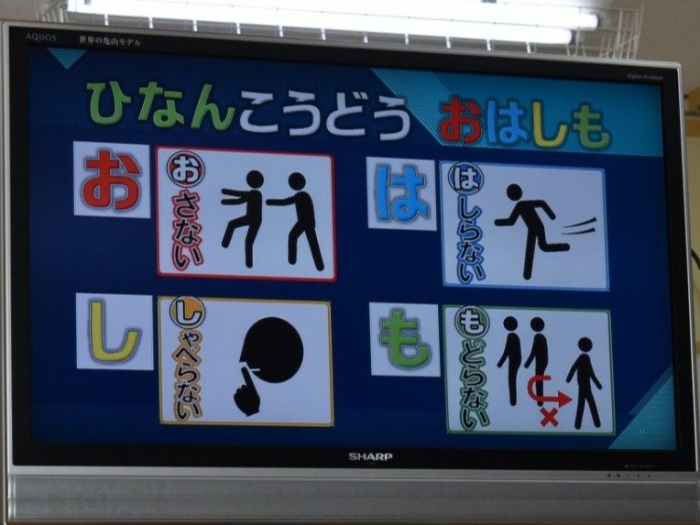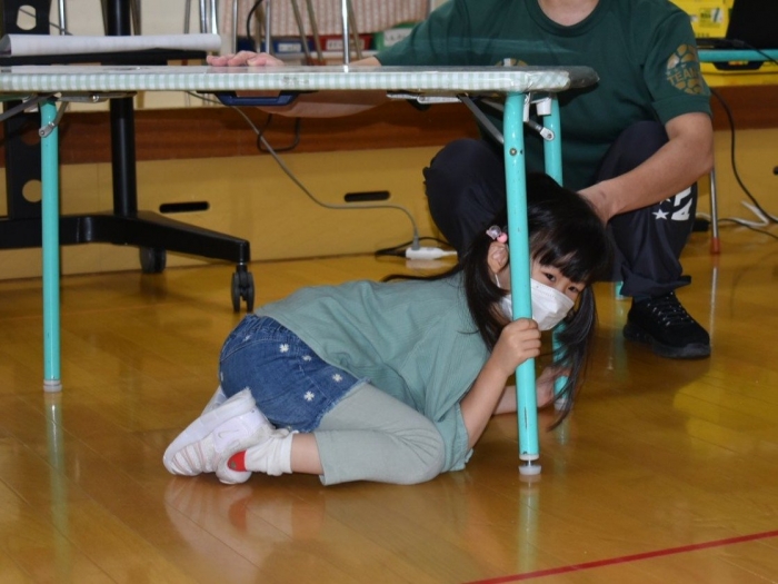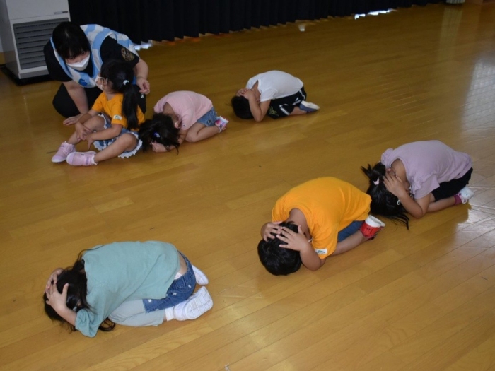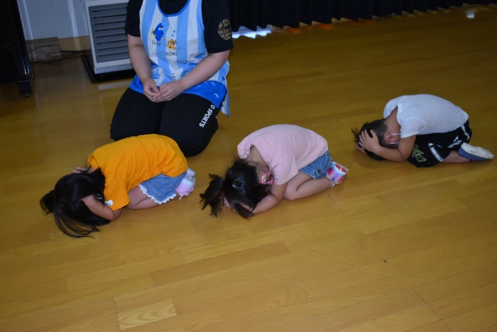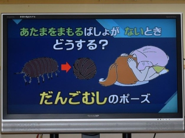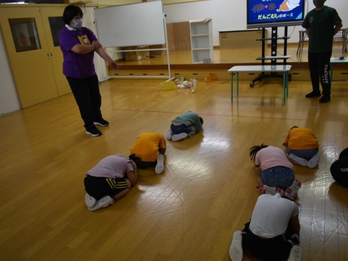 今回は,クラス時間での地震発生・避難訓練を実施。非常ベルが鳴り響くと,ピタッと話を止め避難放送に耳を傾ける姿, 身を隠す場所がない時の安全行動・頭を守る『だんごむし』の姿勢,先生の話を聞いて速やかに避難していました。