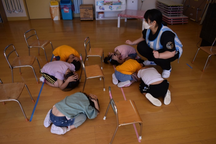 事後指導まで緊張感をもって訓練に臨んでいた子ども達。有毒な煙を吸い込まない火災と,落下物から身を守る地震での安全行動・避難の仕方の違いについても再確認し,訓練を終えました。『自分の命は自分で守る』大事な訓練!!という意識,自分事として考えられるような援助を日頃から心掛けていきたいと思います。