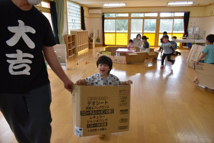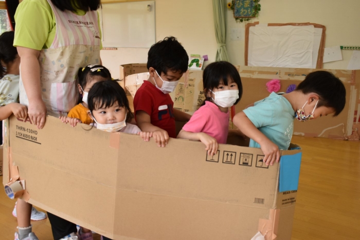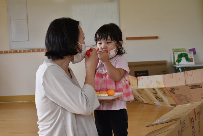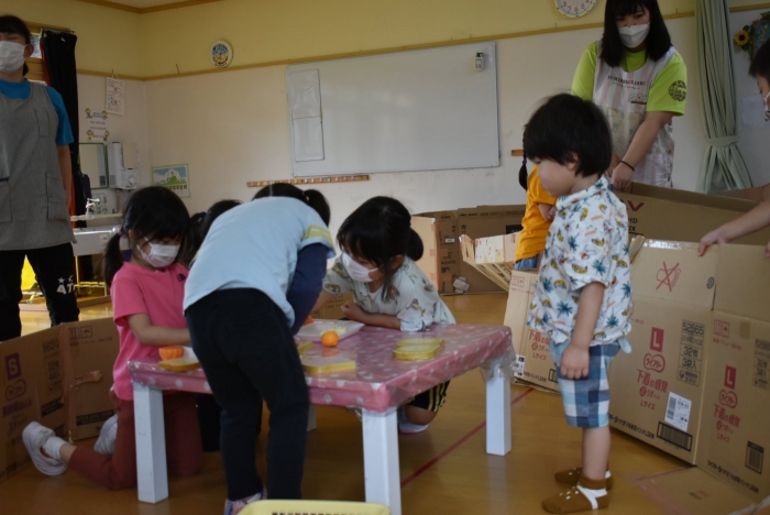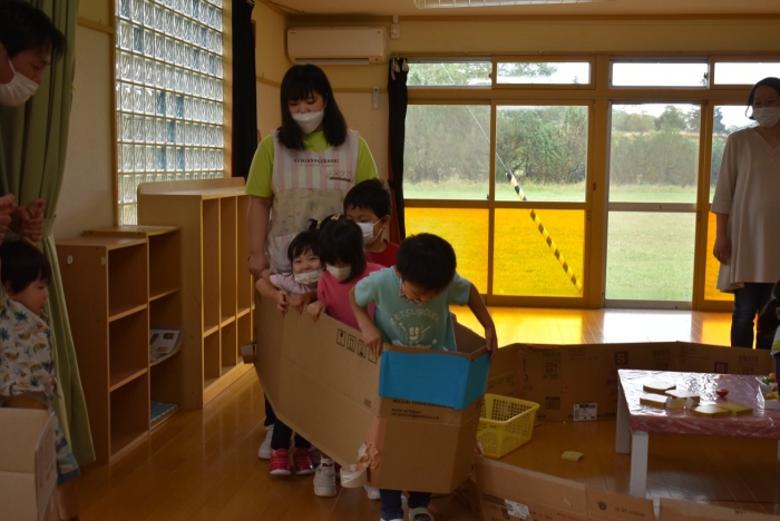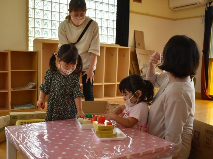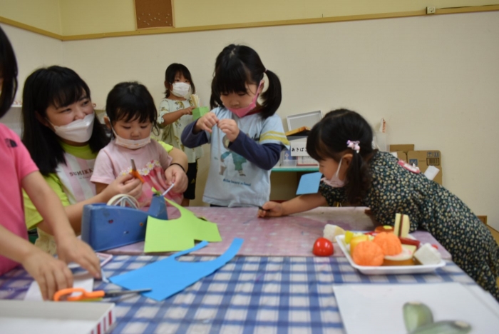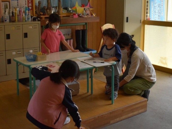 自分たちで作り上げた学校ごっこの空間にぴよぴよさんを誘ったり,自分が作ったもの・やっていることに興味を示すぴよぴよさんに嬉しさを感じたり,自分の楽しいこと+関りを楽しむ姿が増えていました。どう接すればいいのか戸惑いのあった子も,名前を覚えていたり,きっかけがあれば関わろうとしたりなど,回を重ねるごとに年下の子への関心が高まっていることを感じます。