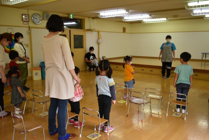 ♪リンゴ ゴロゴロ ♪ピーマン ピッピッ ♪ズッキーニン(ニンで忍者ポーズ)子ども達の知っている果物や野菜が登場し,面白い擬音が混ざる歌詞に,大盛り上がり⤴