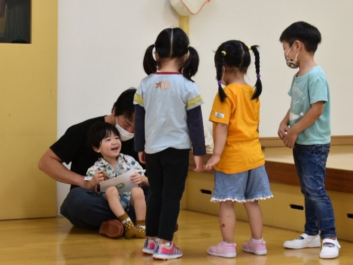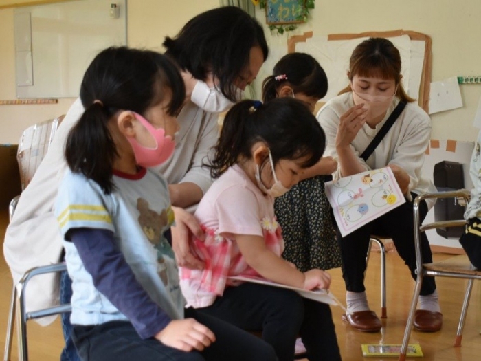 ぴよぴよクラブに慣れてきた年少児たちも,出席シール帳配り