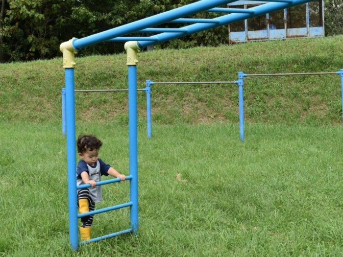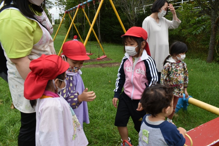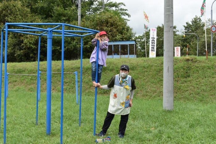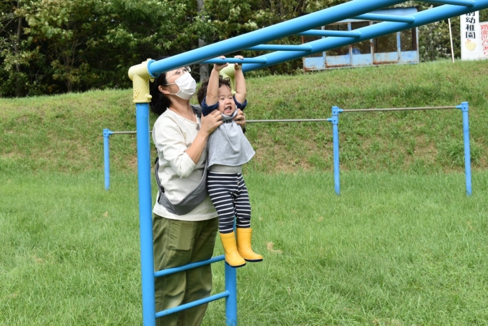 戸外でもひと遊び! 園児が雲梯をしている姿を見て,ぴよぴよさんも挑戦☆彡