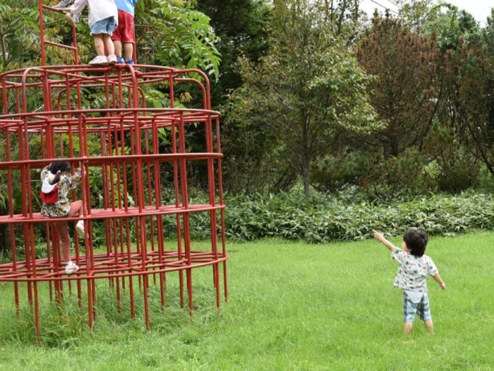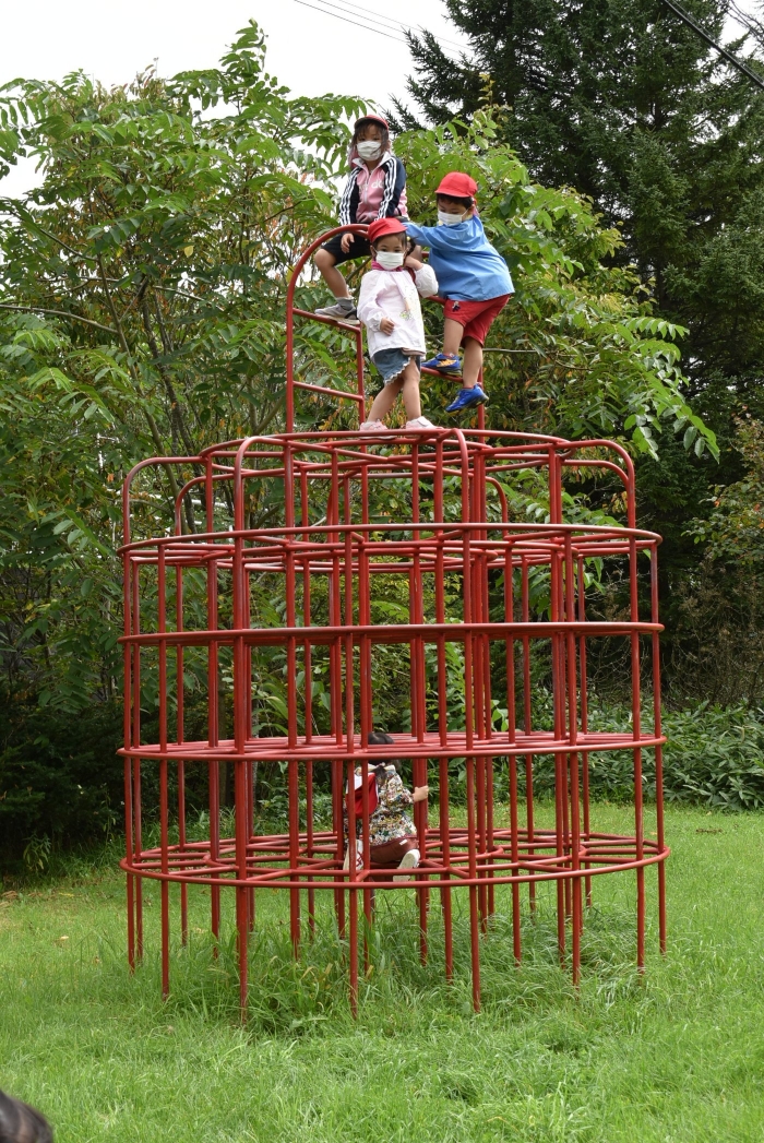 ジャングルジムの天辺まで登る園児たちに,大興奮のぴよぴよさん! すごーい!! 僕もやってみたい! と思っているのかな