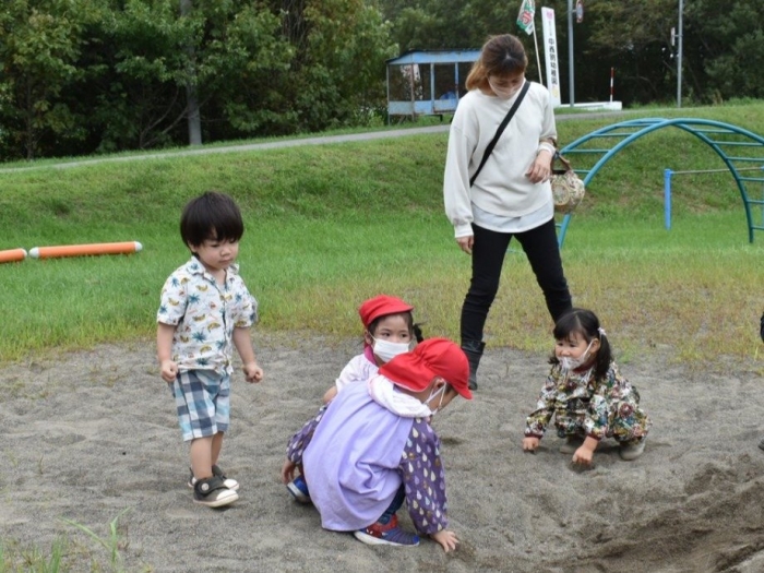 最後は自然と砂場の方へ…,子ども達にとって魅力的な環境のようです