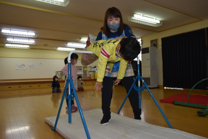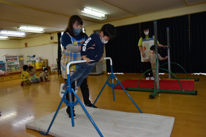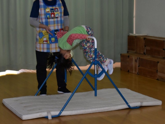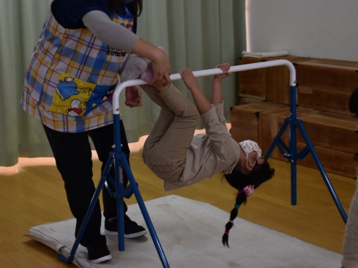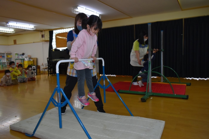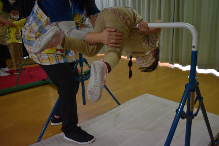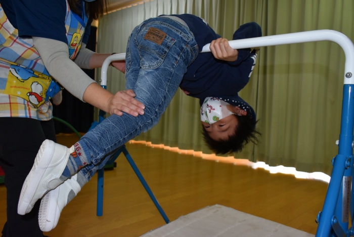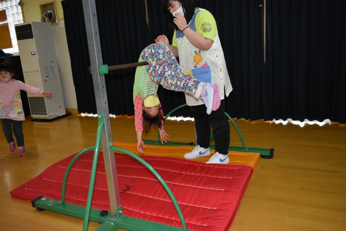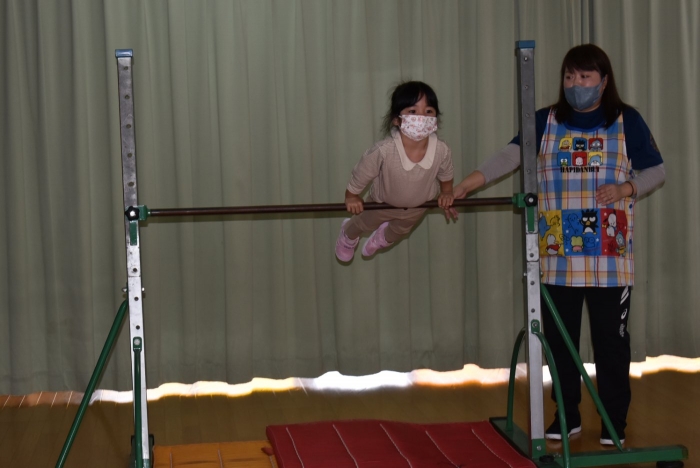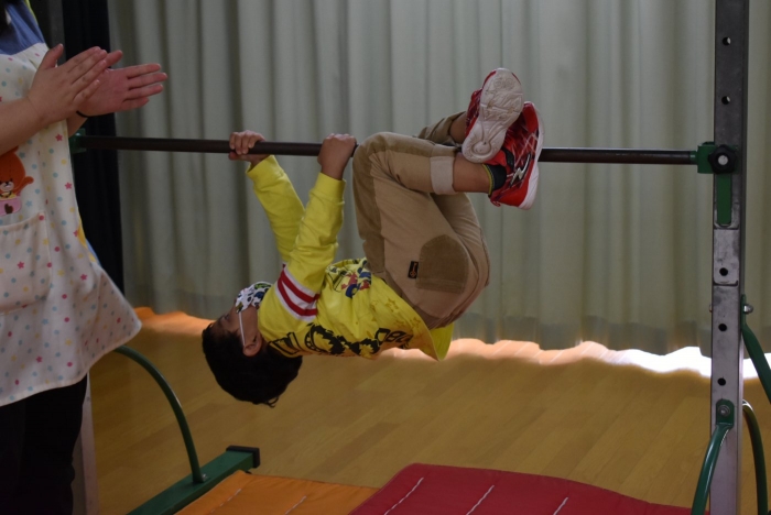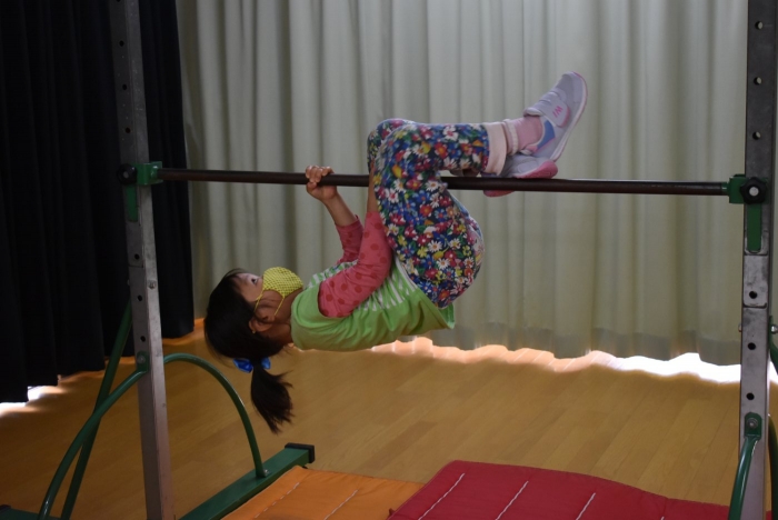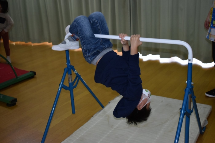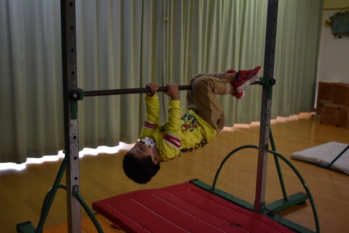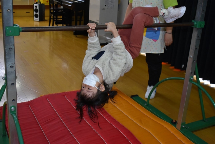 今回の『体で遊ぼう』では,鉄棒を使っての運動を行いました。登り棒・雲梯での『懸垂力』,動物歩き・跳びやマット運動での『支持力』『回転感覚』など,これまで体験した体の動かし方がポイントに! 鉄棒の高さや逆さ感覚に恐怖心が先立つ子もいましたが,友達からの刺激や先生からサポートを受け,体のどの部分に力を入れたらいいのか,体をどのように動かしたらいいのか,頭と体を連動させながら取り組んでいました。最後には,意欲と自信をもって,みんなの前で技を披露する子の姿も! 何事も挑戦!できる自分を感じられたようですね。