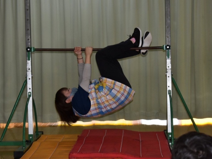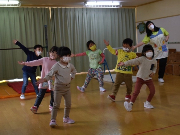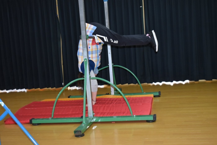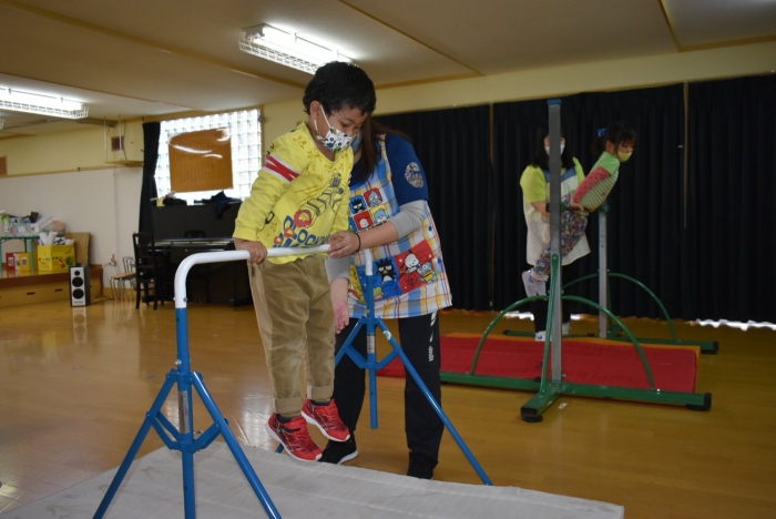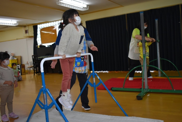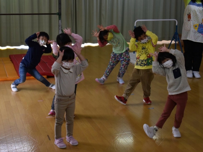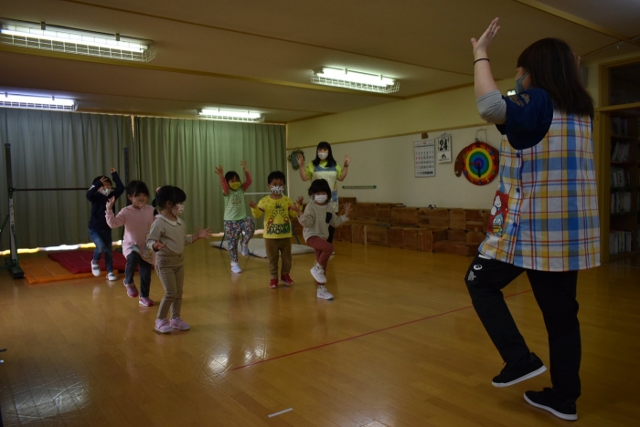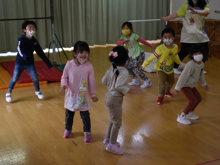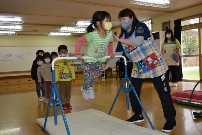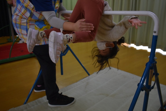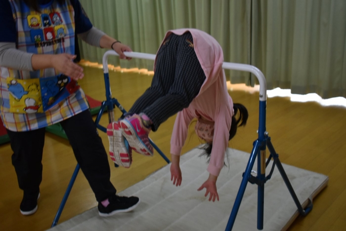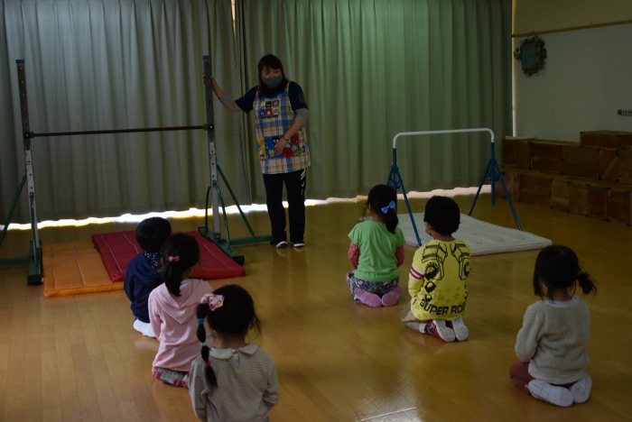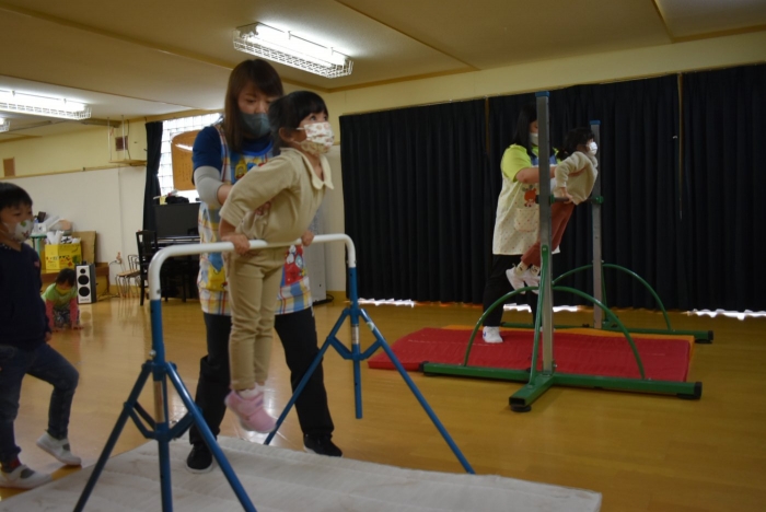 今回の『体で遊ぼう』では,鉄棒を使っての運動を行いました。登り棒・雲梯での『懸垂力』,動物歩き・跳びやマット運動での『支持力』『回転感覚』など,これまで体験した体の動かし方がポイントに! 鉄棒の高さや逆さ感覚に恐怖心が先立つ子もいましたが,友達からの刺激や先生からサポートを受け,体のどの部分に力を入れたらいいのか,体をどのように動かしたらいいのか,頭と体を連動させながら取り組んでいました。最後には,意欲と自信をもって,みんなの前で技を披露する子の姿も! 何事も挑戦!できる自分を感じられたようですね。