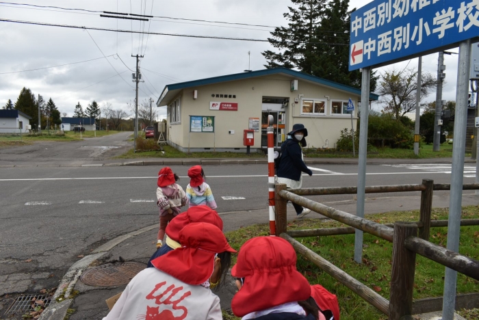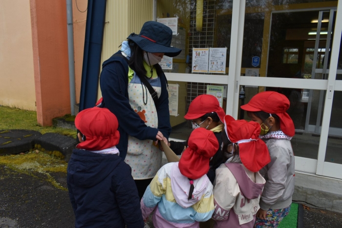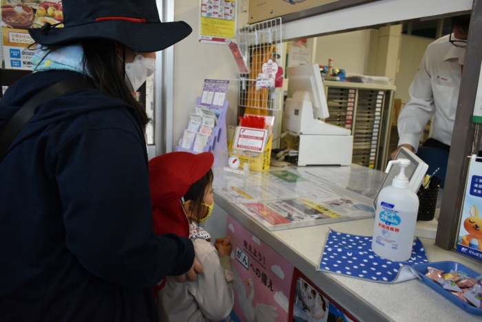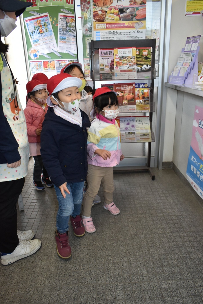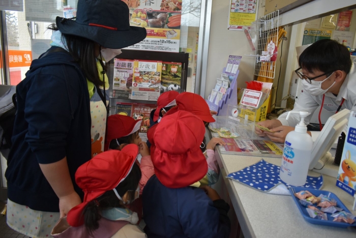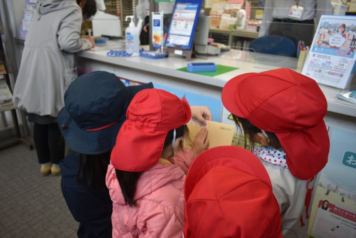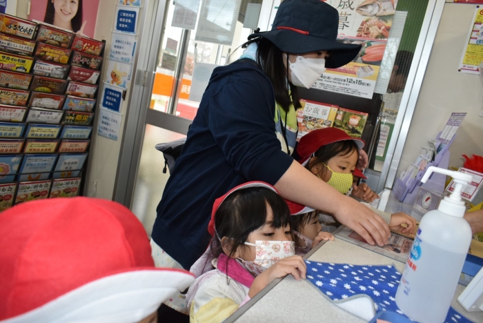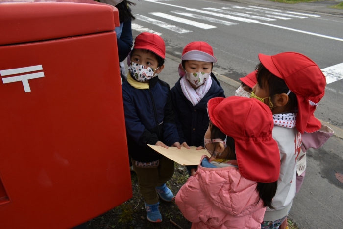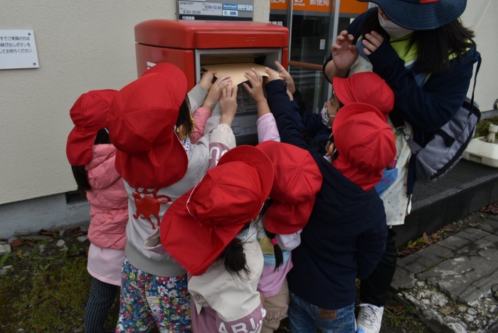 ALT(外国語指導助手)のディー先生との出会いに,大いに心を動かしていた子ども達。小学校へお礼の絵手紙(いもにしちゃん)を書いたことをきっかけに,「そうだ! ディー先生にも手紙を書こう!!」と自ら行動を起こしていました。一人一人の絵手紙をまとめた封書も完成☆彡 絵手紙を持つ,窓口で用件を伝える,切手を貼るなど,誰が何をするか年中組で役割分担も相談し合い,意気揚々と郵便局へ行ってきました。郵便局では,がんばった子ども達にシールや飴までプレゼントしていただき,ご満悦の様子の子ども達でした。温かなお心遣いを有り難うございました。