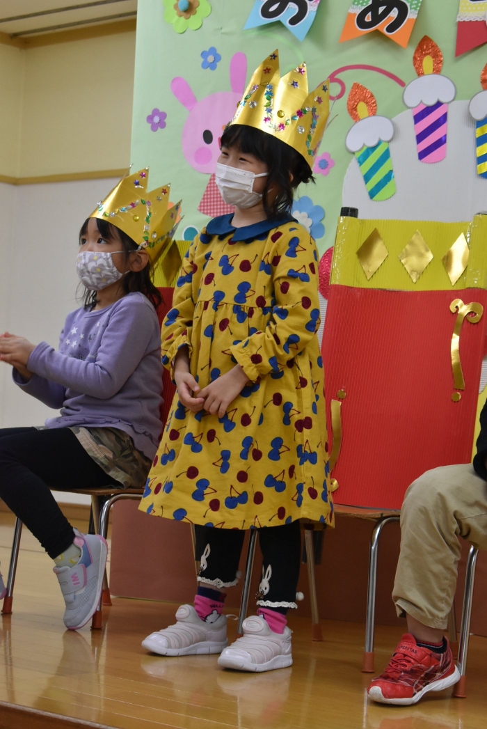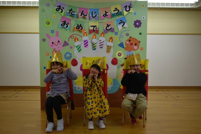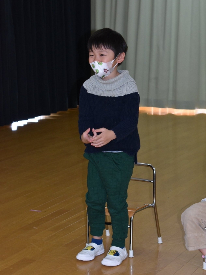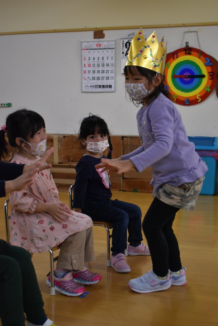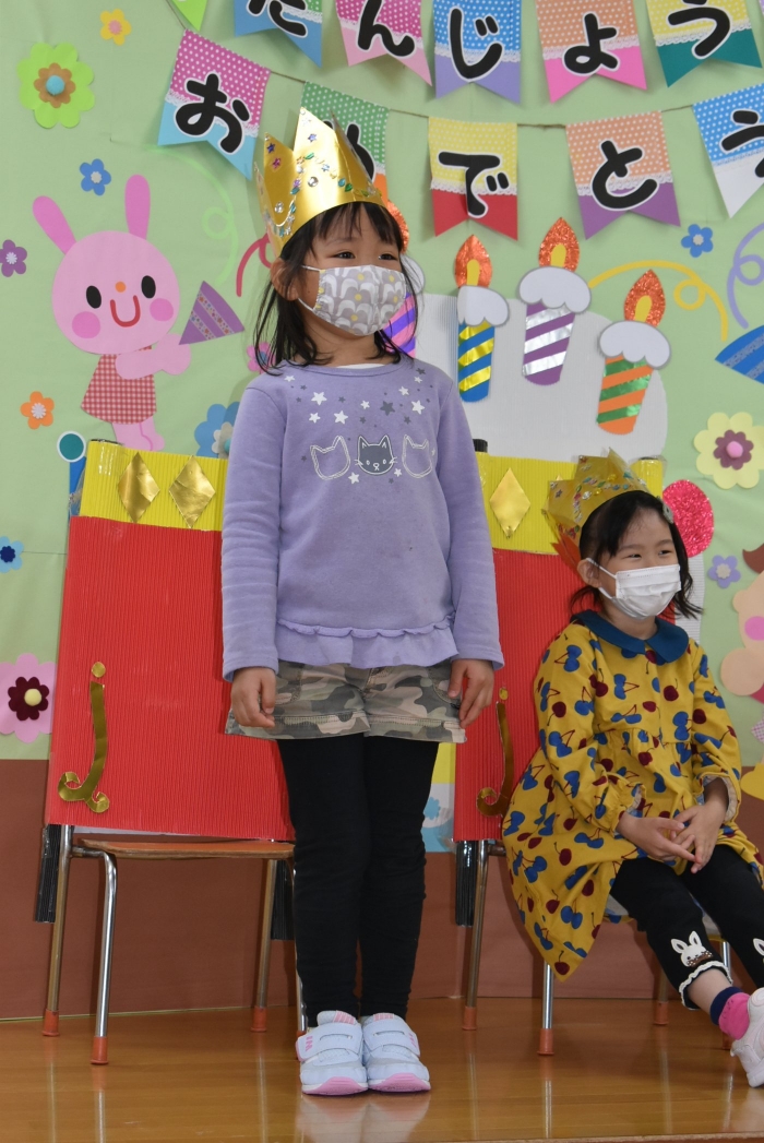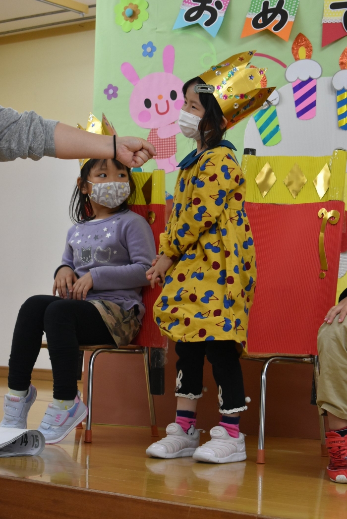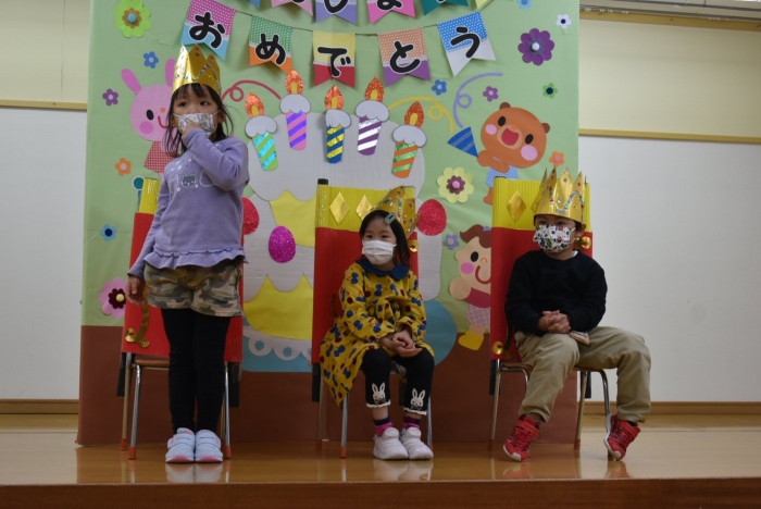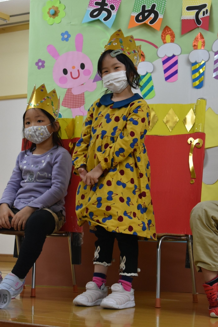 26日は,10月生まれの『誕生会』がありました.。この日を待ちに待っていた3名の誕生児たち。ハイタッチや拍手で出迎えられ,とびきりの笑顔で入場していました。一つ大きくなったという自覚と喜びにあふれ,ステージ上でも堂々と自己紹介や質問への受け答えをしていました。 そして,今回はお祝いされる側が全員年中児,お祝いする側が全員年少児という誕生会となり,ちょっと拍手が足りないな…と感じたら,誕生児自ら拍手や手拍子をして盛り上げる姿も(笑) さすが,経験を積んでいる年中児だと感心させられました。