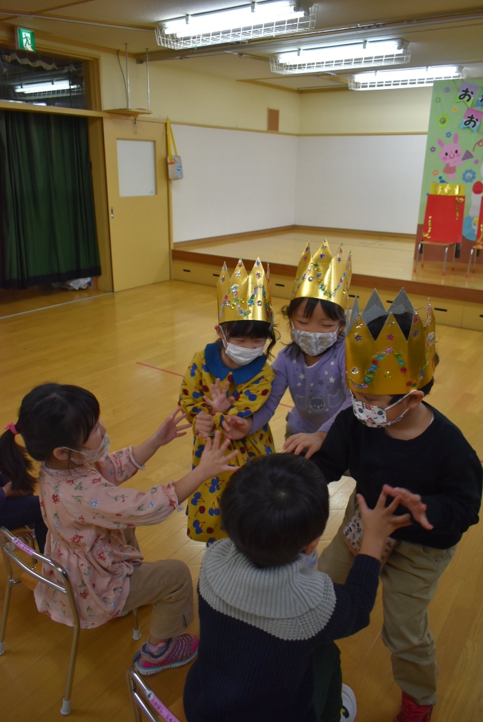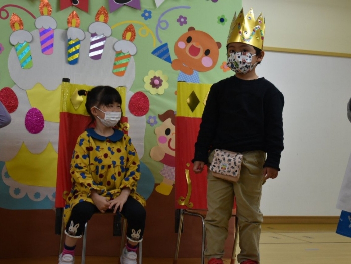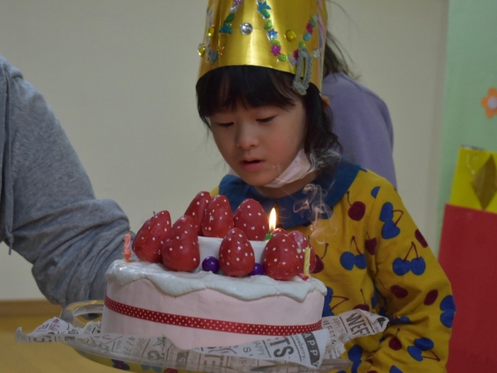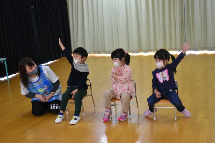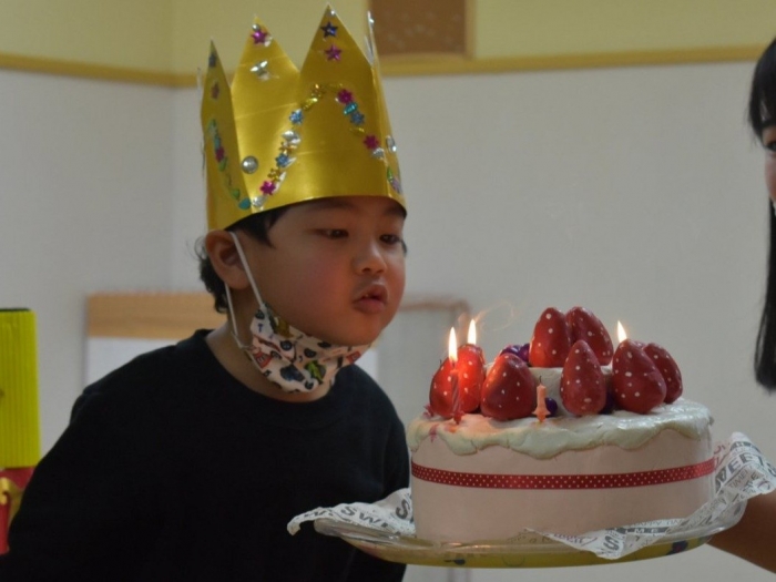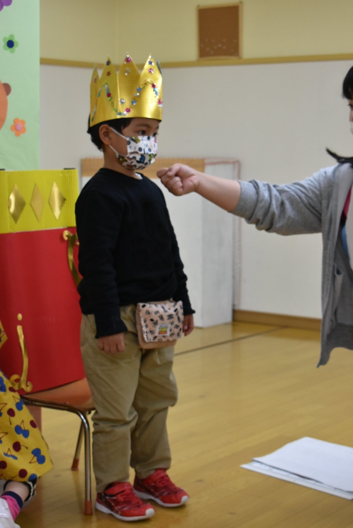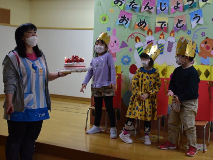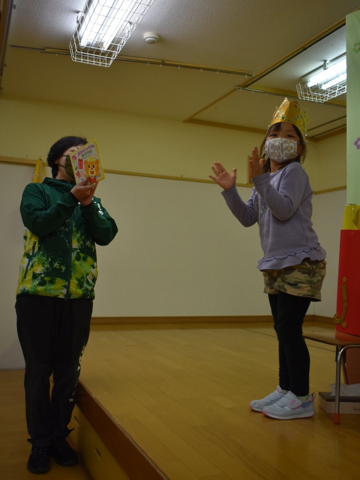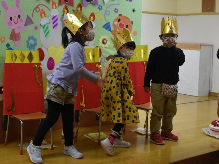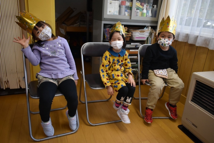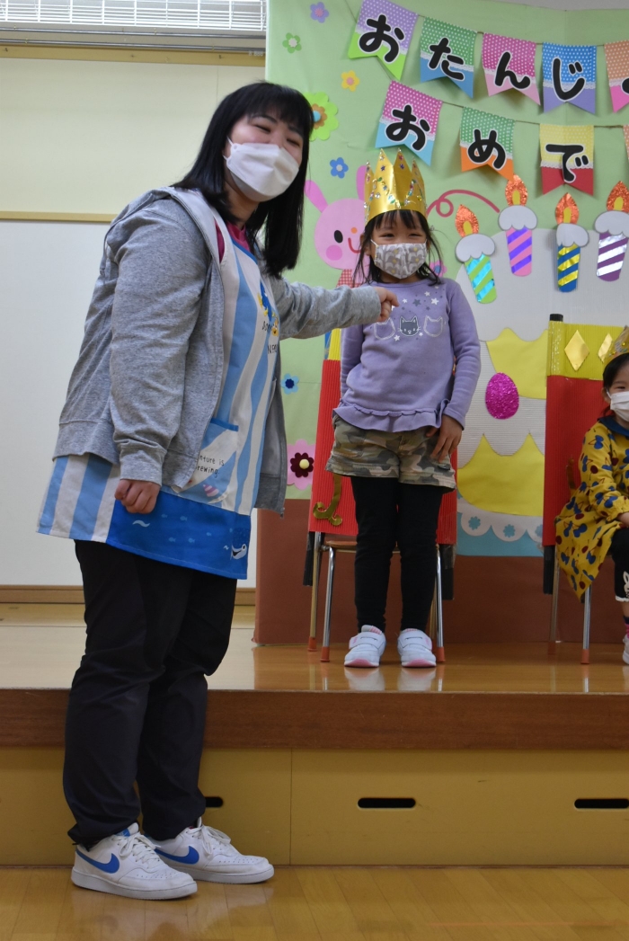 26日は,10月生まれの『誕生会』がありました.。この日を待ちに待っていた3名の誕生児たち。ハイタッチや拍手で出迎えられ,とびきりの笑顔で入場していました。一つ大きくなったという自覚と喜びにあふれ,ステージ上でも堂々と自己紹介や質問への受け答えをしていました。 そして,今回はお祝いされる側が全員年中児,お祝いする側が全員年少児という誕生会となり,ちょっと拍手が足りないな…と感じたら,誕生児自ら拍手や手拍子をして盛り上げる姿も(笑) さすが,経験を積んでいる年中児だと感心させられました。