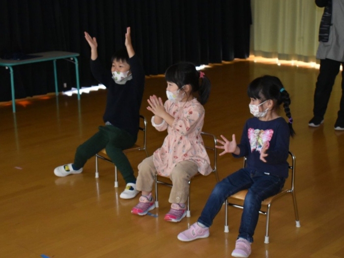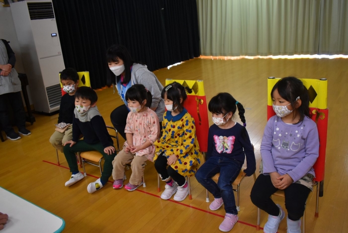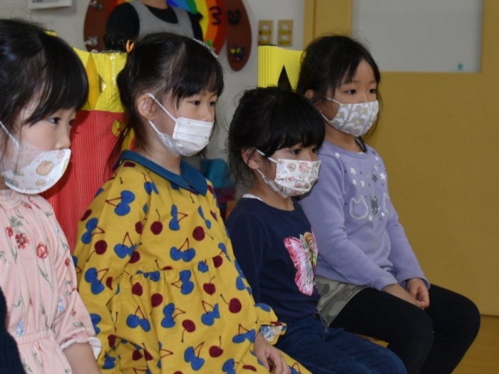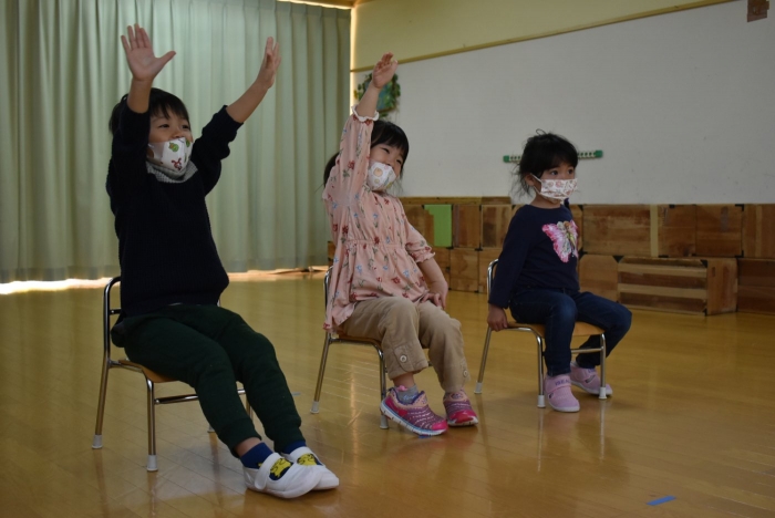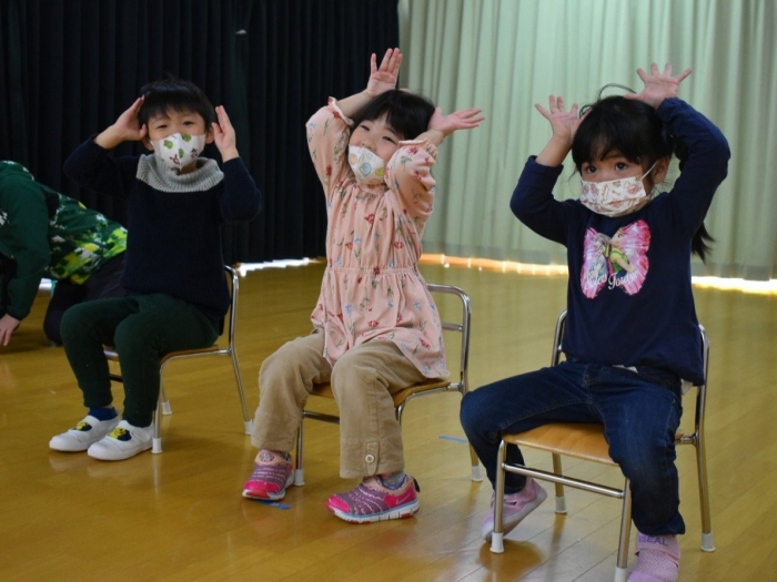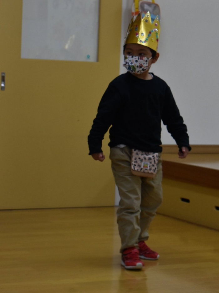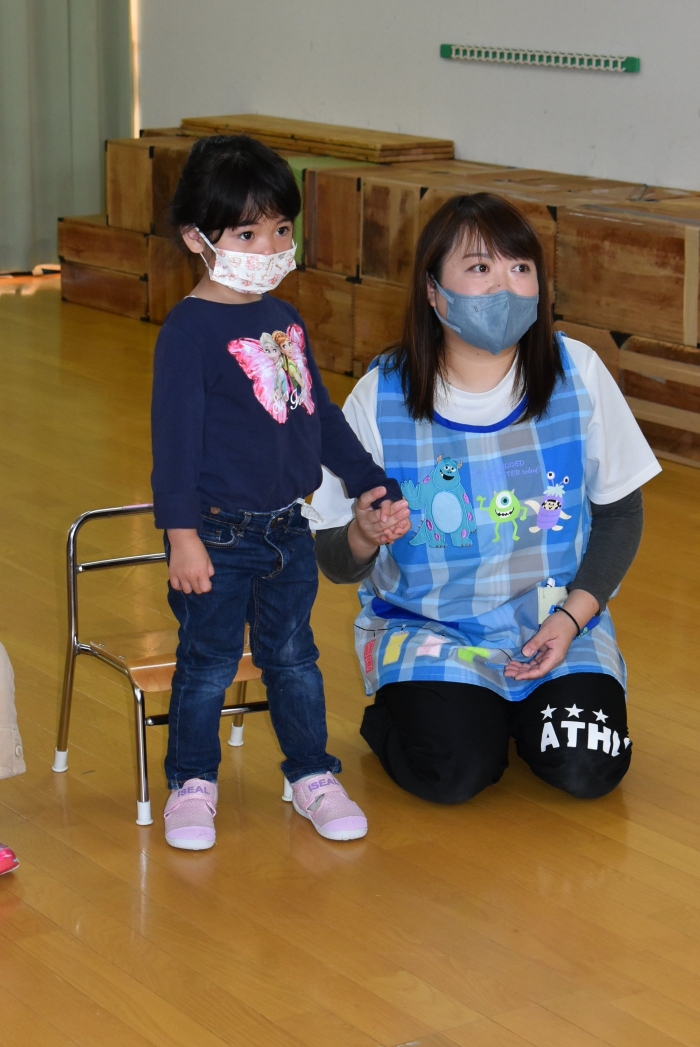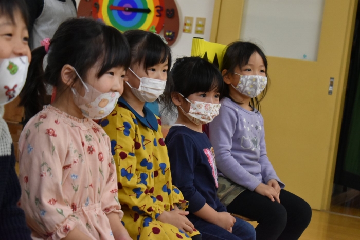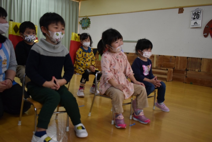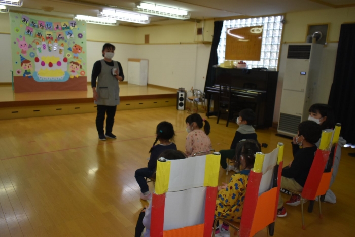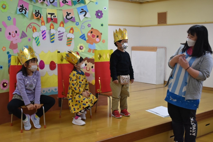 26日は,10月生まれの『誕生会』がありました.。この日を待ちに待っていた3名の誕生児たち。ハイタッチや拍手で出迎えられ,とびきりの笑顔で入場していました。一つ大きくなったという自覚と喜びにあふれ,ステージ上でも堂々と自己紹介や質問への受け答えをしていました。 そして,今回はお祝いされる側が全員年中児,お祝いする側が全員年少児という誕生会となり,ちょっと拍手が足りないな…と感じたら,誕生児自ら拍手や手拍子をして盛り上げる姿も(笑) さすが,経験を積んでいる年中児だと感心させられました。