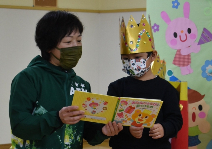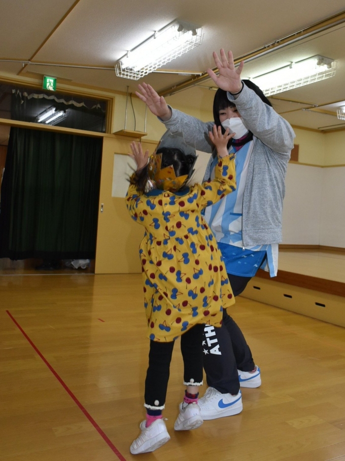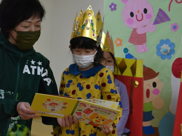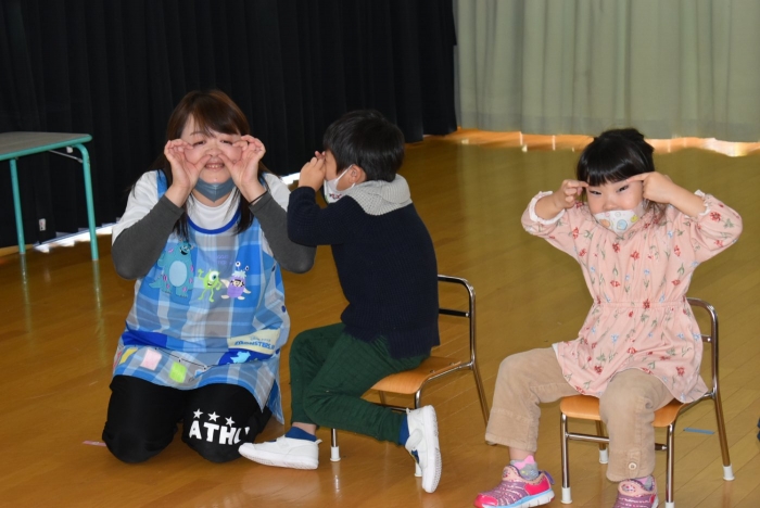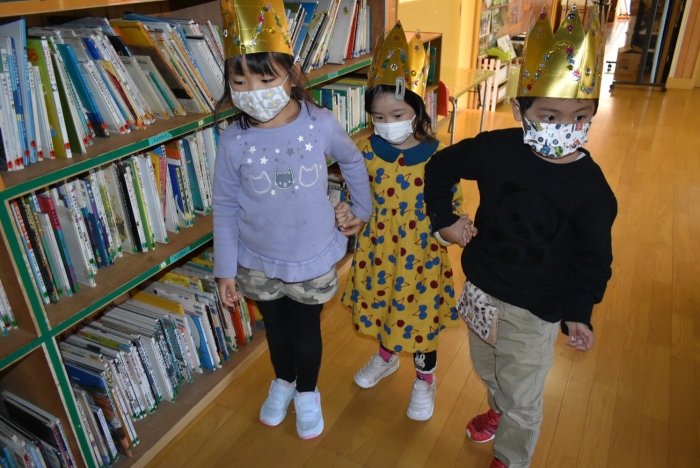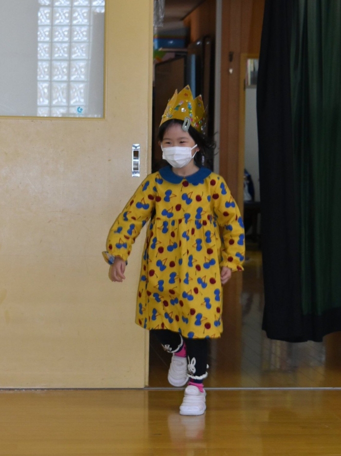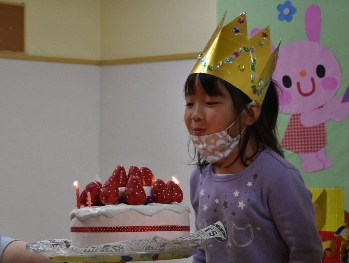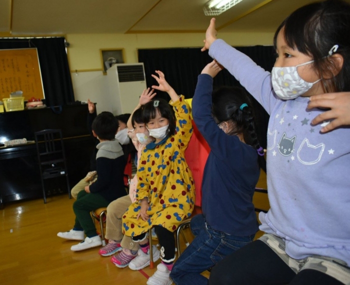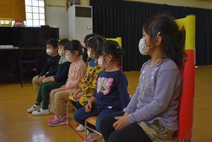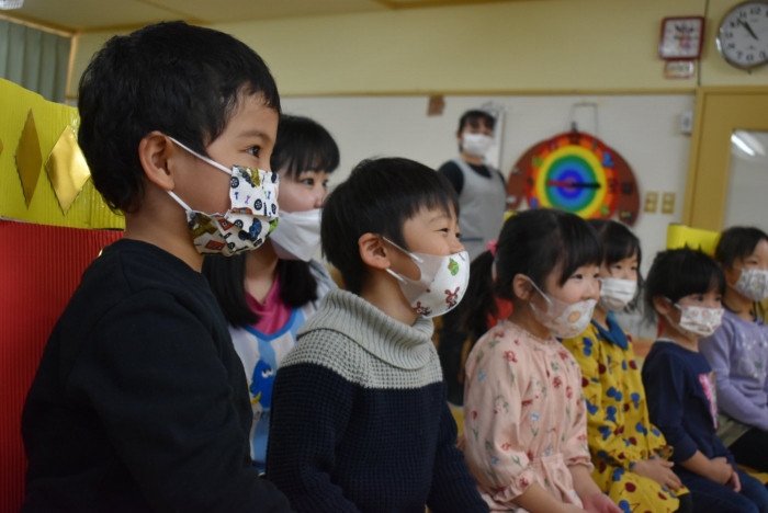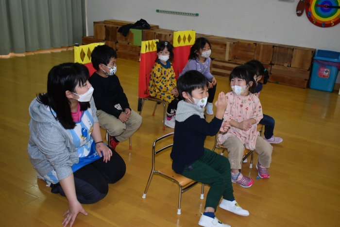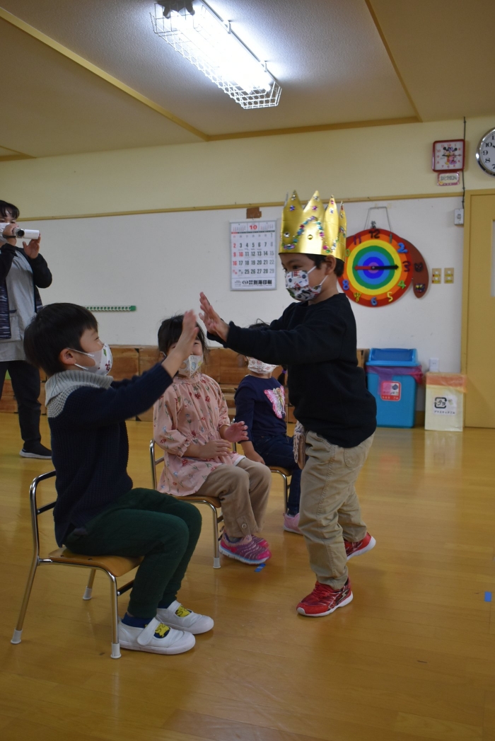 26日は,10月生まれの『誕生会』がありました.。この日を待ちに待っていた3名の誕生児たち。ハイタッチや拍手で出迎えられ,とびきりの笑顔で入場していました。一つ大きくなったという自覚と喜びにあふれ,ステージ上でも堂々と自己紹介や質問への受け答えをしていました。 そして,今回はお祝いされる側が全員年中児,お祝いする側が全員年少児という誕生会となり,ちょっと拍手が足りないな…と感じたら,誕生児自ら拍手や手拍子をして盛り上げる姿も(笑) さすが,経験を積んでいる年中児だと感心させられました。