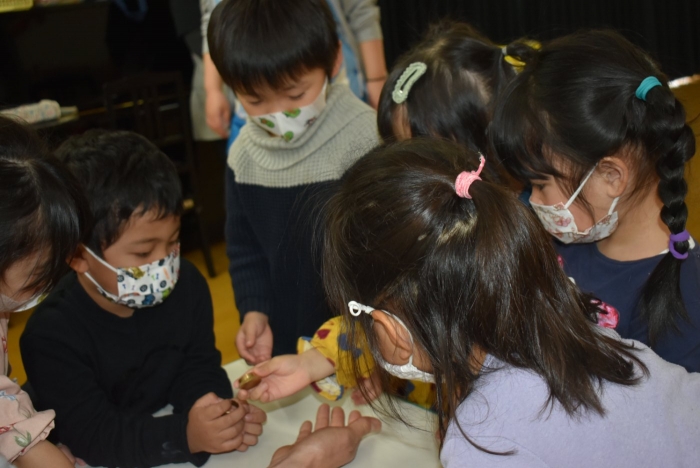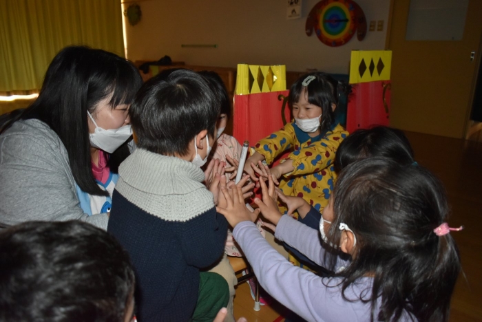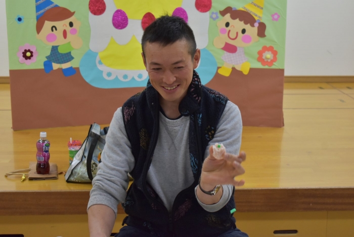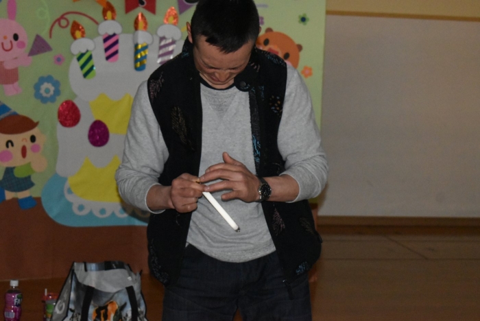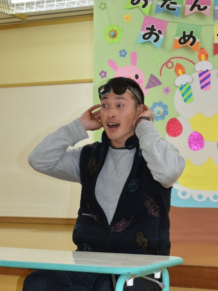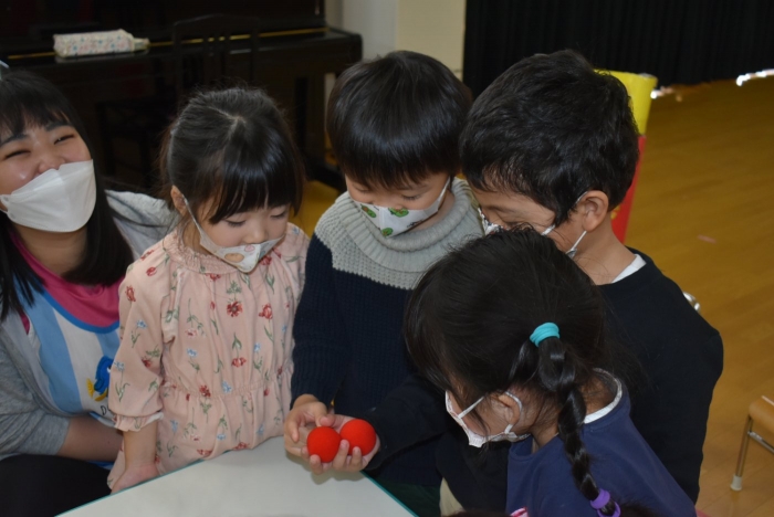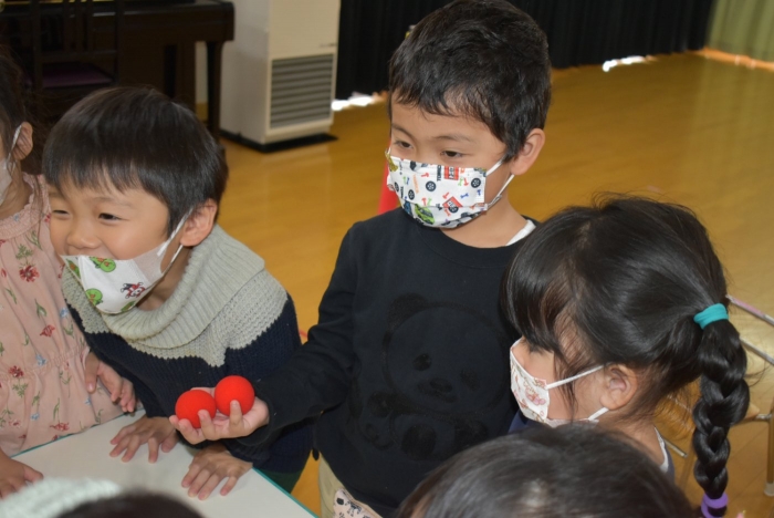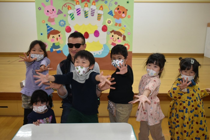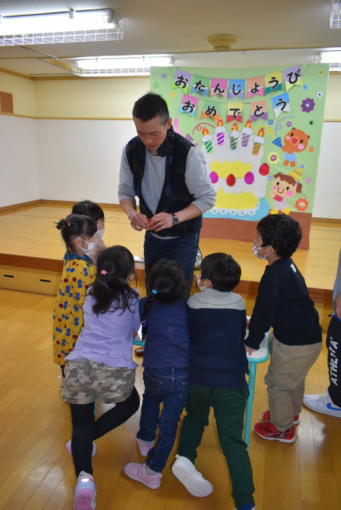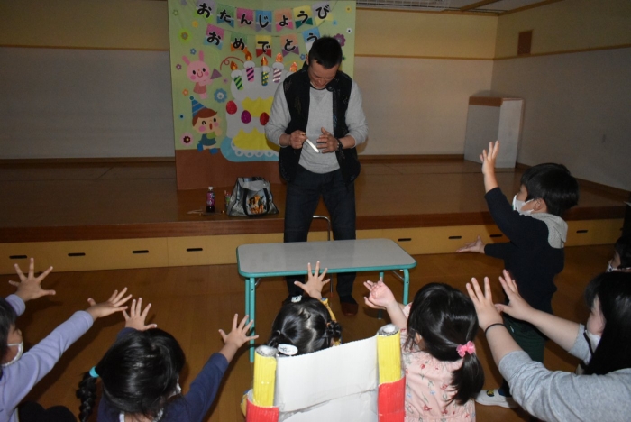 誕生会のお楽しみでは,先生方たっての希望で,再びマジシャン『Mrリョーマ』に登場していただきました☆彡 この日のために,マジックテクニックに更なる磨きを掛け,新ネタ!?を携え来してくださいました! 『ボールペンの色が変わる!?』『空の袋からお菓子&ジュースが!!』『飲物が浮いてる!?』『玉が増えた!?』『緑の丸を描いたティッシュを炙ると…シューマイに!!』『お金は,どこへ!!!』 本格的なマジックの数々に驚き,不思議さ,感動を味わっていた子ども達でした。 お忙しい中,幼稚園側の依頼に快く応じてくださったMrリョーマ様,本当に有り難うございました。子ども達にとって,思い出深いステキな誕生会となったことを心より感謝申し上げます。