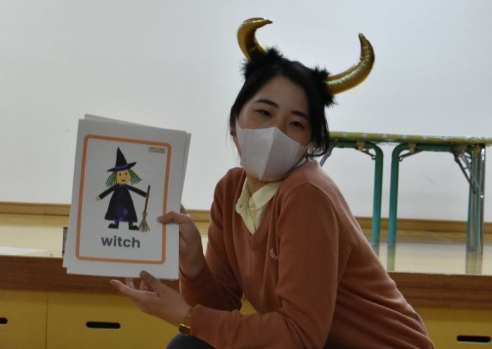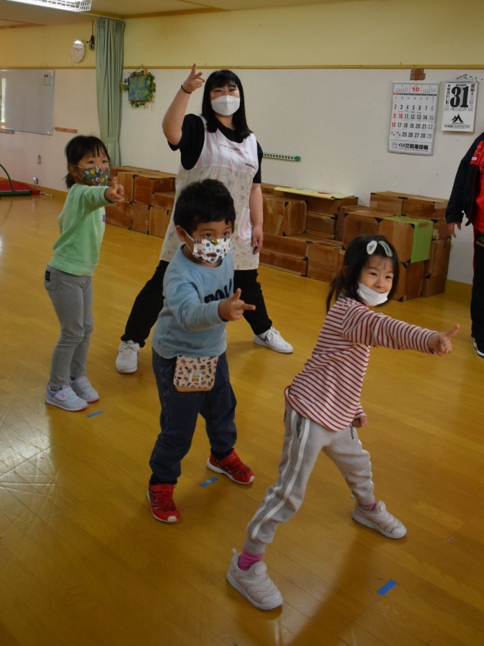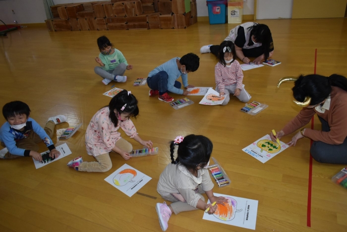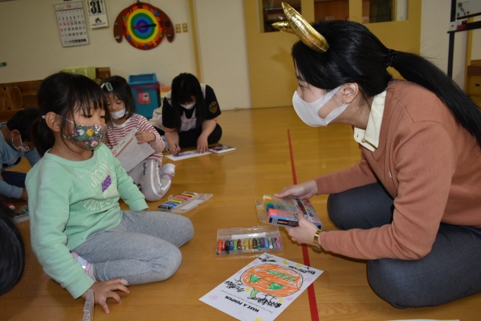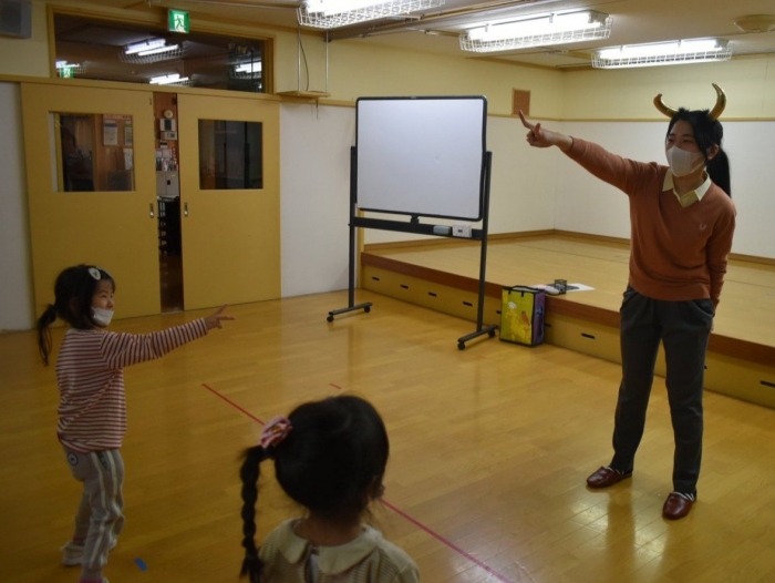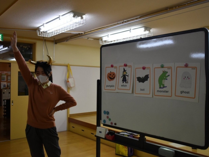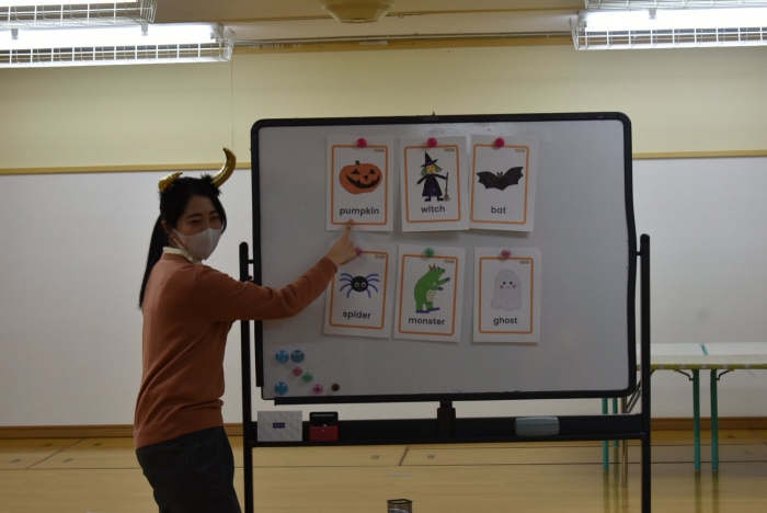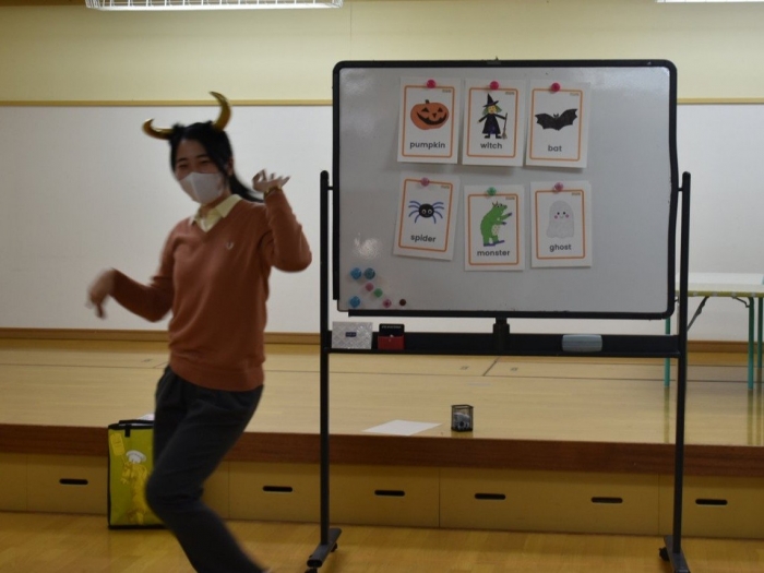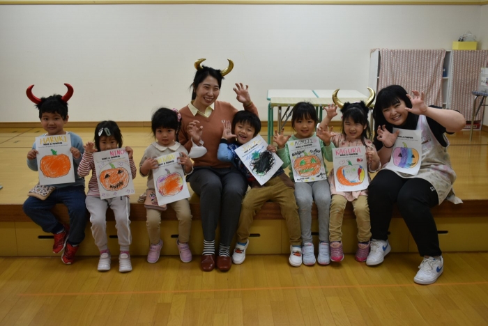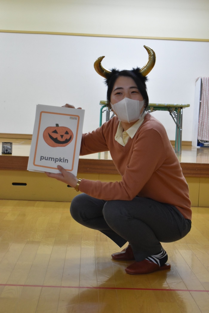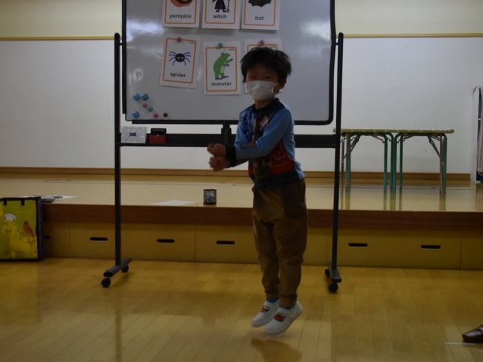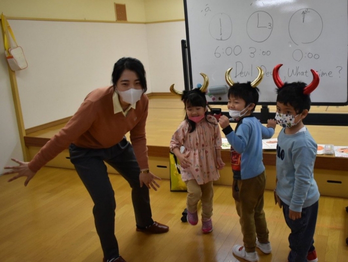 毎年,子ども達が引き込まれる仕掛けや内容を考えてくださるF先生。今日はハロウィンということで,デビルの角を付けて登場してくれました (^^♪ まずは,英語で挨拶&自己紹介! 楽しみ♪ イエーイ!! と飛び跳ねていた姿から一転…,英語で話を振られると「‥‥。」無になる子が続出(笑)でしたが,個々の気持ちを汲んで温かく対応してくださったおかげで,段々と心がほぐれてきた子ども達。その後のゲームでは,素の自分を出せるようになっていました。いつもと違う環境になると緊張が先立つ姿から,少しずつ自己発揮・自己表現していけるように,今後も様々なもの・こと・人と出会う・触れ合う機会を大切にしていきたいと思います。