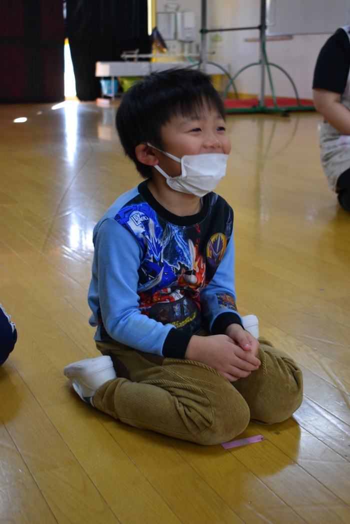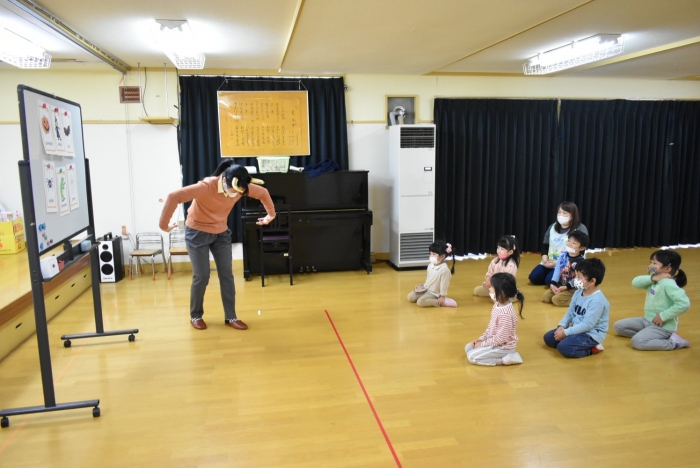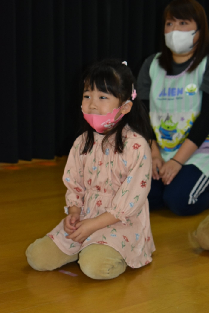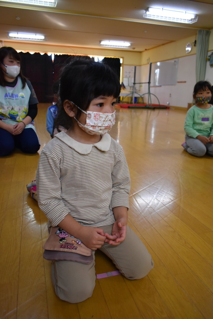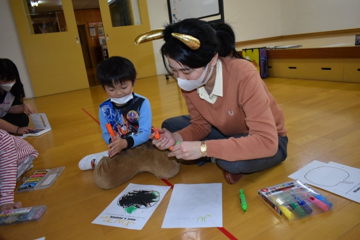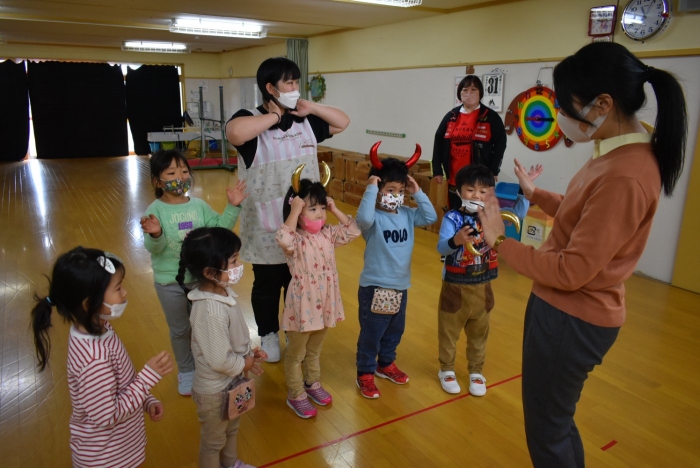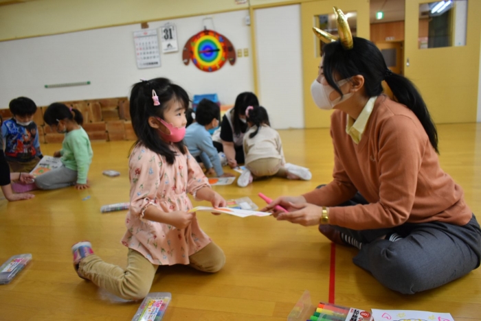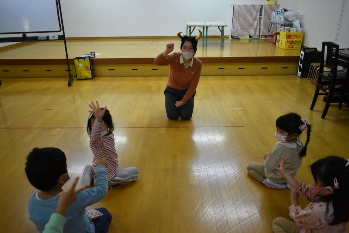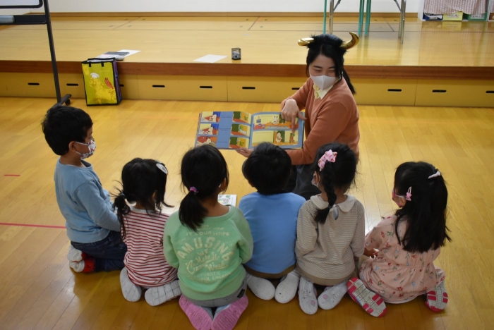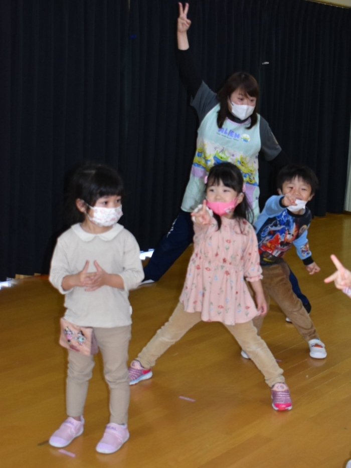毎年,子ども達が引き込まれる仕掛けや内容を考えてくださるF先生。今日はハロウィンということで,デビルの角を付けて登場してくれました (^^♪ まずは,英語で挨拶&自己紹介! 楽しみ♪ イエーイ!! と飛び跳ねていた姿から一転…,英語で話を振られると「‥‥。」無になる子が続出(笑)でしたが,個々の気持ちを汲んで温かく対応してくださったおかげで,段々と心がほぐれてきた子ども達。その後のゲームでは,素の自分を出せるようになっていました。いつもと違う環境になると緊張が先立つ姿から,少しずつ自己発揮・自己表現していけるように,今後も様々なもの・こと・人と出会う・触れ合う機会を大切にしていきたいと思います。