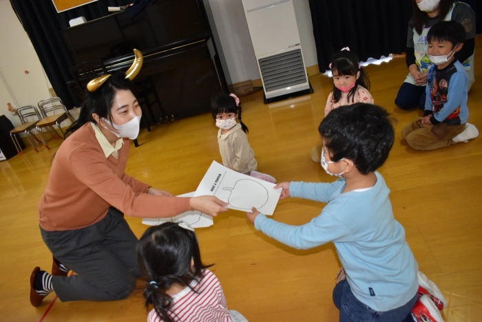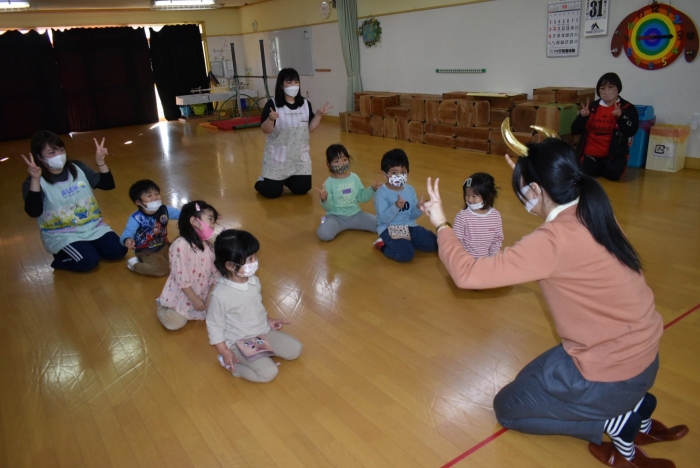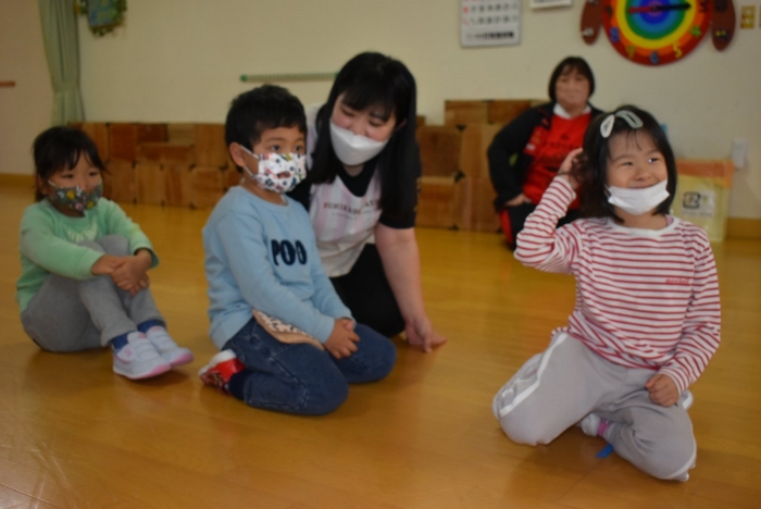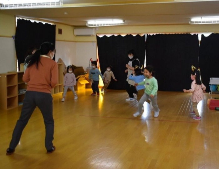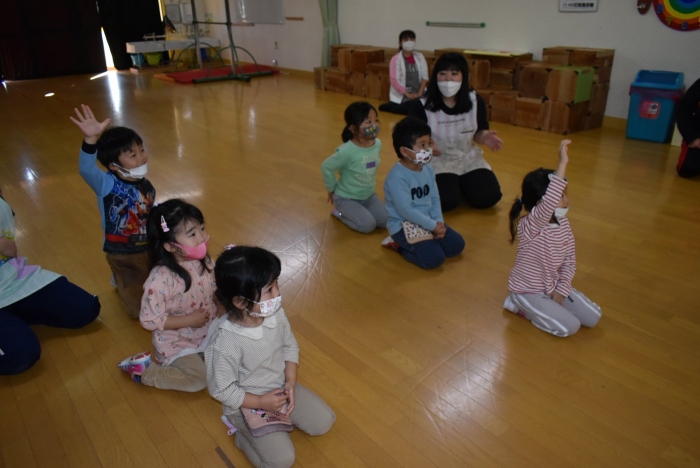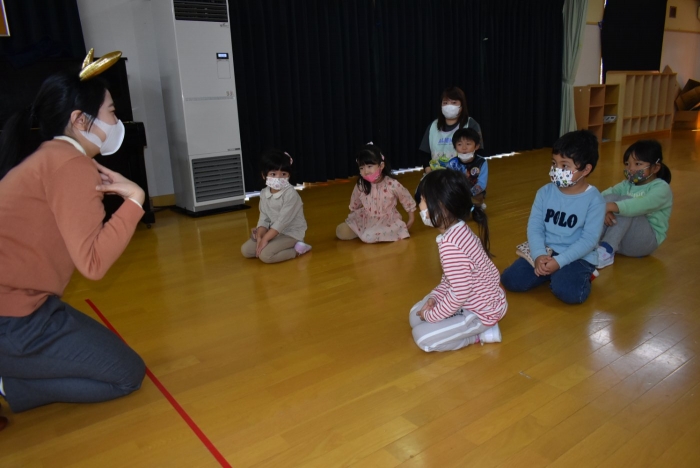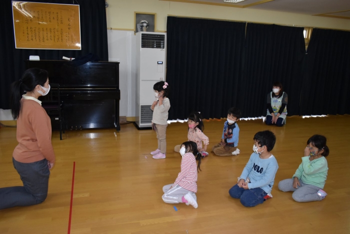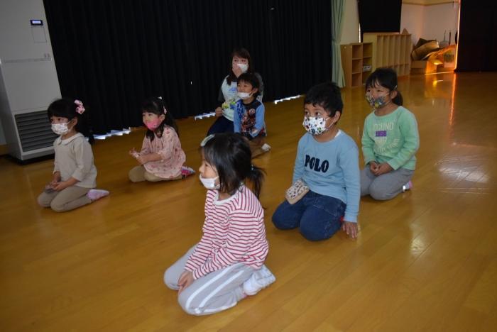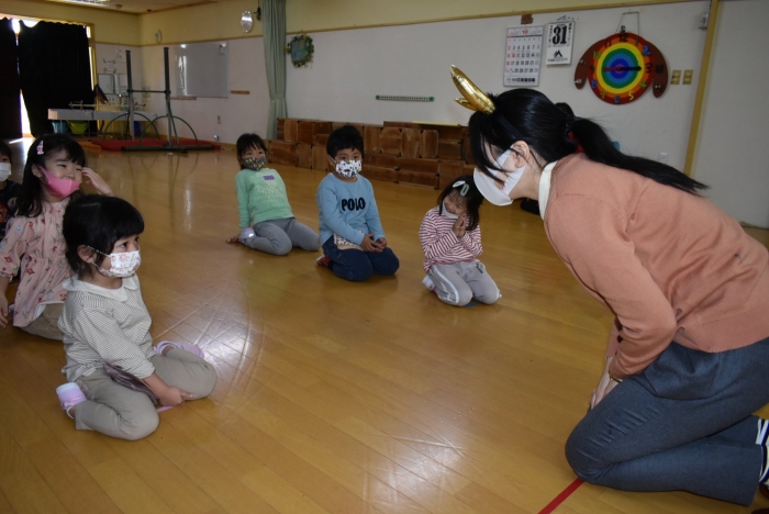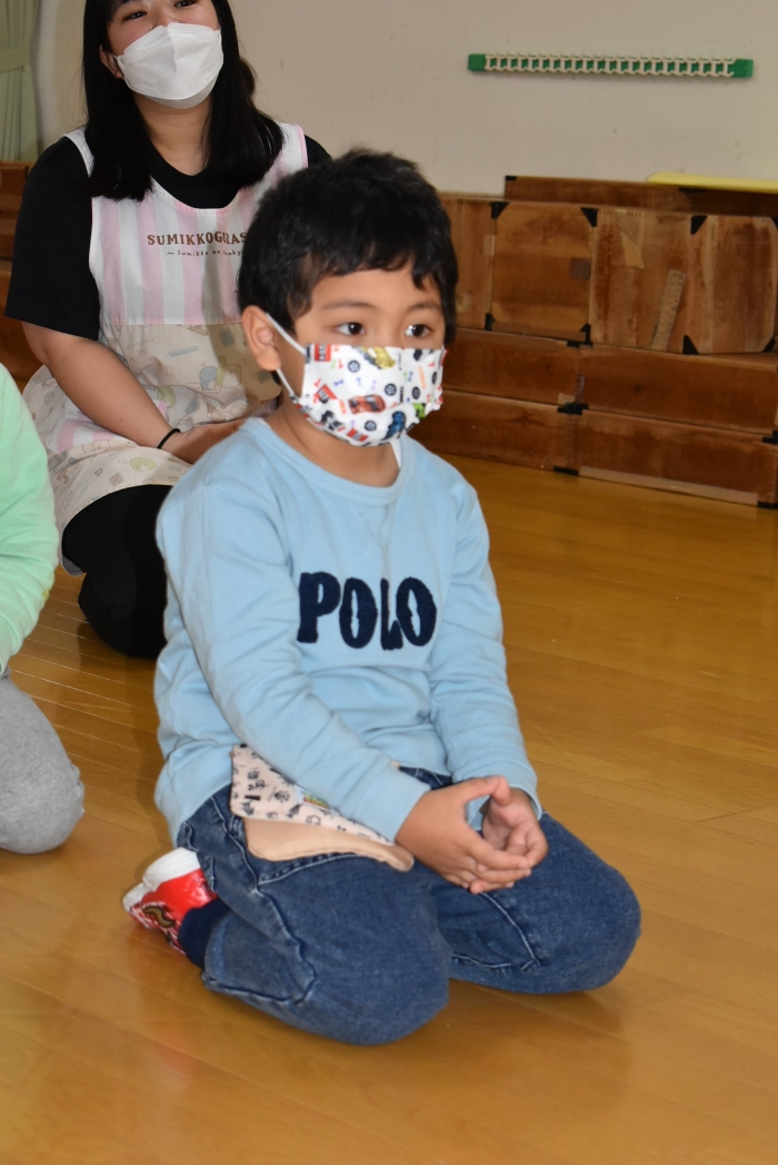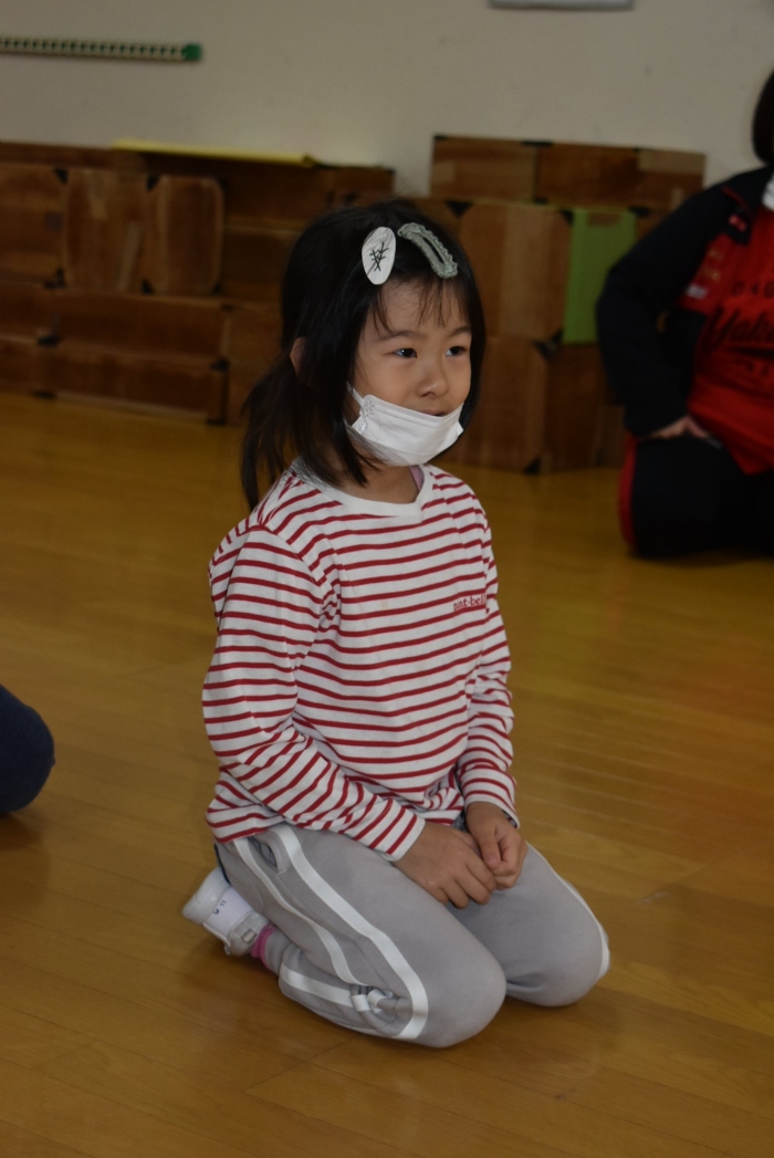 毎年,子ども達が引き込まれる仕掛けや内容を考えてくださるF先生。今日はハロウィンということで,デビルの角を付けて登場してくれました (^^♪ まずは,英語で挨拶&自己紹介! 楽しみ♪ イエーイ!! と飛び跳ねていた姿から一転…,英語で話を振られると「‥‥。」無になる子が続出(笑)でしたが,個々の気持ちを汲んで温かく対応してくださったおかげで,段々と心がほぐれてきた子ども達。その後のゲームでは,素の自分を出せるようになっていました。いつもと違う環境になると緊張が先立つ姿から,少しずつ自己発揮・自己表現していけるように,今後も様々なもの・こと・人と出会う・触れ合う機会を大切にしていきたいと思います。