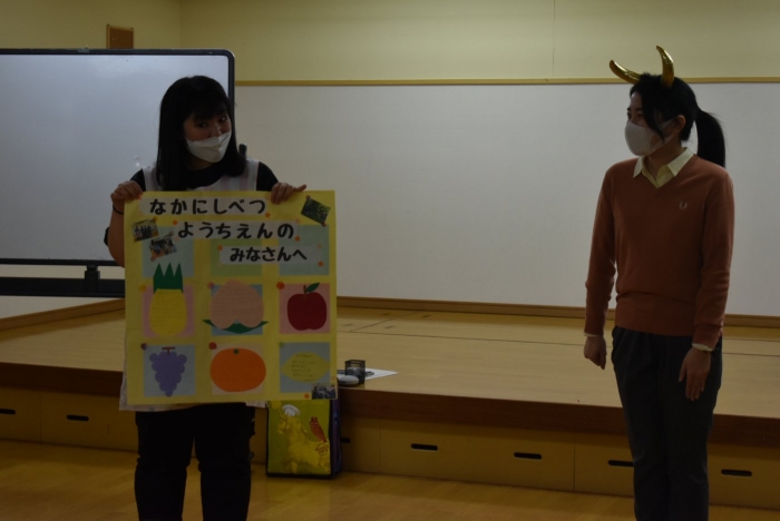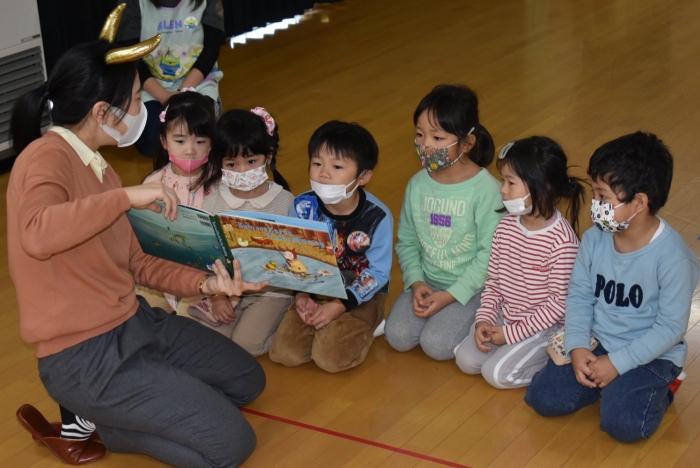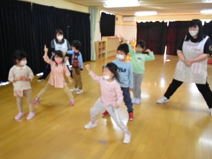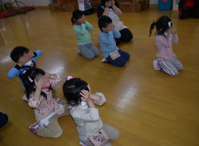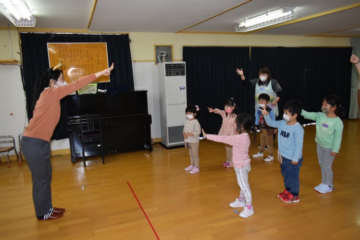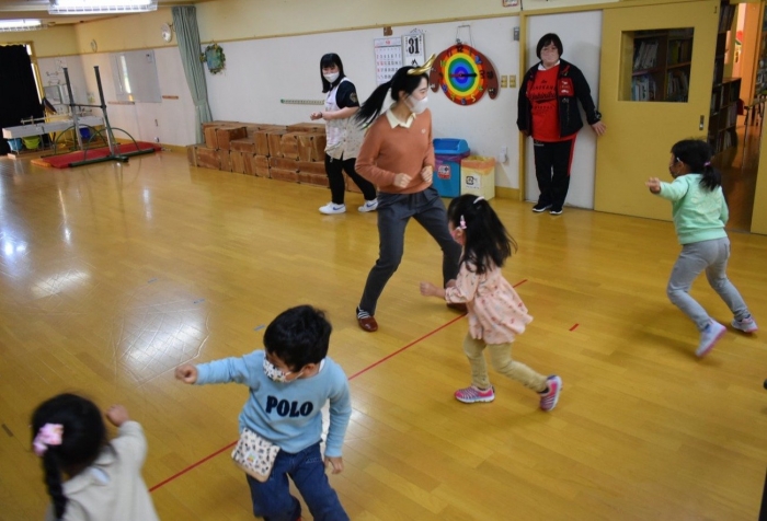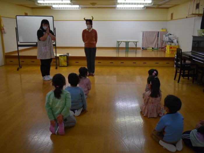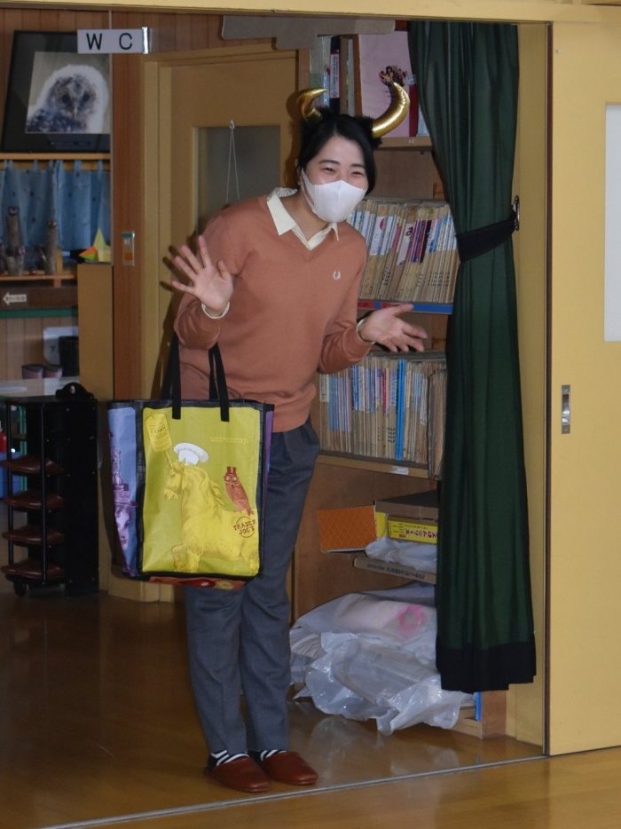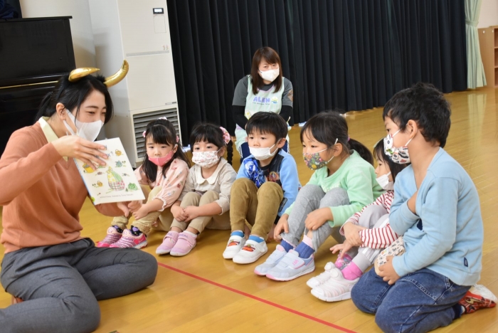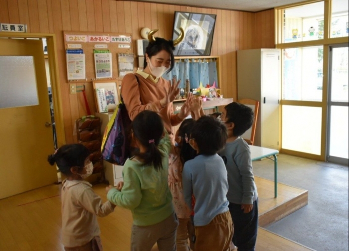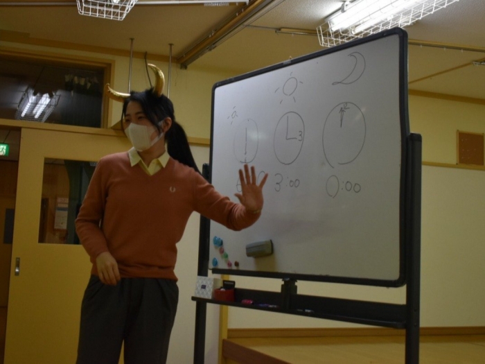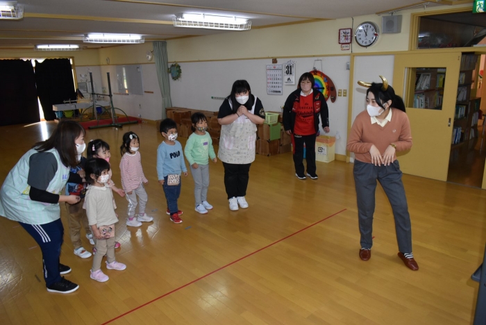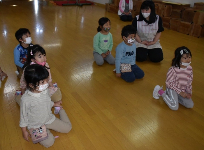 毎年,子ども達が引き込まれる仕掛けや内容を考えてくださるF先生。今日はハロウィンということで,デビルの角を付けて登場してくれました (^^♪ まずは,英語で挨拶&自己紹介! 楽しみ♪ イエーイ!! と飛び跳ねていた姿から一転…,英語で話を振られると「‥‥。」無になる子が続出(笑)でしたが,個々の気持ちを汲んで温かく対応してくださったおかげで,段々と心がほぐれてきた子ども達。その後のゲームでは,素の自分を出せるようになっていました。いつもと違う環境になると緊張が先立つ姿から,少しずつ自己発揮・自己表現していけるように,今後も様々なもの・こと・人と出会う・触れ合う機会を大切にしていきたいと思います。