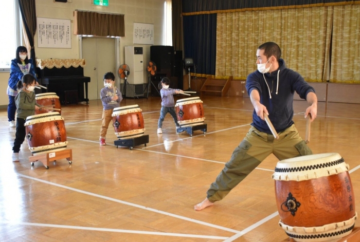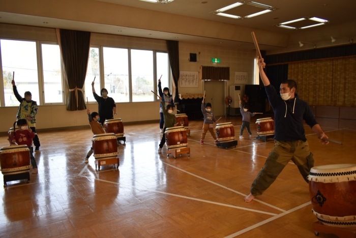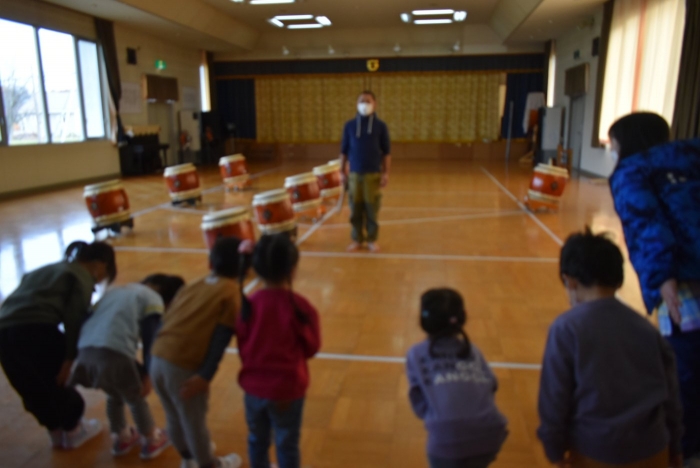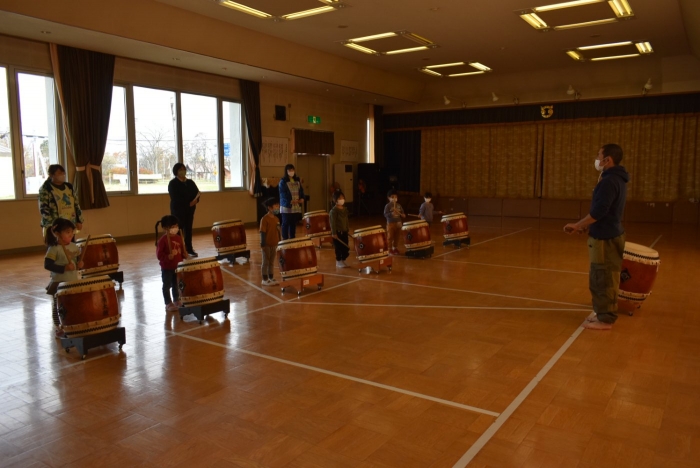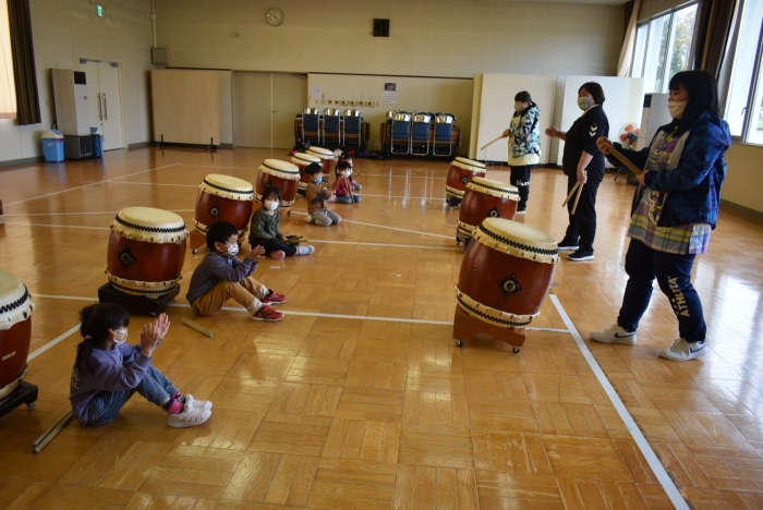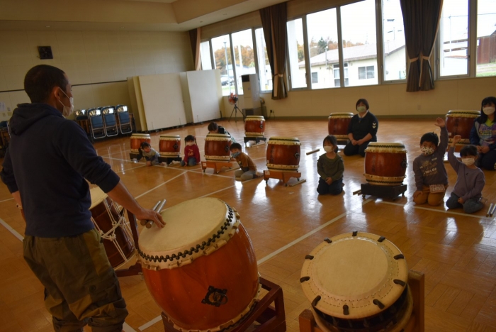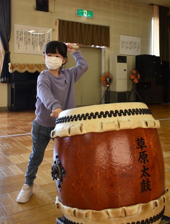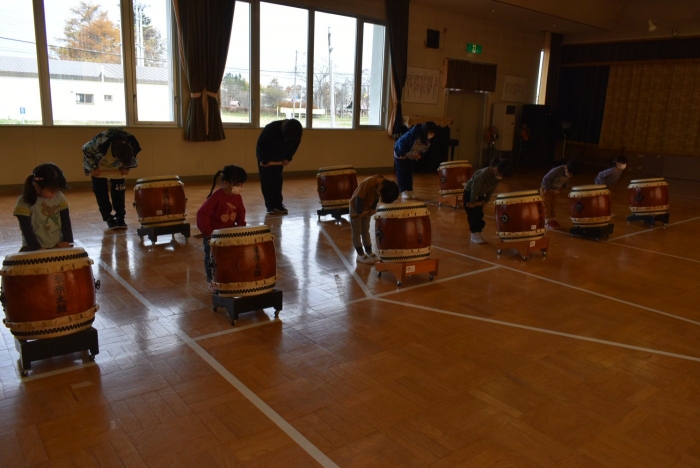 太鼓に向き合う姿勢,礼儀作法から始まり,一丁打ちからテンポを変えての連打といった技をわかりやすく丁寧に教えていただき,最後は全員で合わせ打つことも体験。打ち始め・締めが揃った時の何とも言えない一体感・高揚感を味わっていた子ども達です。今回,体験した『宮太鼓』以外の『小締め』『桶太鼓』『大太鼓』などにも触れさせていただき,音色や響きの違いにも関心を寄せていました。大太鼓での武藤師匠の演奏には,すっかり魅了されていた子ども達。太鼓を打つ時の凛とした空気感,迫力ある力強い音色が,とても心に響いていたようです。