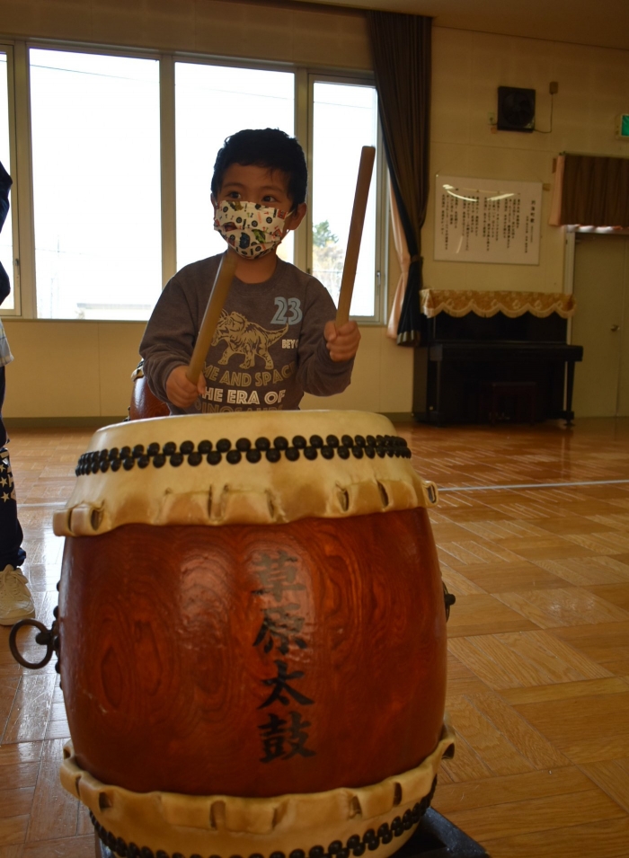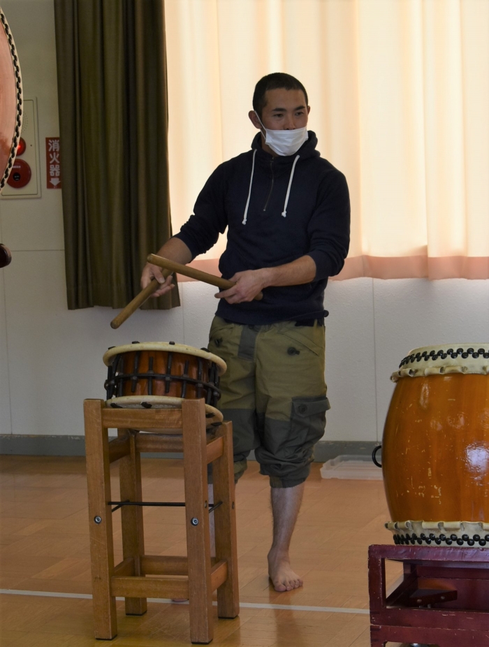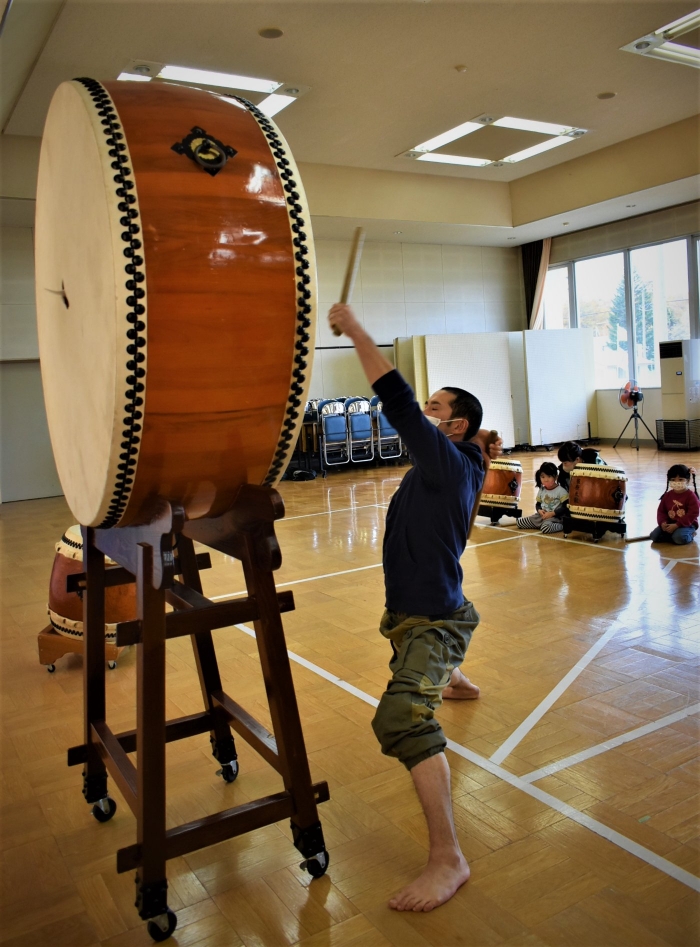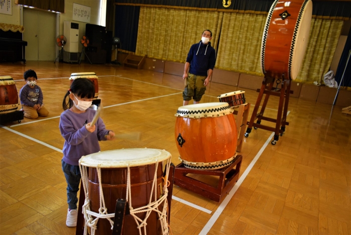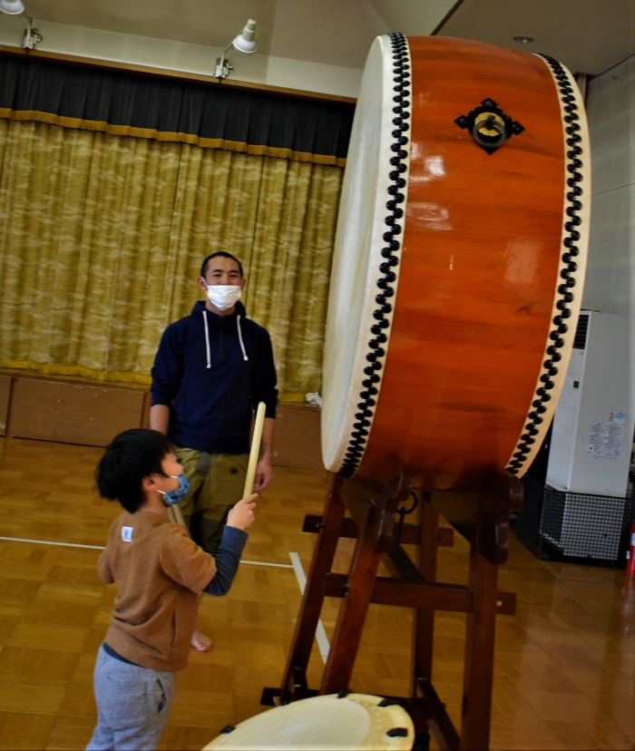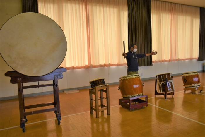 太鼓に向き合う姿勢,礼儀作法から始まり,一丁打ちからテンポを変えての連打といった技をわかりやすく丁寧に教えていただき,最後は全員で合わせ打つことも体験。打ち始め・締めが揃った時の何とも言えない一体感・高揚感を味わっていた子ども達です。今回,体験した『宮太鼓』以外の『小締め』『桶太鼓』『大太鼓』などにも触れさせていただき,音色や響きの違いにも関心を寄せていました。大太鼓での武藤師匠の演奏には,すっかり魅了されていた子ども達。太鼓を打つ時の凛とした空気感,迫力ある力強い音色が,とても心に響いていたようです。