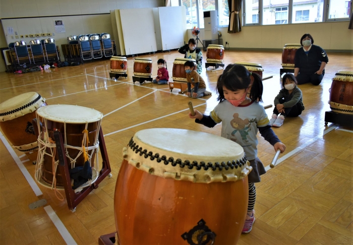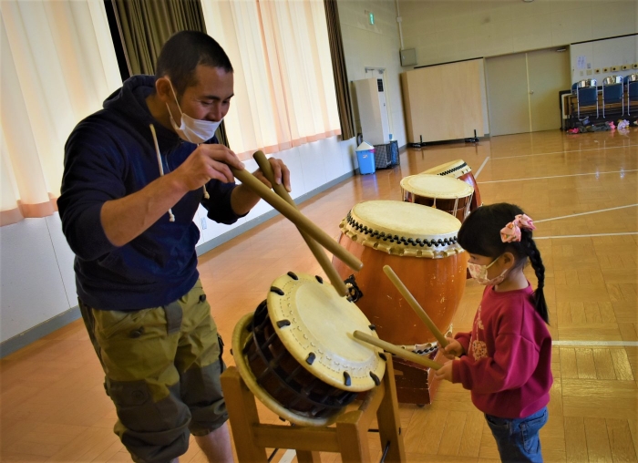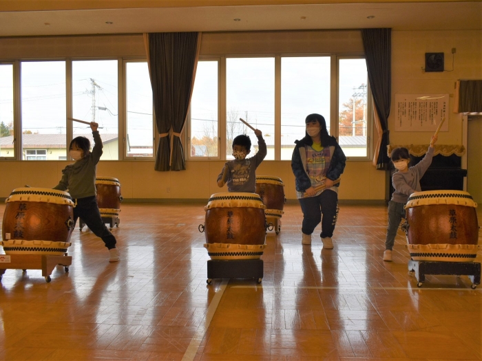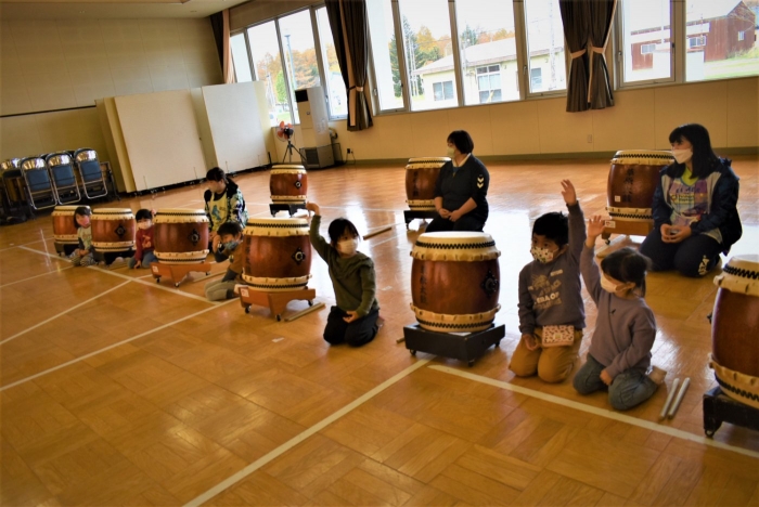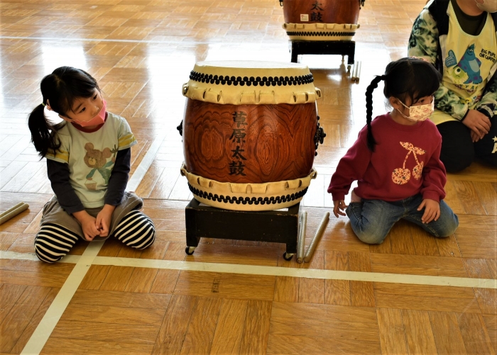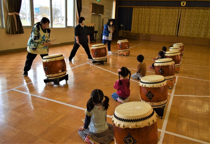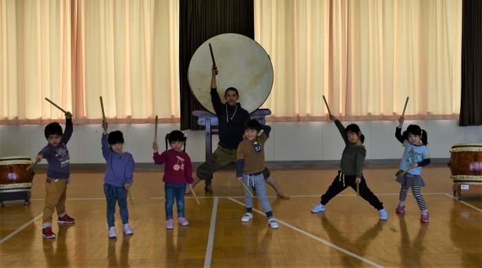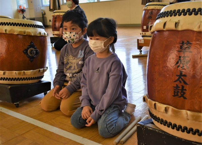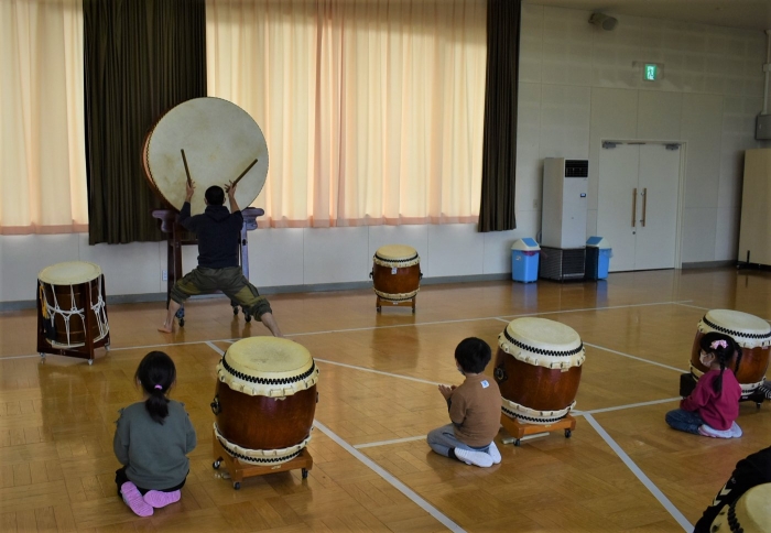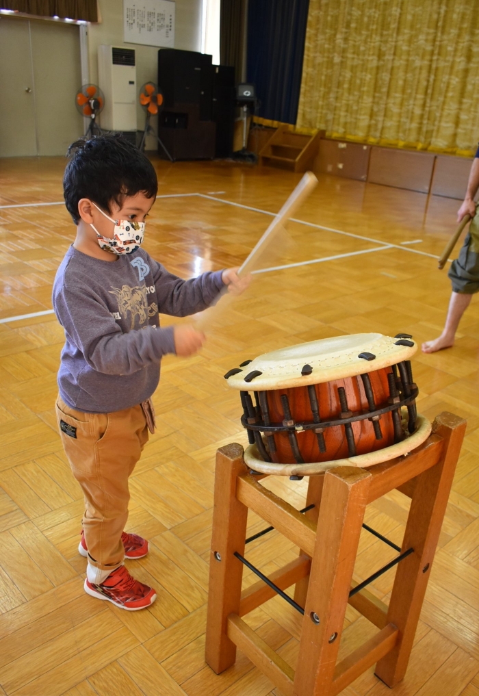 太鼓に向き合う姿勢,礼儀作法から始まり,一丁打ちからテンポを変えての連打といった技をわかりやすく丁寧に教えていただき,最後は全員で合わせ打つことも体験。打ち始め・締めが揃った時の何とも言えない一体感・高揚感を味わっていた子ども達です。今回,体験した『宮太鼓』以外の『小締め』『桶太鼓』『大太鼓』などにも触れさせていただき,音色や響きの違いにも関心を寄せていました。大太鼓での武藤師匠の演奏には,すっかり魅了されていた子ども達。太鼓を打つ時の凛とした空気感,迫力ある力強い音色が,とても心に響いていたようです。