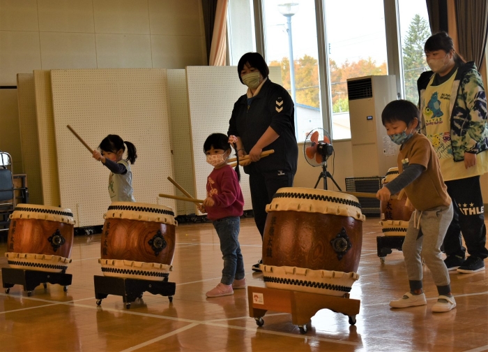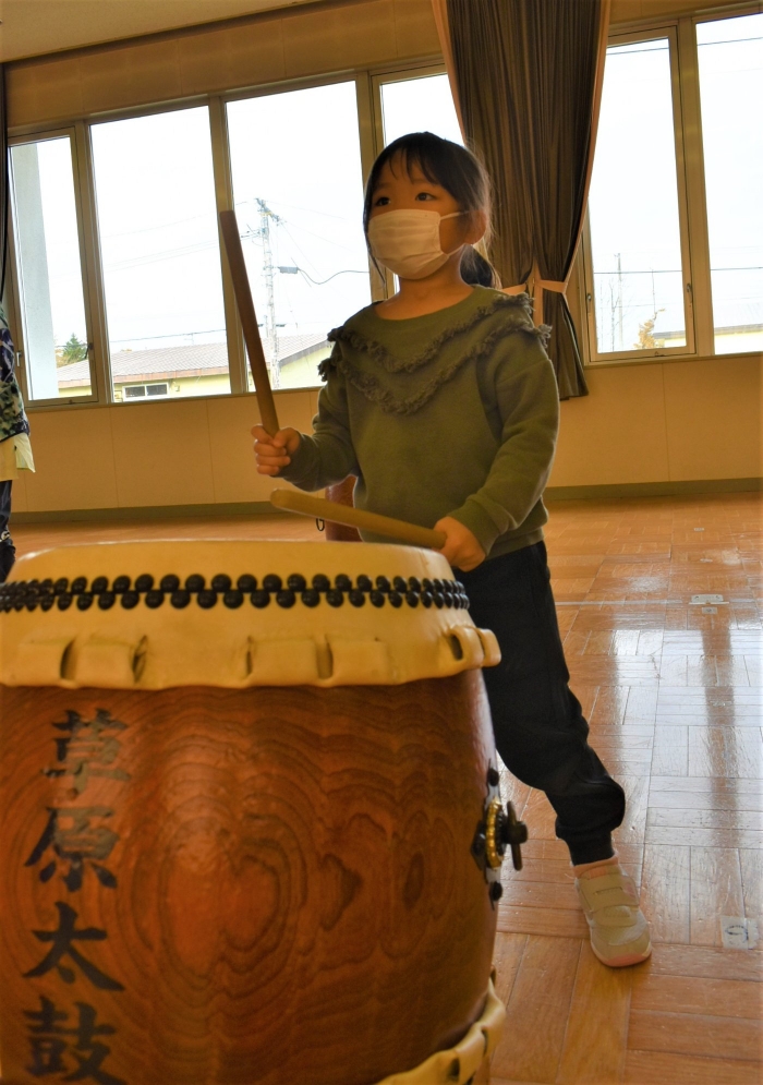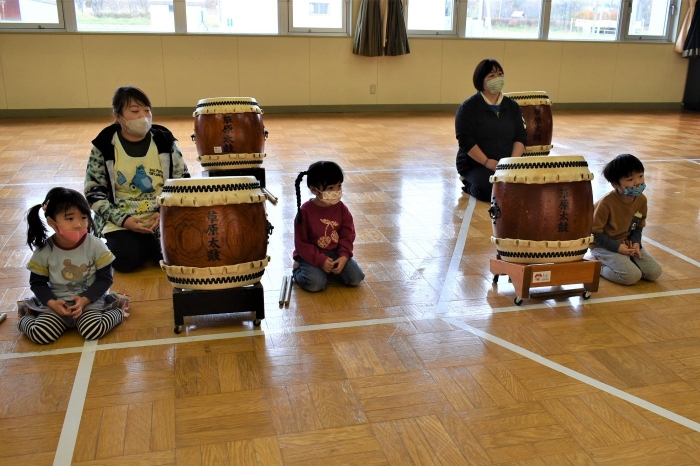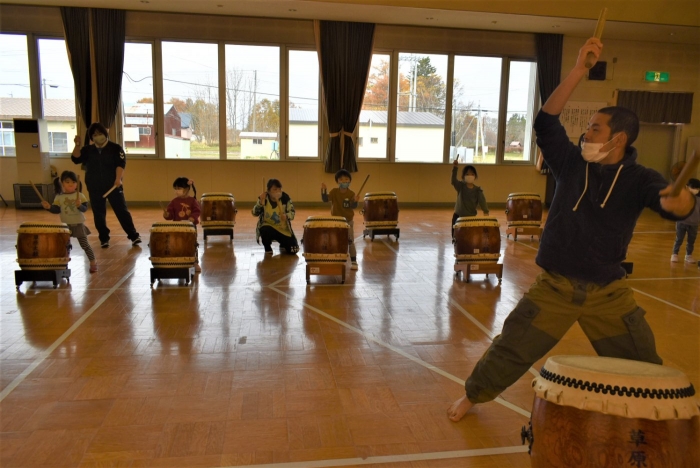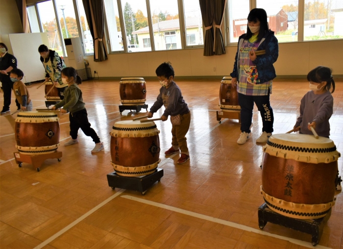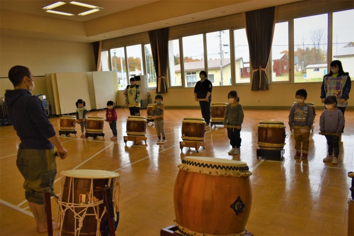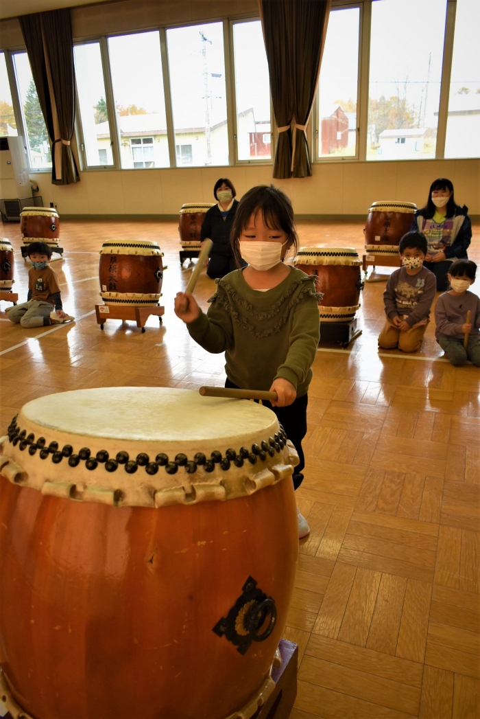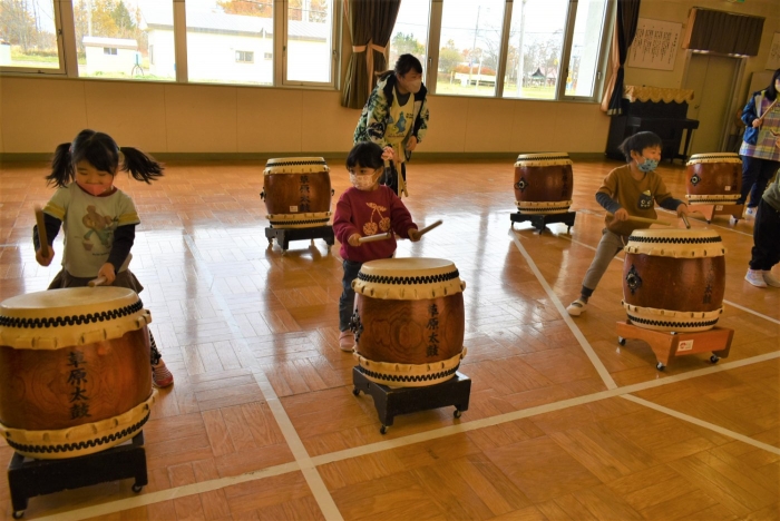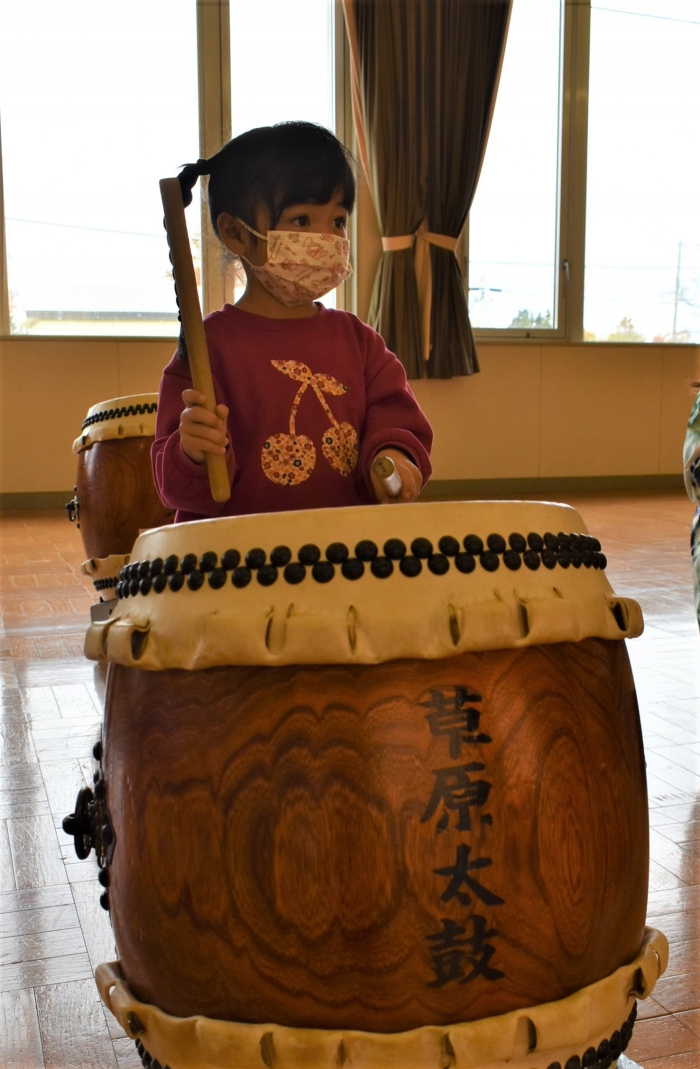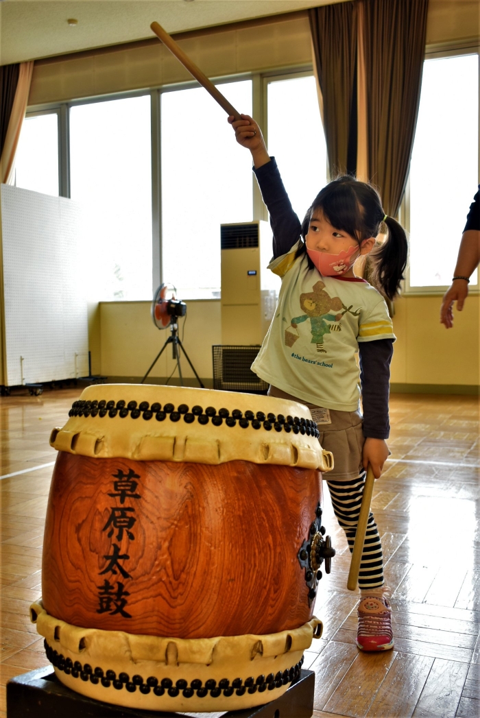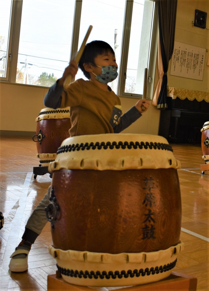 地域の伝統を知るということで,中西別草原太鼓の由来も教えていただいきました。なんと,園児の曽祖父が創立者だったことを知り,みんなで驚いたり, 当事者の園児は誇らしげな表情をみせたりしていました。世代を超え受け継がれたものに触れる…感慨深いものがありますね。