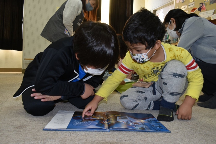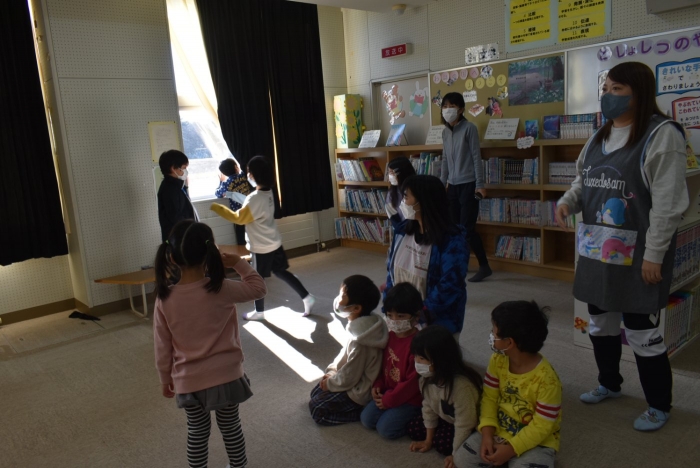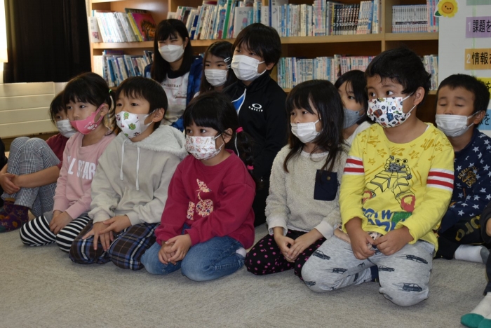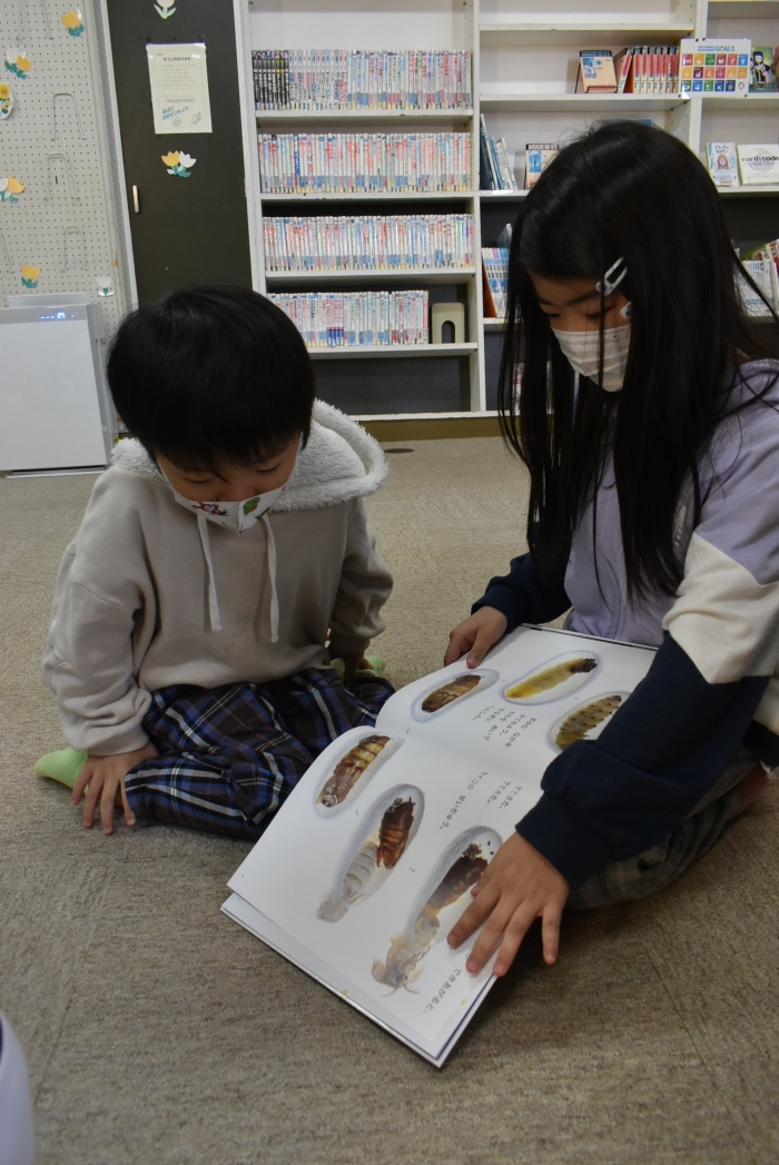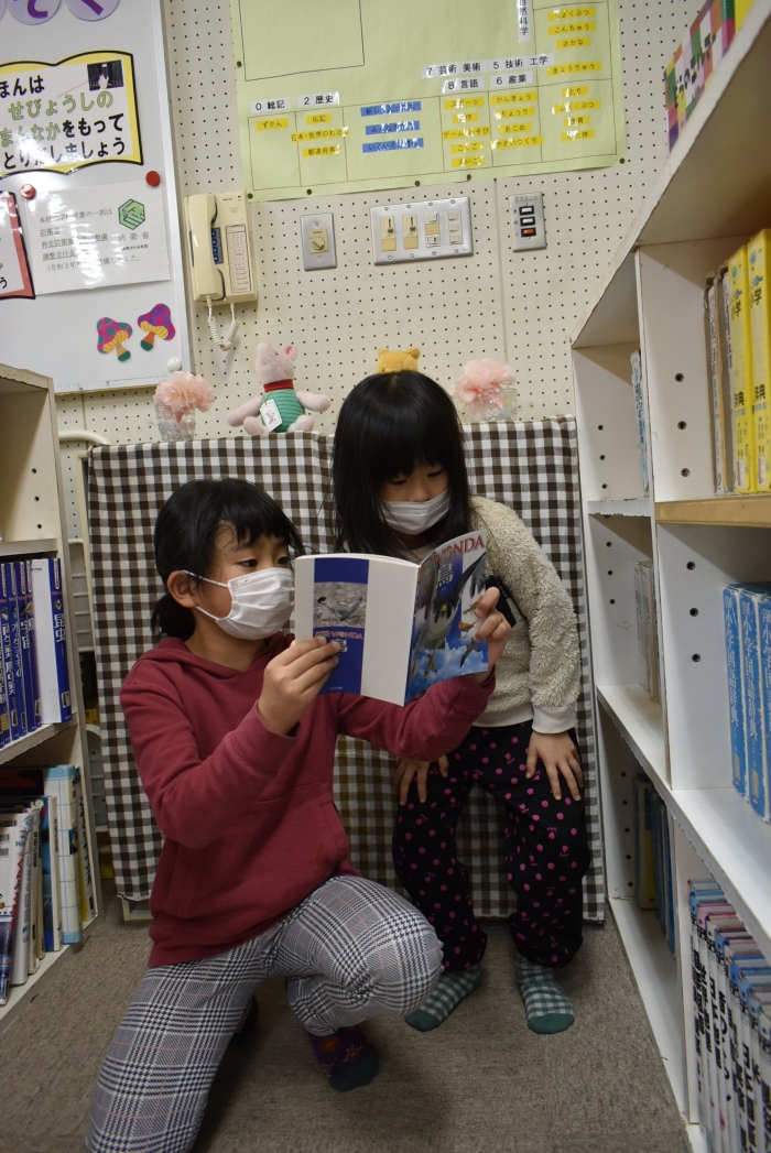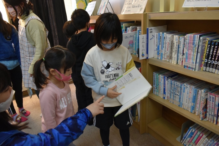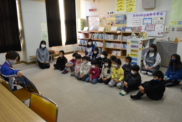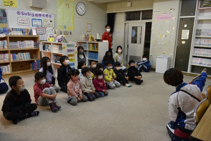小学校では,中休み時間に行っている絵本読み聞かせと,1年生の生活科授業に参加してきました。今回の絵本読み聞かせは,場所をフリースペースから温かな図書室へと変更。初めて入った図書室,壁一面にズラリと並ぶ本の数々に興味津々の様子でした。大型絵本を読み聞かせしてもらったり,小学校のお兄さん・お姉さんのお勧め絵本を紹介してもらったりし,楽しい中休みを時間を過ごしました。