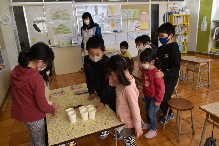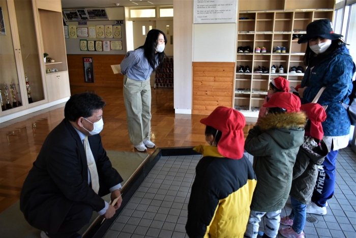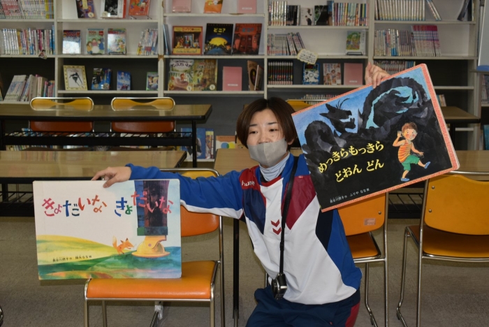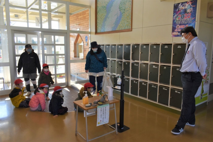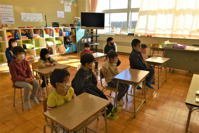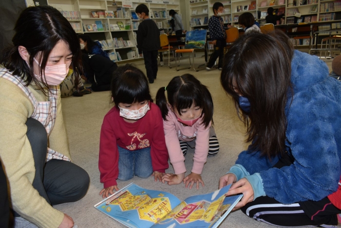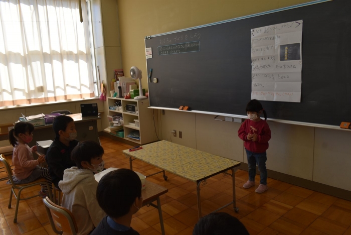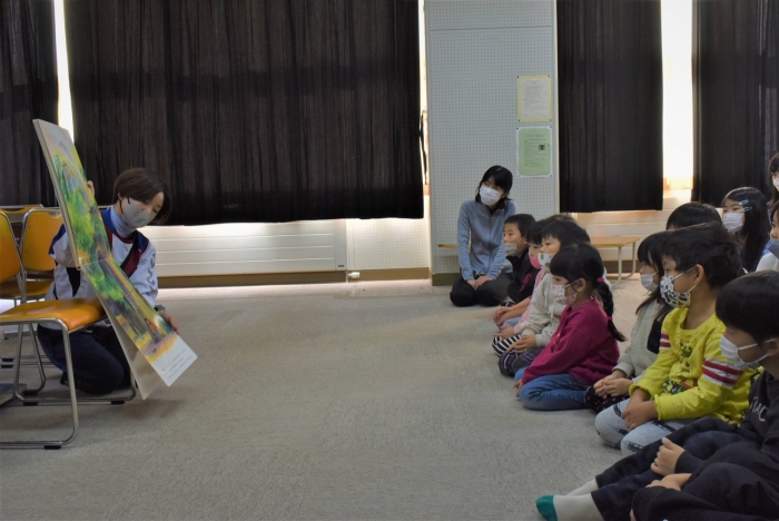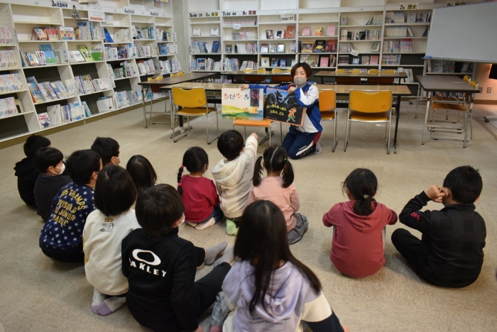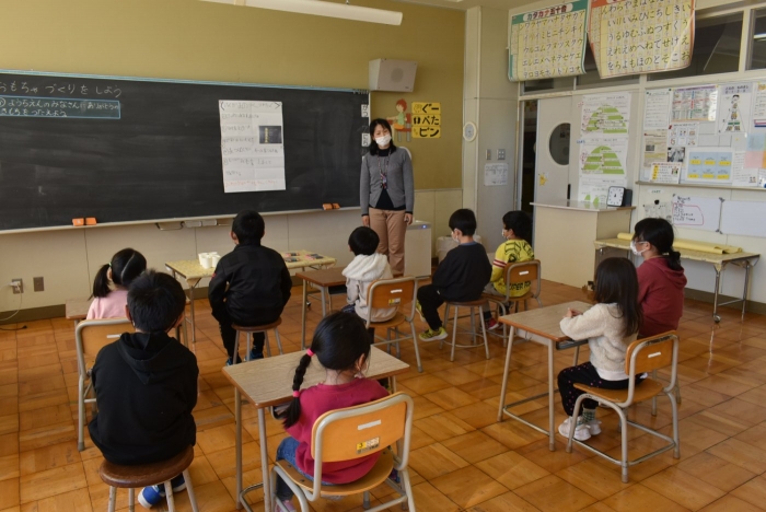 小学校では,中休み時間に行っている絵本読み聞かせと,1年生の生活科授業に参加してきました。今回の絵本読み聞かせは,場所をフリースペースから温かな図書室へと変更。初めて入った図書室,壁一面にズラリと並ぶ本の数々に興味津々の様子でした。大型絵本を読み聞かせしてもらったり,小学校のお兄さん・お姉さんのお勧め絵本を紹介してもらったりし,楽しい中休みを時間を過ごしました。