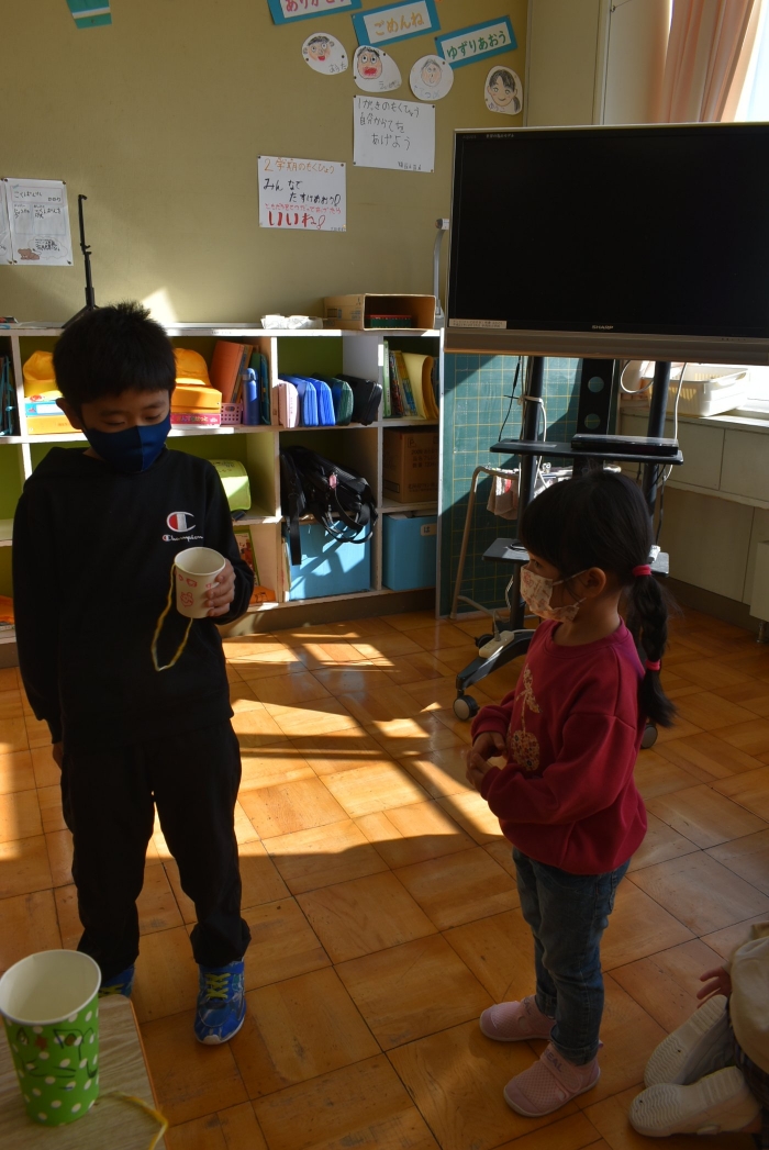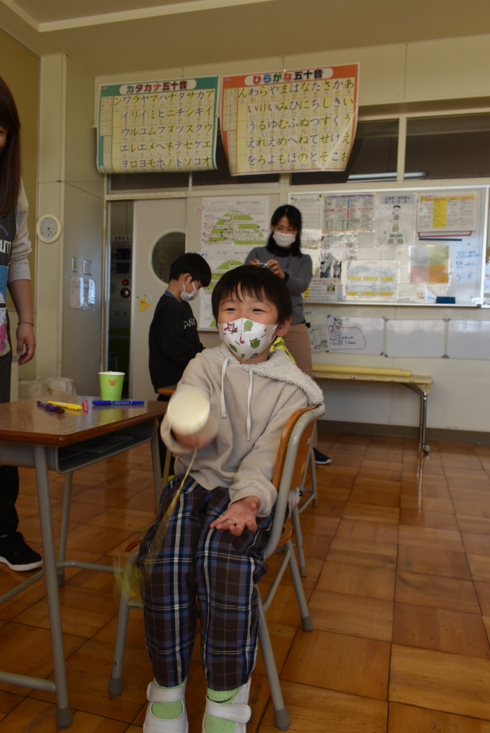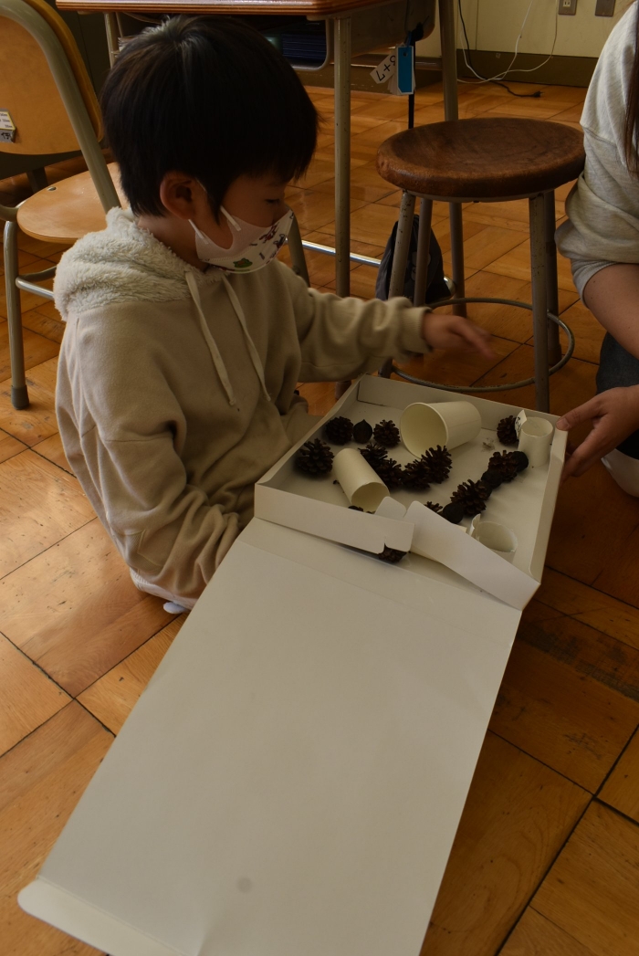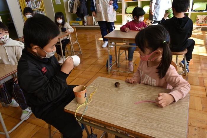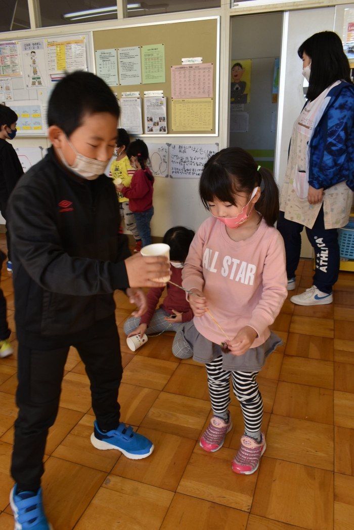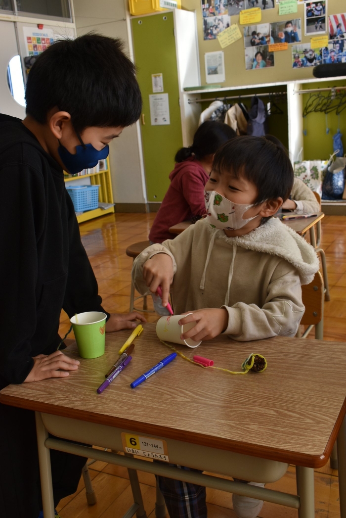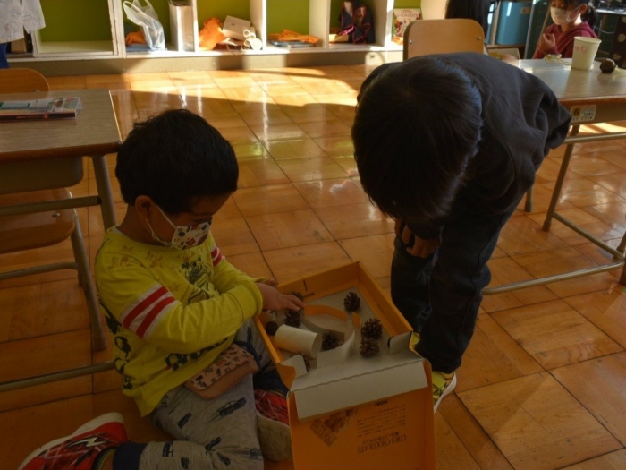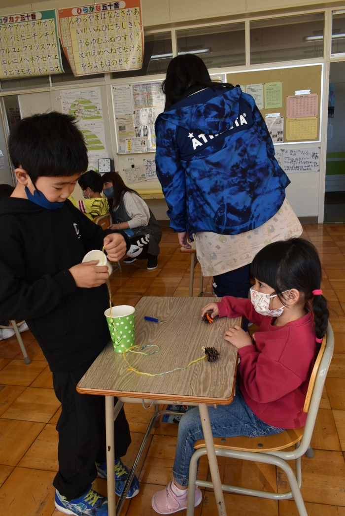 生活科での交流は, 飼育物の観察や秋のもの探しで来園したことへの感謝の思いを伝えたい!という1年生の声から実現しました。そう思ってもらえるなんて,嬉しい気持ちでいっぱいです。教室では,普段1年生が使っている机と椅子に園児が座らせてもらい,小学生気分まで味あわせてもらいました (^^♪ 1年生のリードの元,幼稚園で見つけたマツボックリを使った『けん玉』作りを教えてもらったり,作ったけん玉で一緒に遊んだりし,楽しさ溢れる表情の子ども達でした。なんと,園児一人一人へ思いを込めて作った『ドングリ迷路』もプレゼントしてもらいました☆彡 最後に時間をいただき,園児から1年生へ,嬉しい,楽しい思いを言葉にして伝えることができました。