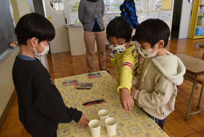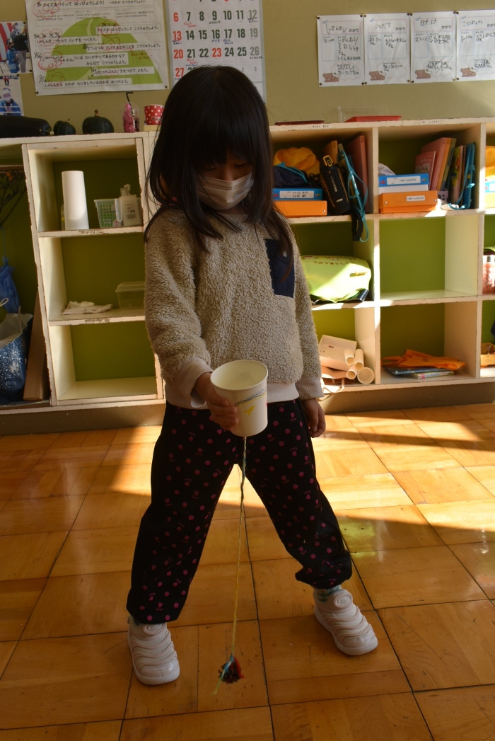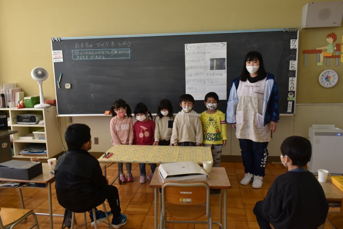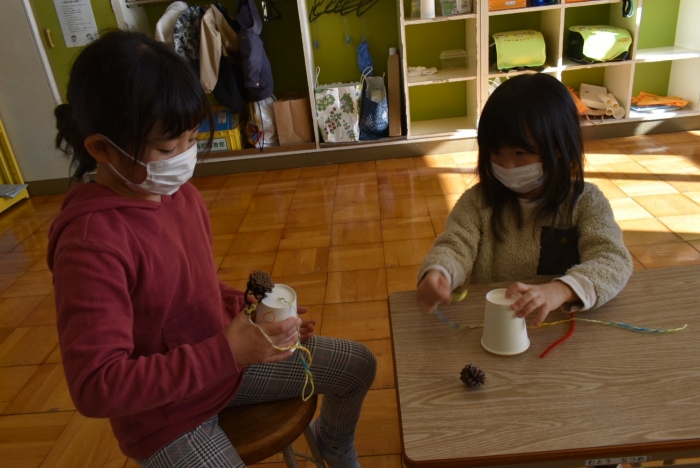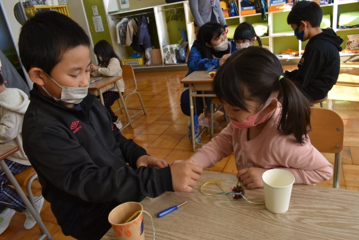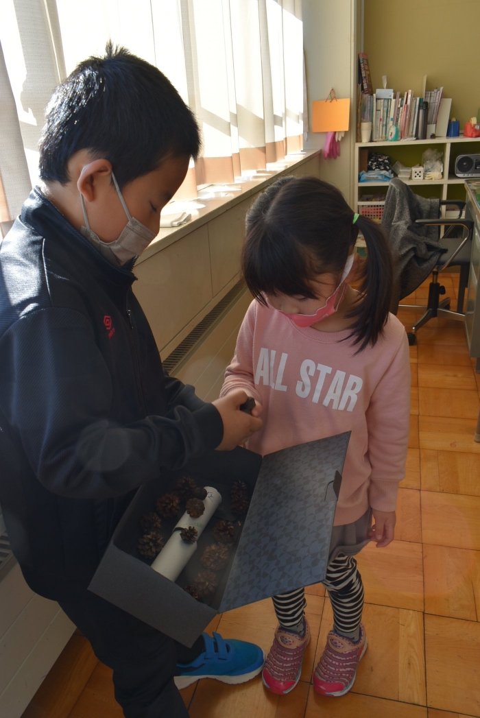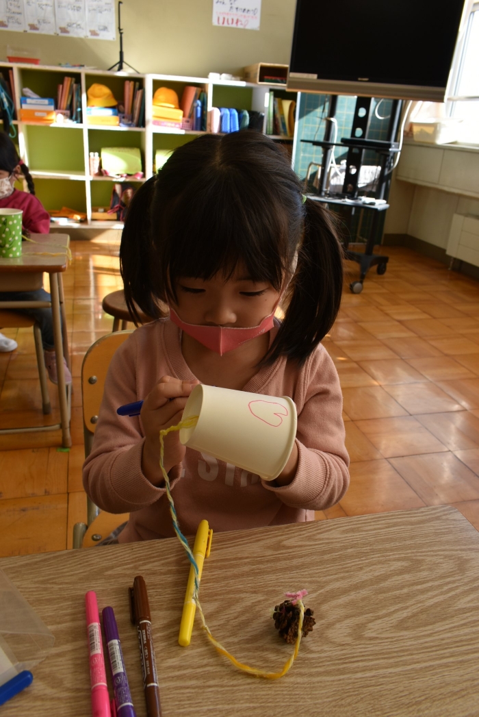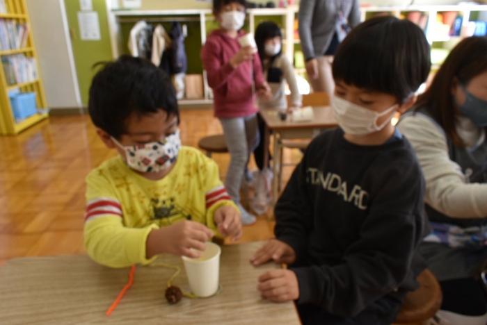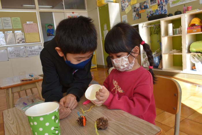 生活科での交流は, 飼育物の観察や秋のもの探しで来園したことへの感謝の思いを伝えたい!という1年生の声から実現しました。そう思ってもらえるなんて,嬉しい気持ちでいっぱいです。教室では,普段1年生が使っている机と椅子に園児が座らせてもらい,小学生気分まで味あわせてもらいました (^^♪ 1年生のリードの元,幼稚園で見つけたマツボックリを使った『けん玉』作りを教えてもらったり,作ったけん玉で一緒に遊んだりし,楽しさ溢れる表情の子ども達でした。なんと,園児一人一人へ思いを込めて作った『ドングリ迷路』もプレゼントしてもらいました☆彡 最後に時間をいただき,園児から1年生へ,嬉しい,楽しい思いを言葉にして伝えることができました。