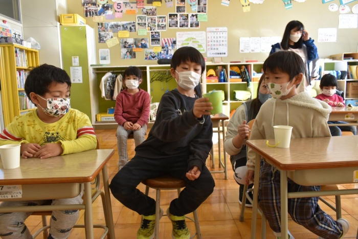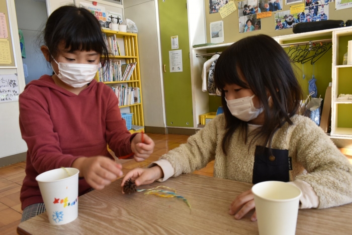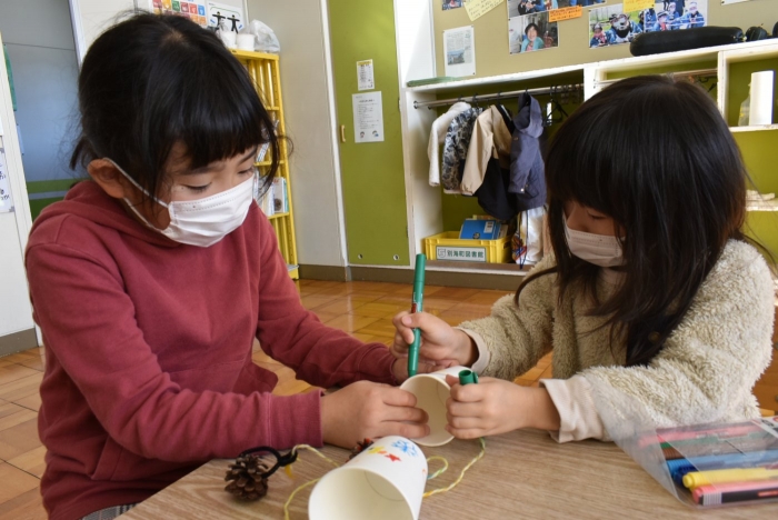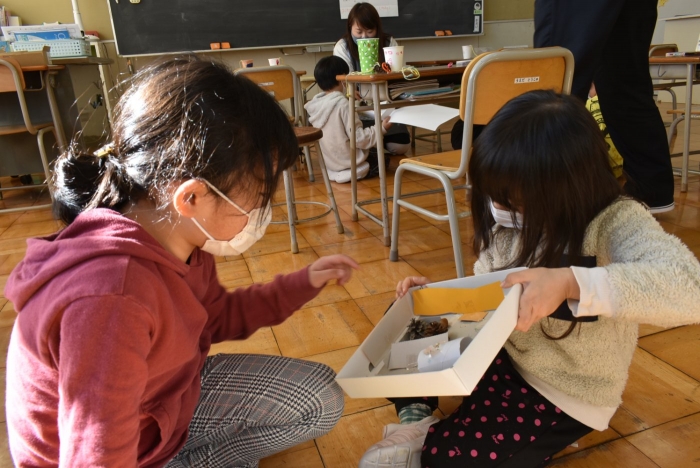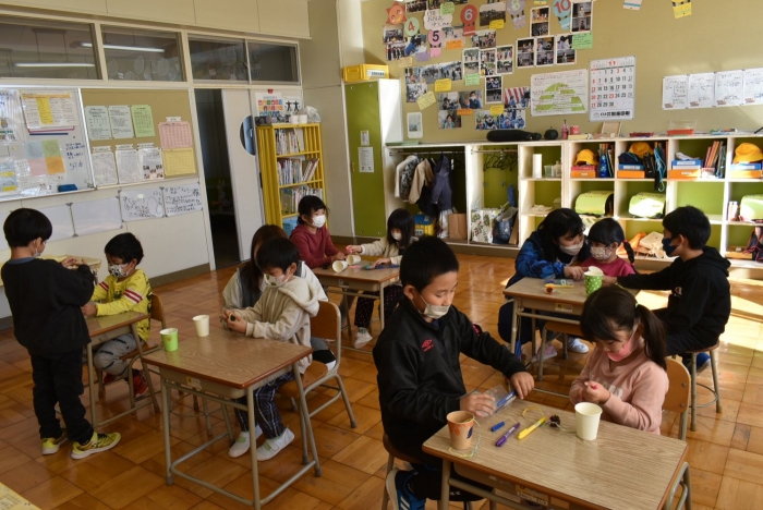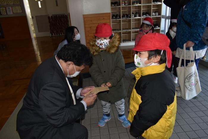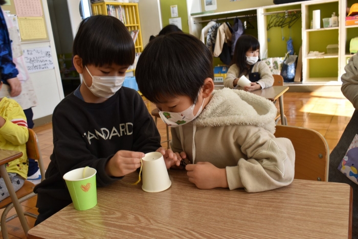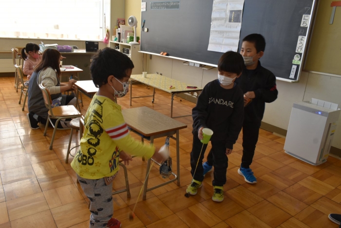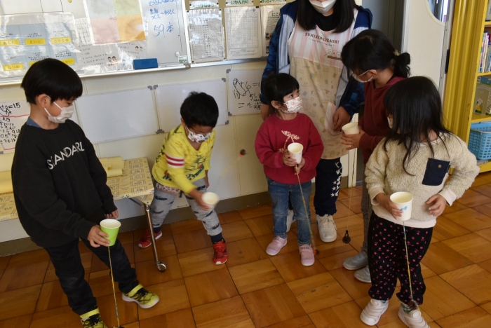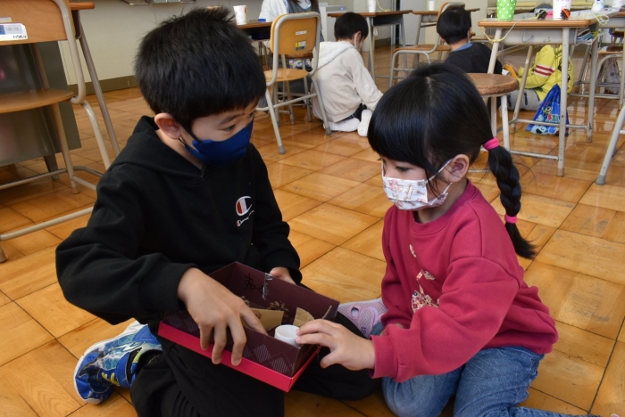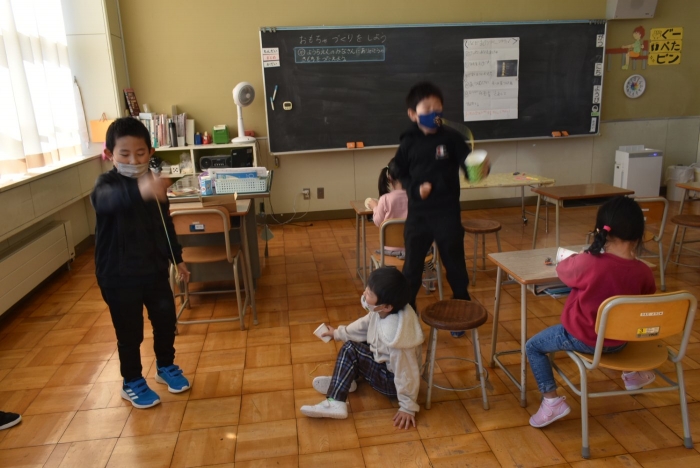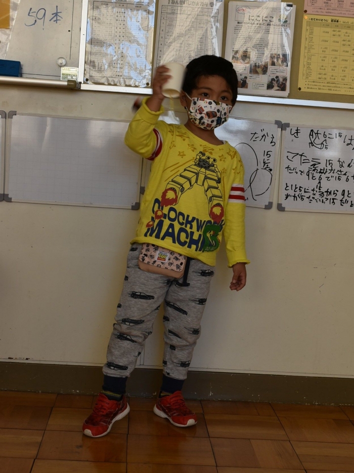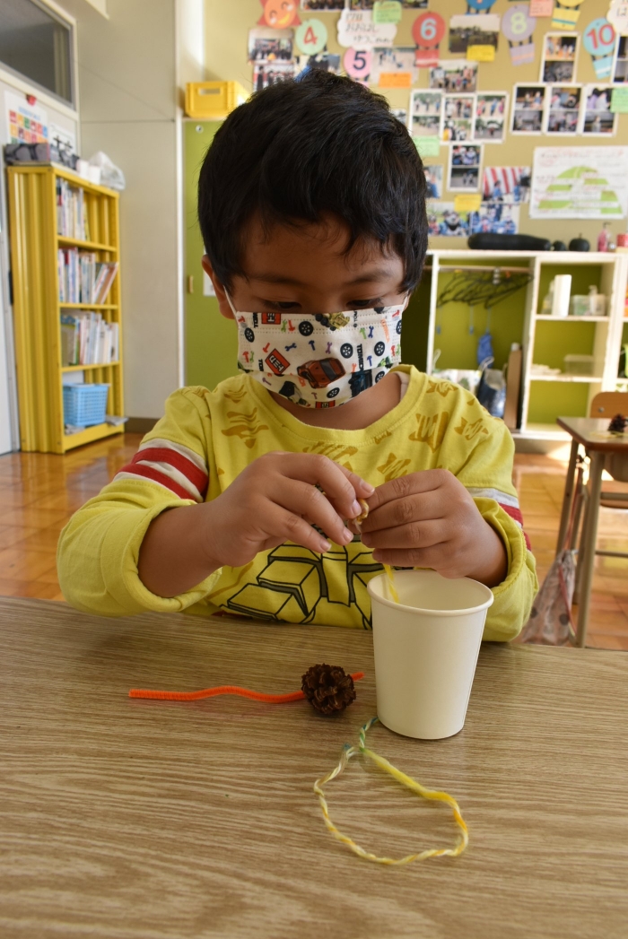 生活科での交流は, 飼育物の観察や秋のもの探しで来園したことへの感謝の思いを伝えたい!という1年生の声から実現しました。そう思ってもらえるなんて,嬉しい気持ちでいっぱいです。教室では,普段1年生が使っている机と椅子に園児が座らせてもらい,小学生気分まで味あわせてもらいました (^^♪ 1年生のリードの元,幼稚園で見つけたマツボックリを使った『けん玉』作りを教えてもらったり,作ったけん玉で一緒に遊んだりし,楽しさ溢れる表情の子ども達でした。なんと,園児一人一人へ思いを込めて作った『ドングリ迷路』もプレゼントしてもらいました☆彡 最後に時間をいただき,園児から1年生へ,嬉しい,楽しい思いを言葉にして伝えることができました。