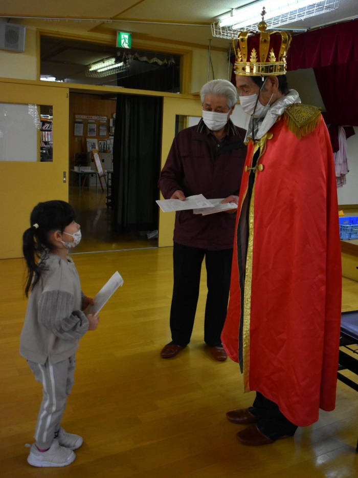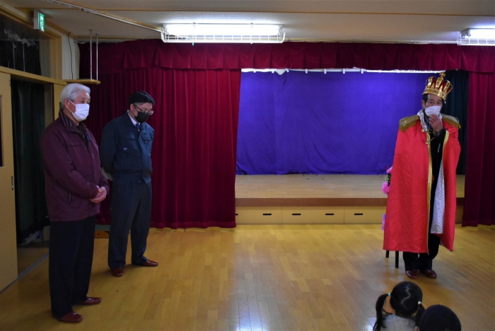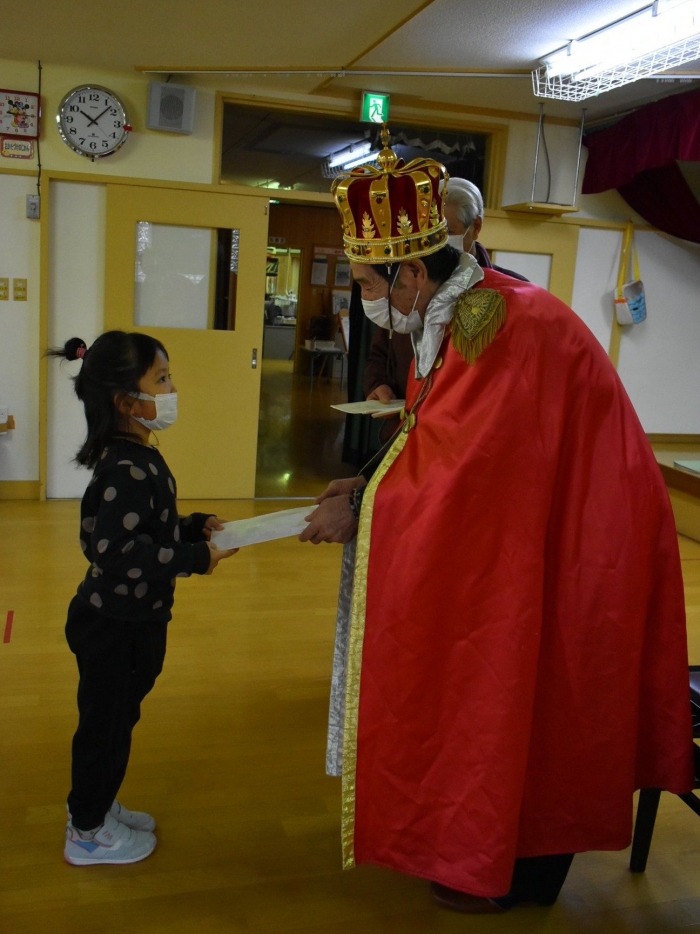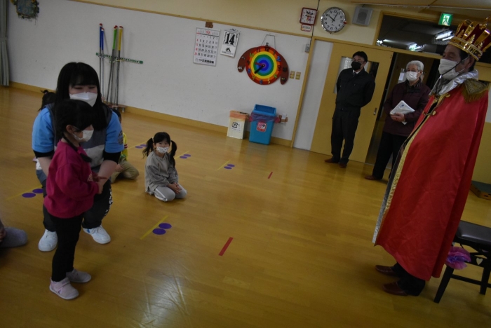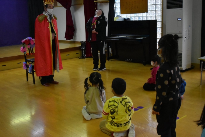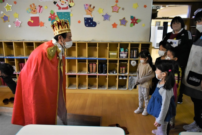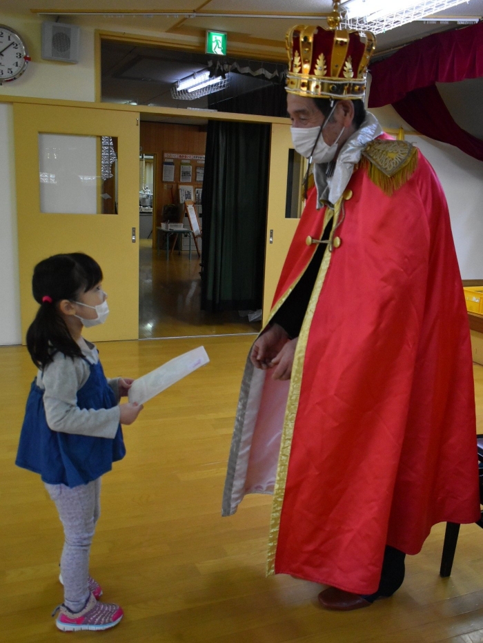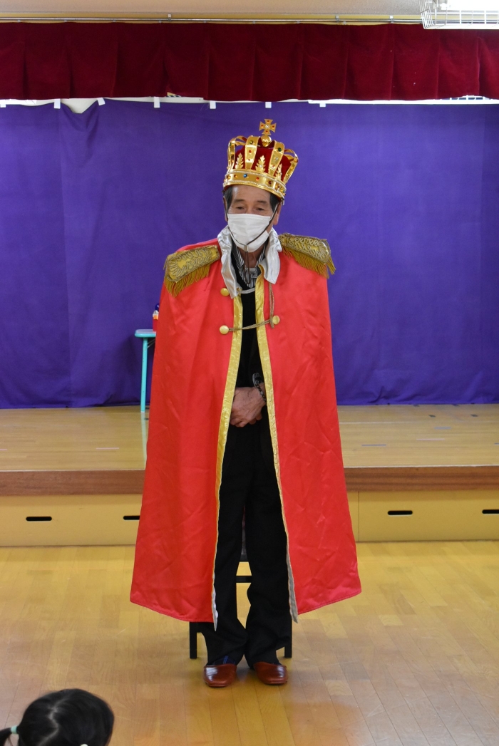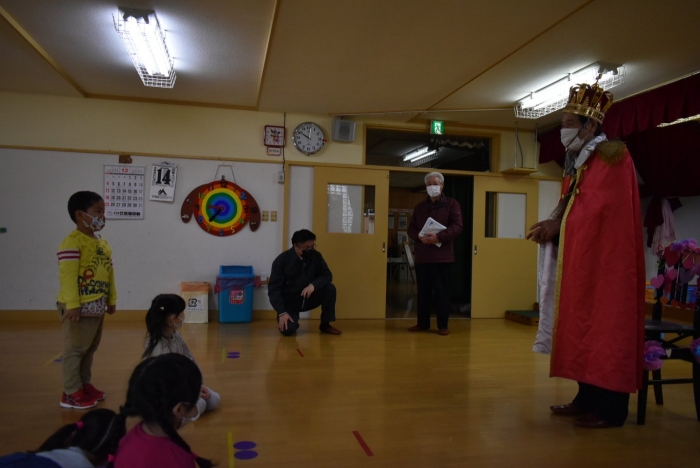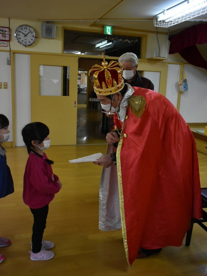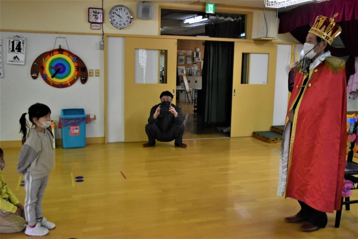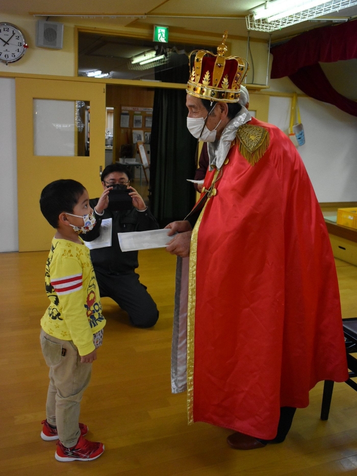 心待ちにしていた王様が来園し,拍手でお出迎え! 輝く冠に,真っ赤なマント姿の王様を食い入るように見つめる子ども達の眼差しが,純粋でとても可愛かったです。 王様から「いい子の皆さんは…」という言葉が出るたびに姿勢をピシッ!(笑),しっかり話を聞こうと意識していた姿もステキでした。 少し緊張気味だった子も,王様の穏やかで温かな雰囲気に気持もほぐれ,質問コーナーでは全員が挙手! それぞれが聞いてみたかったことを質問することができ,それに対し温かく答えてくださった王様です。一人ひとりにプレゼントも手渡していただき,笑顔いっぱいの子ども達でした。