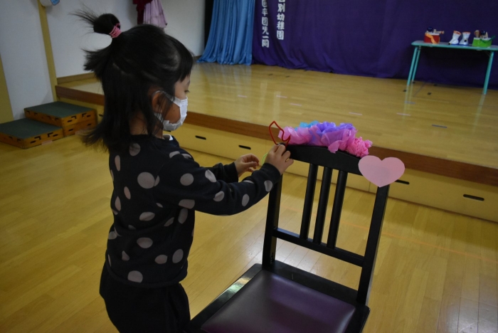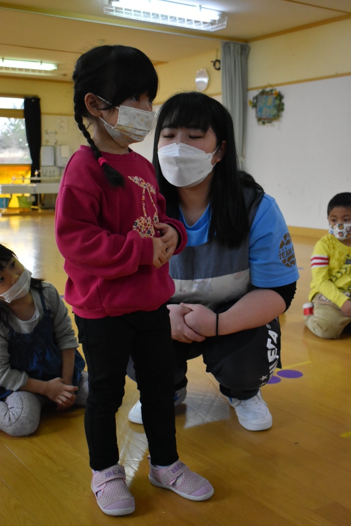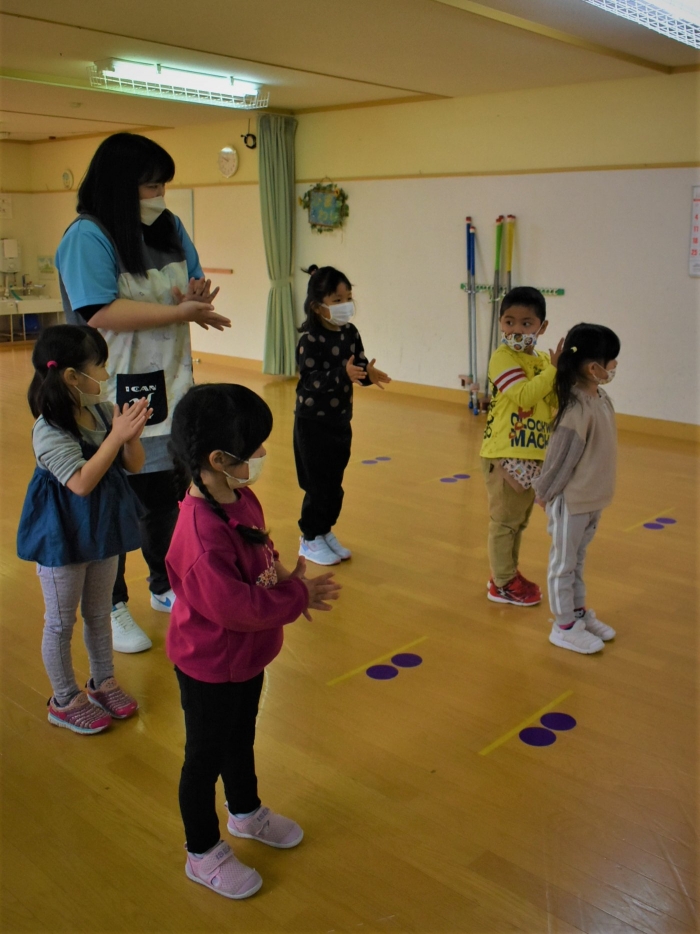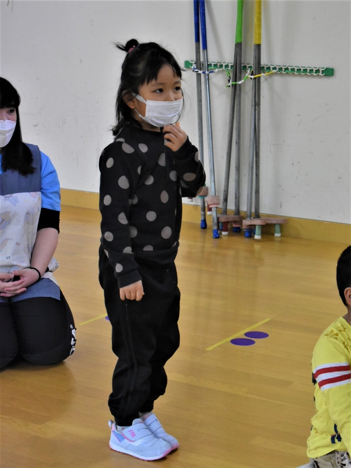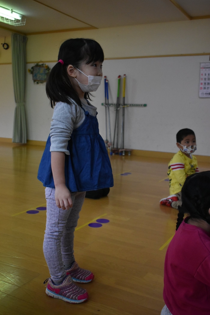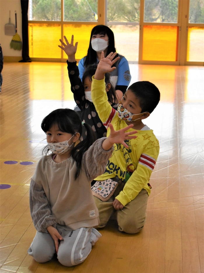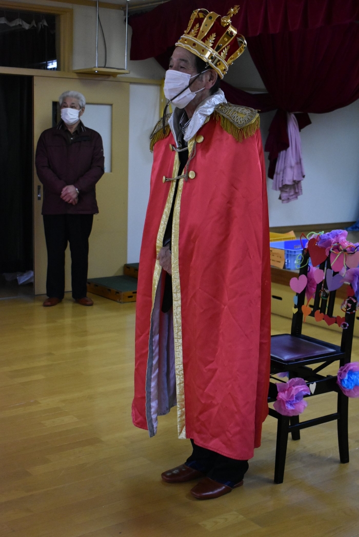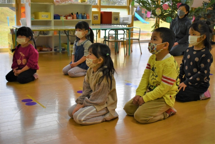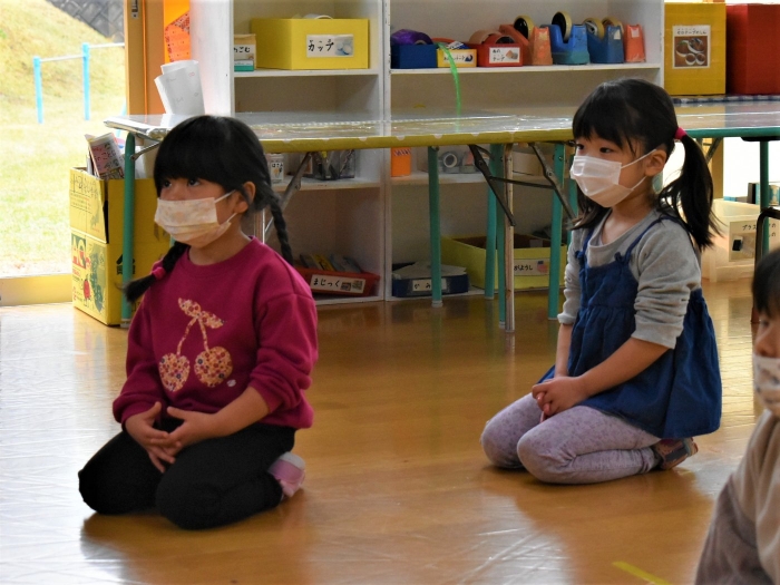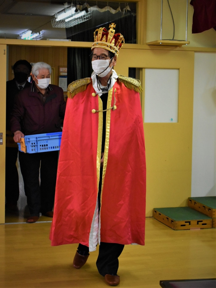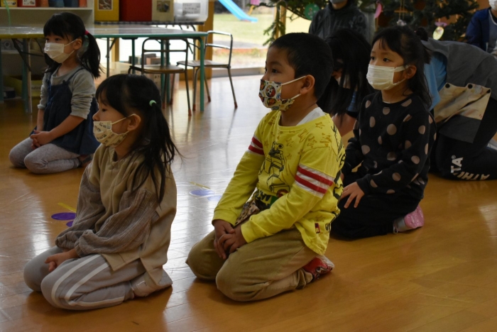 心待ちにしていた王様が来園し,拍手でお出迎え! 輝く冠に,真っ赤なマント姿の王様を食い入るように見つめる子ども達の眼差しが,純粋でとても可愛かったです。 王様から「いい子の皆さんは…」という言葉が出るたびに姿勢をピシッ!(笑),しっかり話を聞こうと意識していた姿もステキでした。 少し緊張気味だった子も,王様の穏やかで温かな雰囲気に気持もほぐれ,質問コーナーでは全員が挙手! それぞれが聞いてみたかったことを質問することができ,それに対し温かく答えてくださった王様です。一人ひとりにプレゼントも手渡していただき,笑顔いっぱいの子ども達でした。
