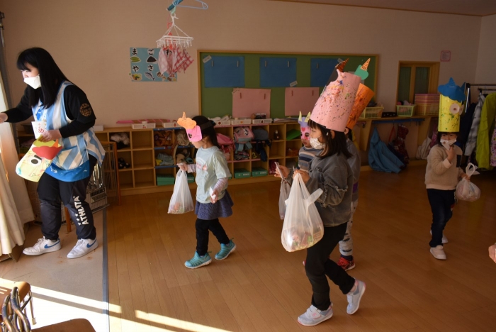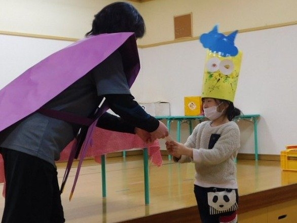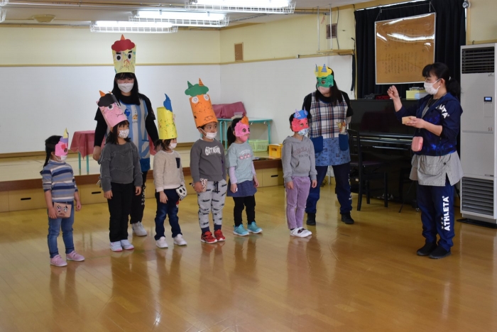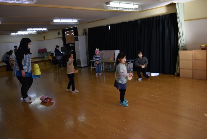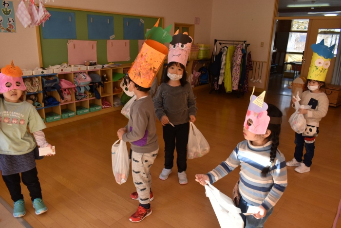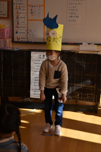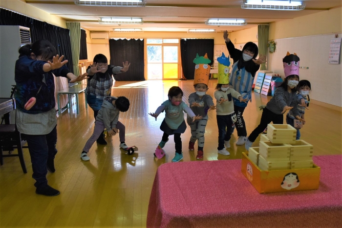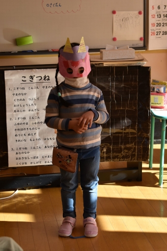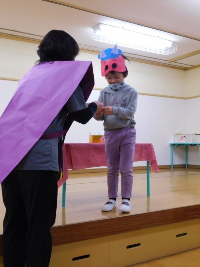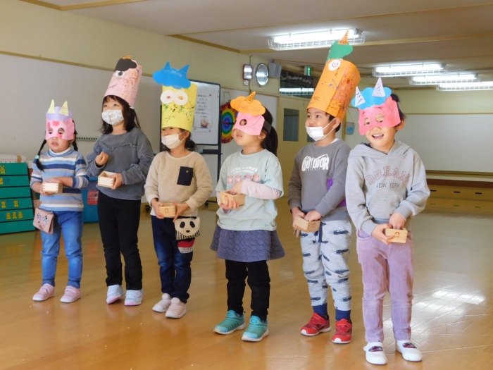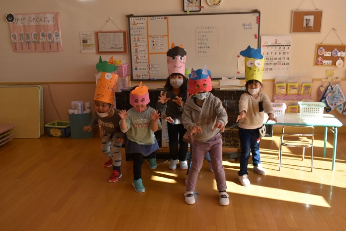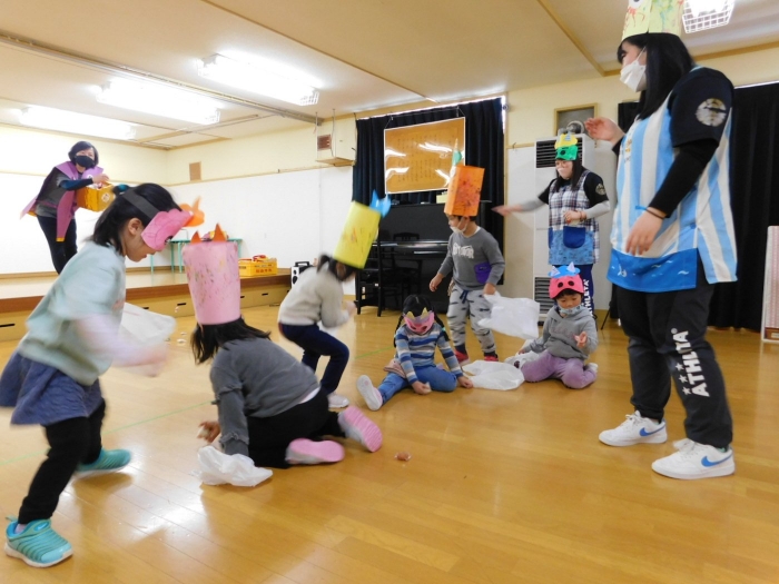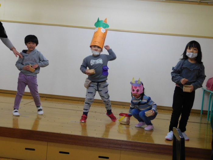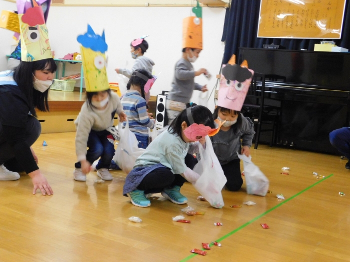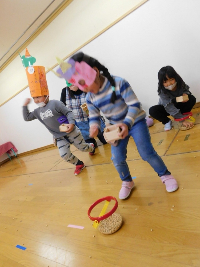 2月3日は『節分』,幼稚園でも『豆まき会』を開き,日本の伝統的な年中行事に親しみました。改めて『節分』の由来について聞き,オニを払う大豆にパワーを注入した後,自分の中に居るオニを追い出そう!! 病気の元を追い払おう!! と,意気揚々と豆まきを行いました。
