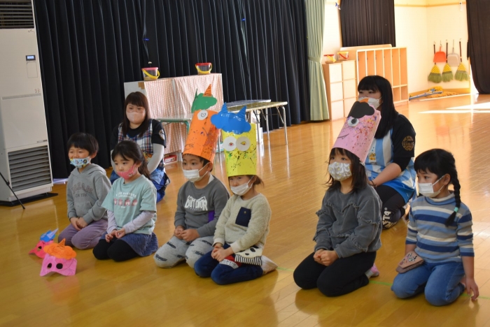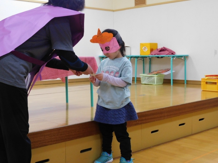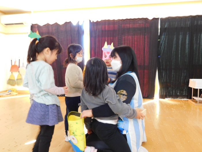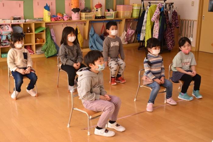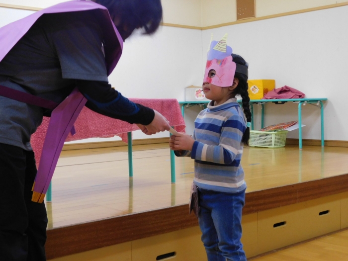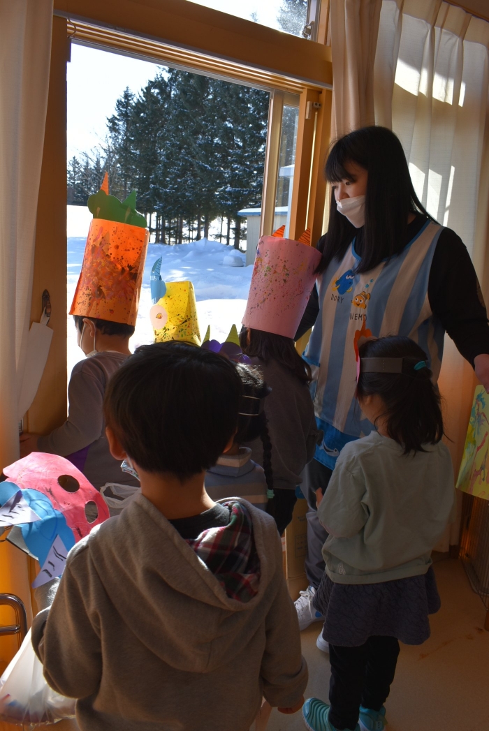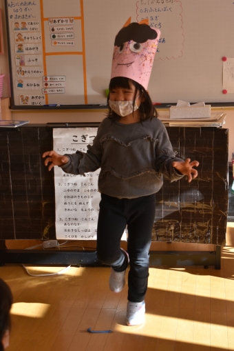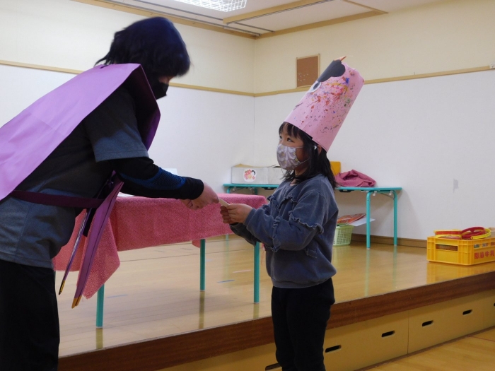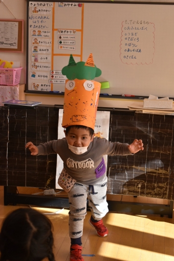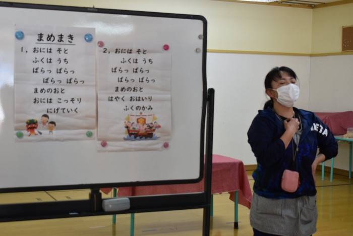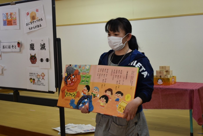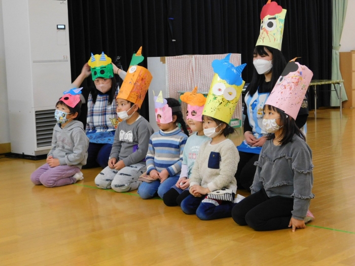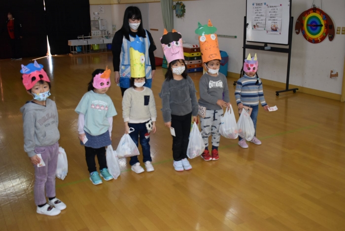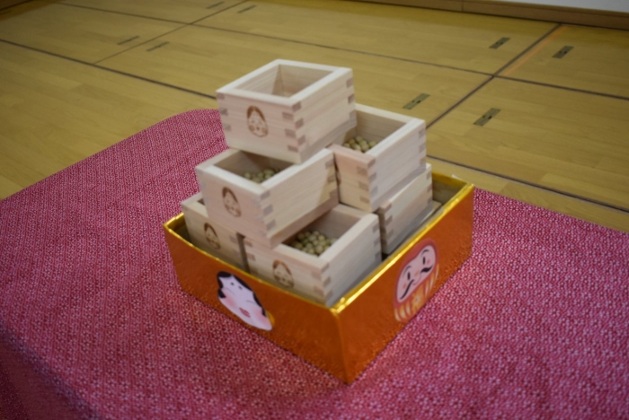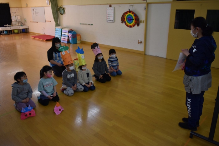 2月3日は『節分』,幼稚園でも『豆まき会』を開き,日本の伝統的な年中行事に親しみました。改めて『節分』の由来について聞き,オニを払う大豆にパワーを注入した後,自分の中に居るオニを追い出そう!! 病気の元を追い払おう!! と,意気揚々と豆まきを行いました。
