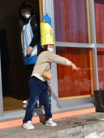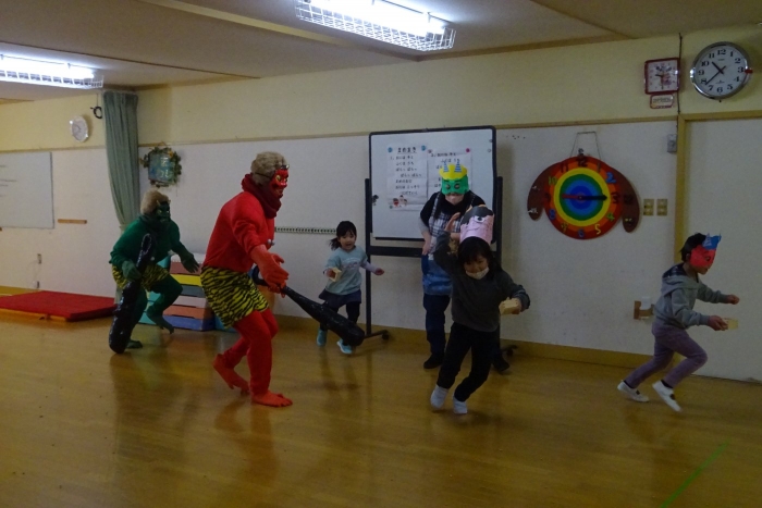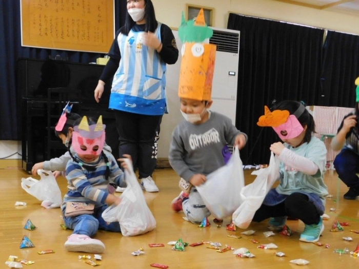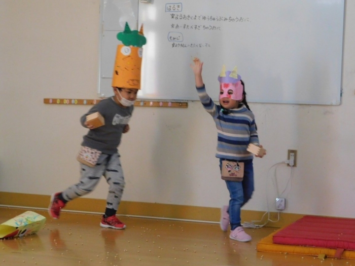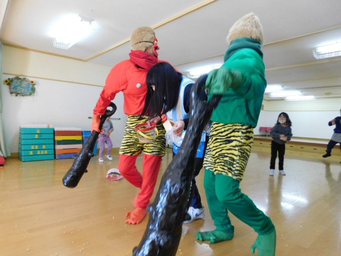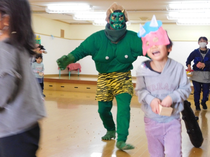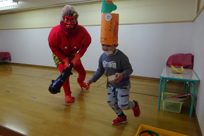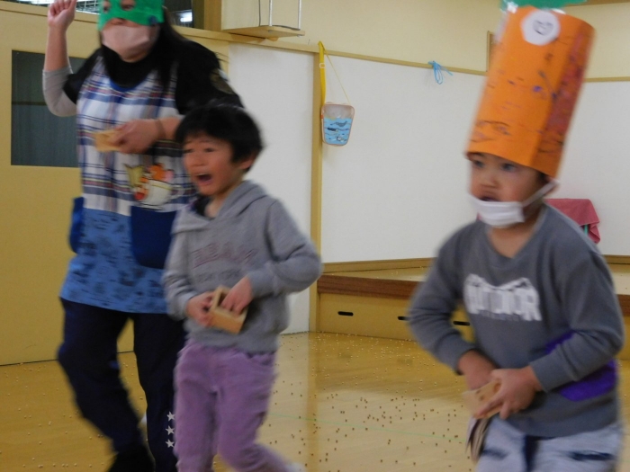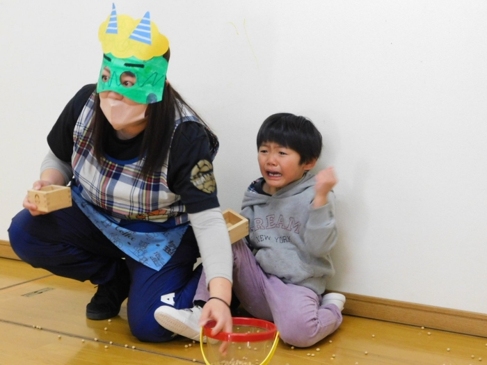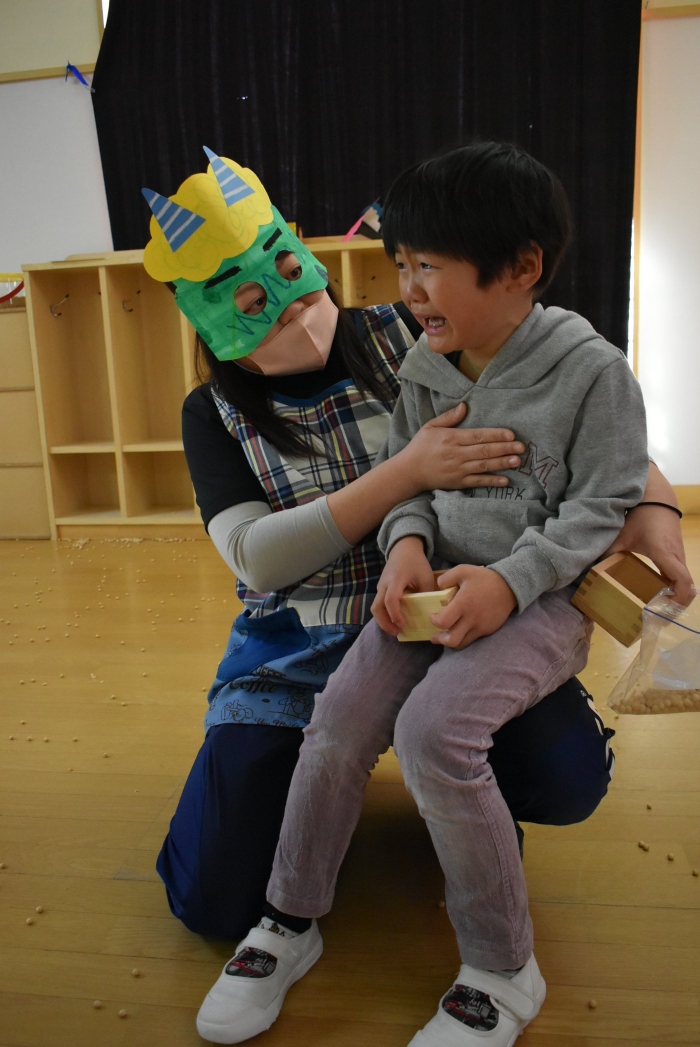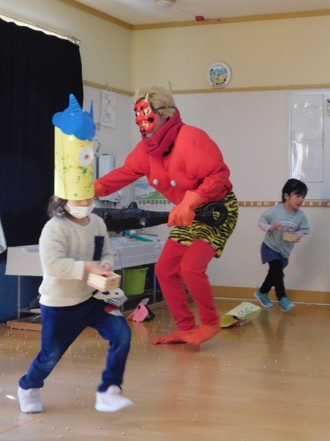 もちろん,今年もオニがやって来ました。豆まきを終えると,突然,怒涛のような太鼓の音と雄叫びが! 一瞬ときが止まり…勢いよく扉が開いたと同時に「悪い子はいねぇかー!!」と赤鬼が乱入! 悲鳴をあげ後ずさると,今度は窓から緑鬼が乱入!! 金棒を叩きつけ大迫力の鬼たちに挟み撃ちされ,この世の終わりのような状態だった子ども達です。泣きながらも,『豆』=『魔滅』の一粒に大きな威力があることを信じ,「鬼は~そと!」と果敢に挑む子が大勢いました。見事,オニを追い払い,頑張った自分を感じながら後片付けをしていた子ども達。その後,少しの物音でもビクッとなっていましたが,清々しい気持ちになったことでしょう!