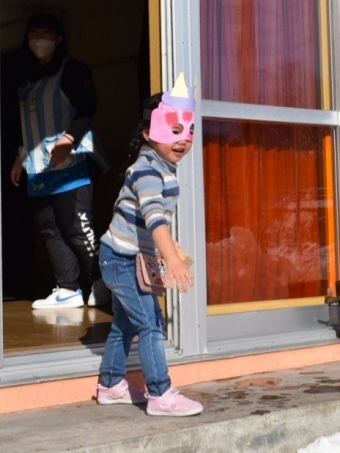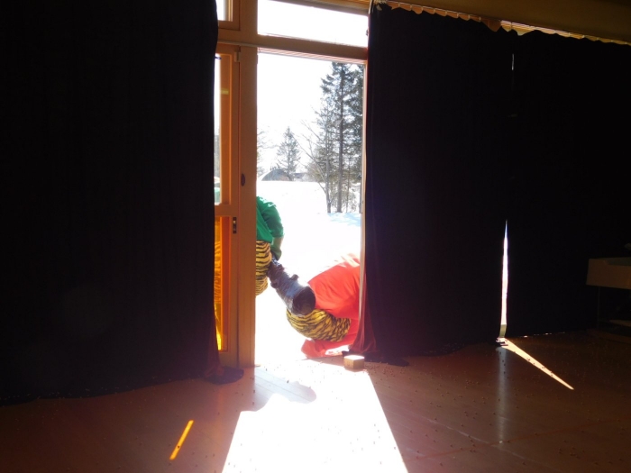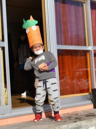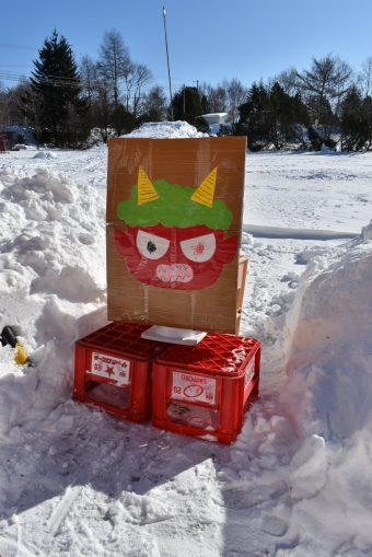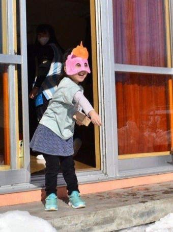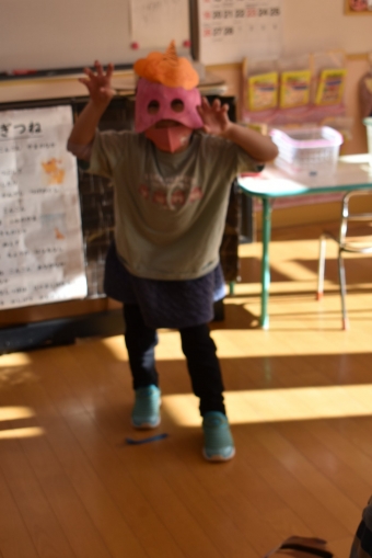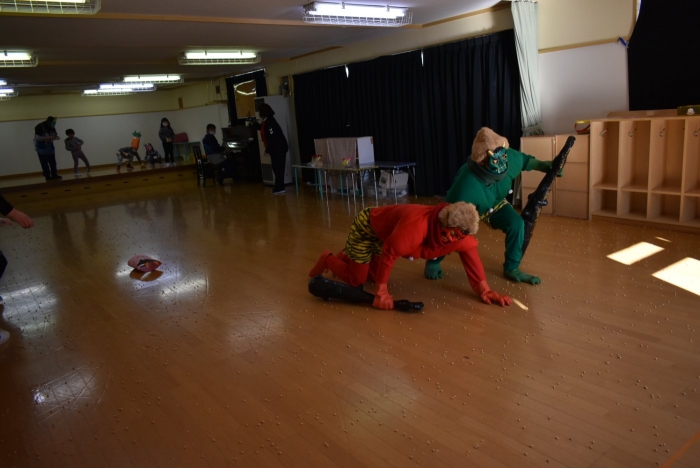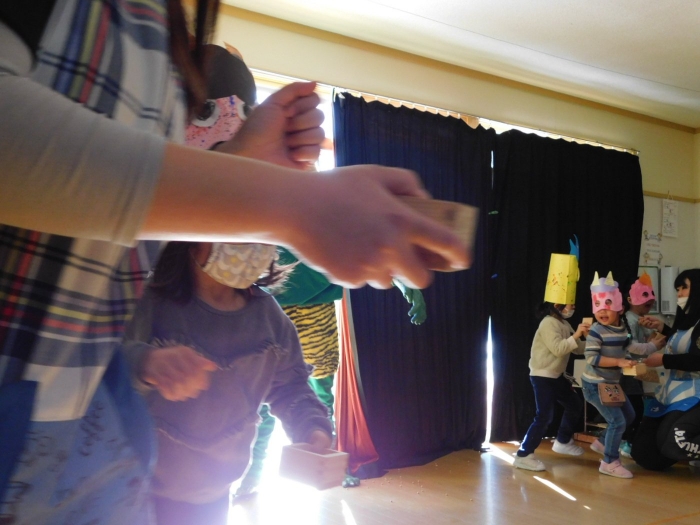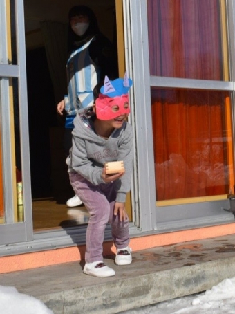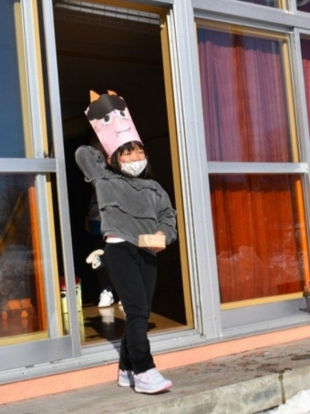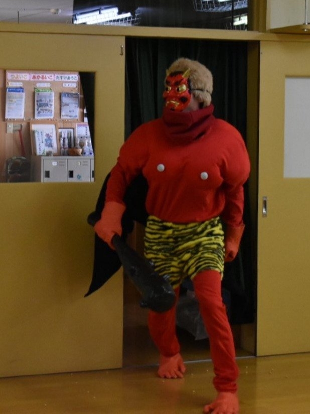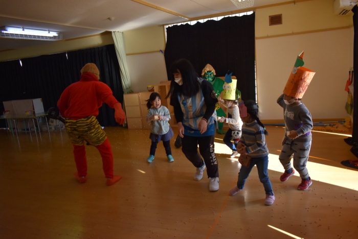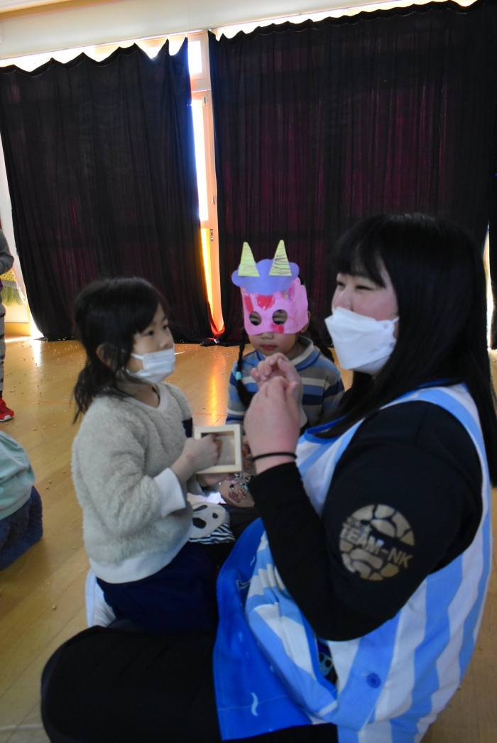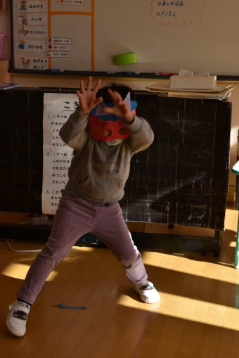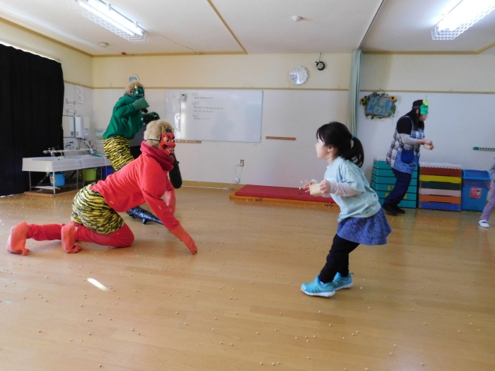 もちろん,今年もオニがやって来ました。豆まきを終えると,突然,怒涛のような太鼓の音と雄叫びが! 一瞬ときが止まり…勢いよく扉が開いたと同時に「悪い子はいねぇかー!!」と赤鬼が乱入! 悲鳴をあげ後ずさると,今度は窓から緑鬼が乱入!! 金棒を叩きつけ大迫力の鬼たちに挟み撃ちされ,この世の終わりのような状態だった子ども達です。泣きながらも,『豆』=『魔滅』の一粒に大きな威力があることを信じ,「鬼は~そと!」と果敢に挑む子が大勢いました。見事,オニを追い払い,頑張った自分を感じながら後片付けをしていた子ども達。その後,少しの物音でもビクッとなっていましたが,清々しい気持ちになったことでしょう!