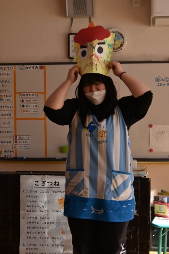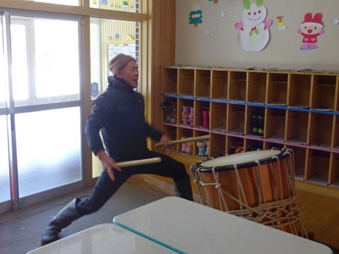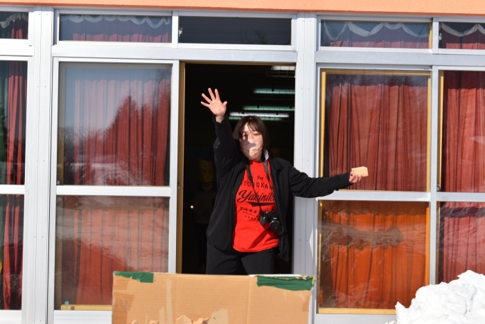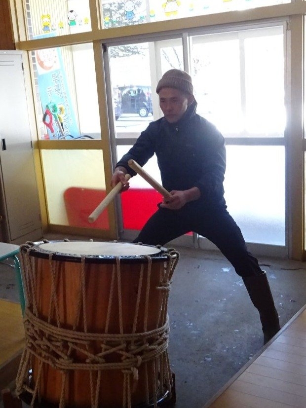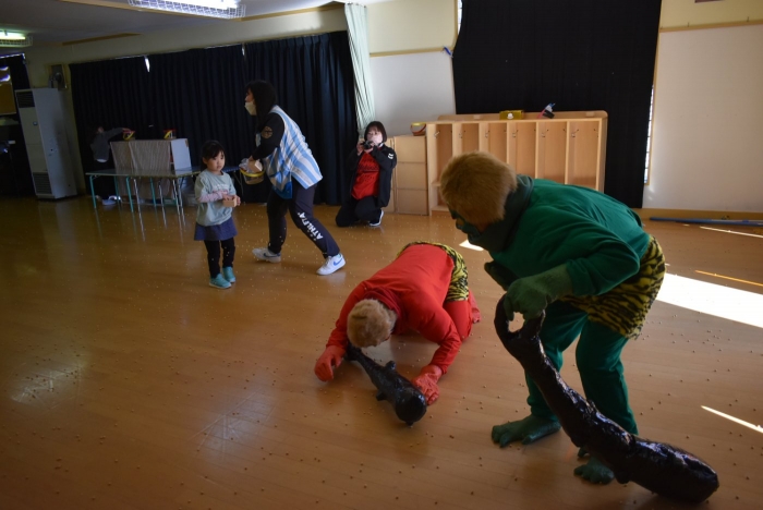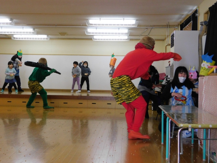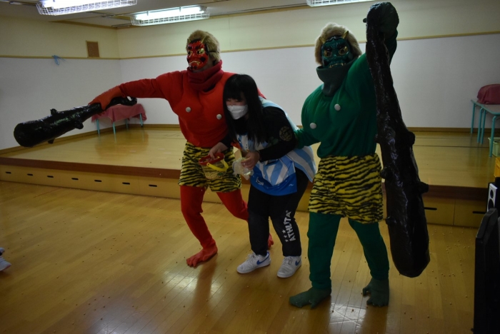 見事な連携プレイ&名演技で豆まき会を盛り立てて!? いただいた音響効果~太鼓の武藤師匠,赤鬼役~ 北村PTA会長,緑鬼役 ~髙橋PTA副会長に,心より感謝申し上げます。